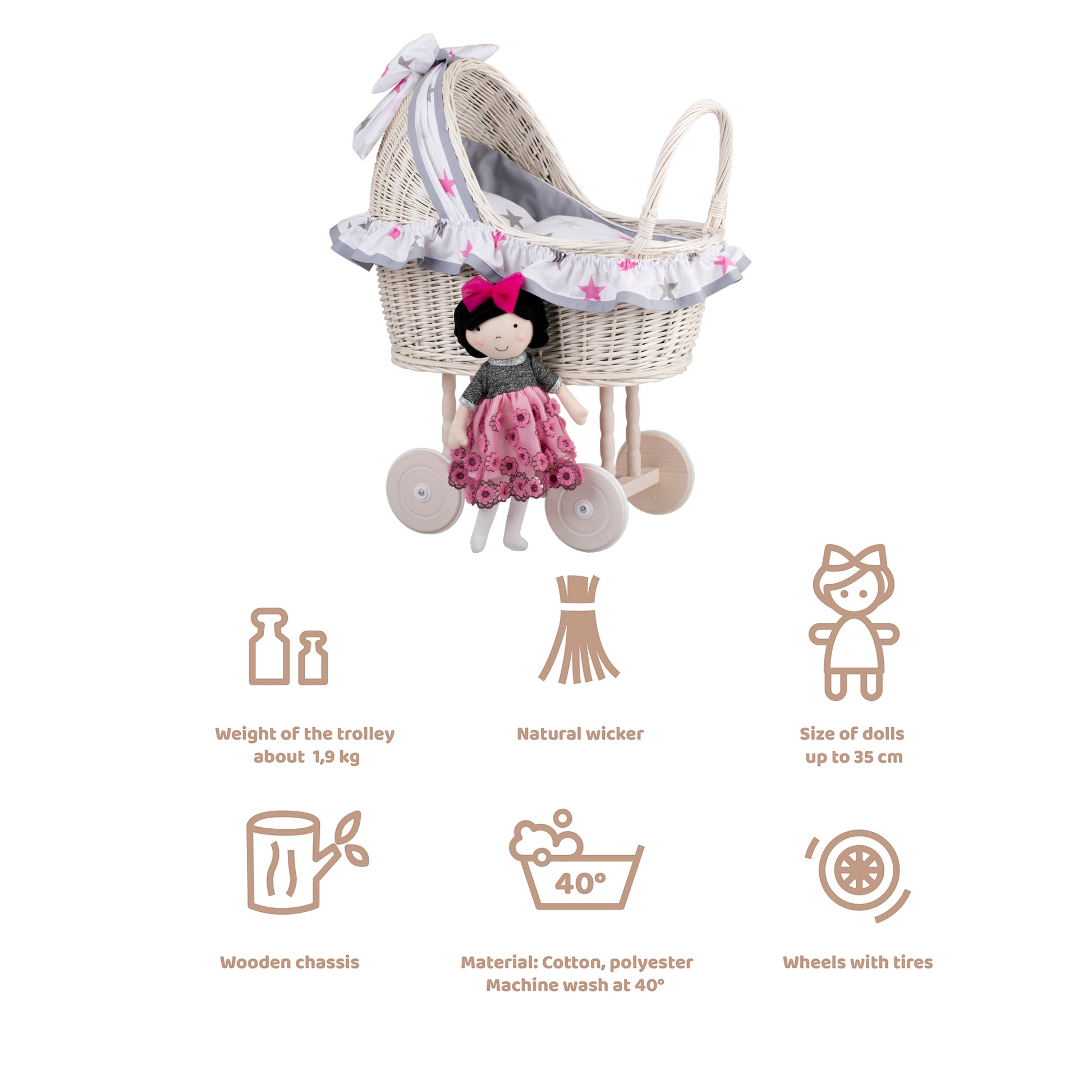 Specyfikacja Twojego Lulu wiklinowy wózek dla lalek z szarym obszyciem, kołderką i poduszką TheWickerStories