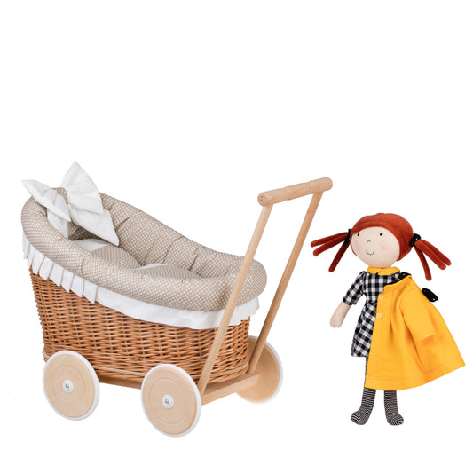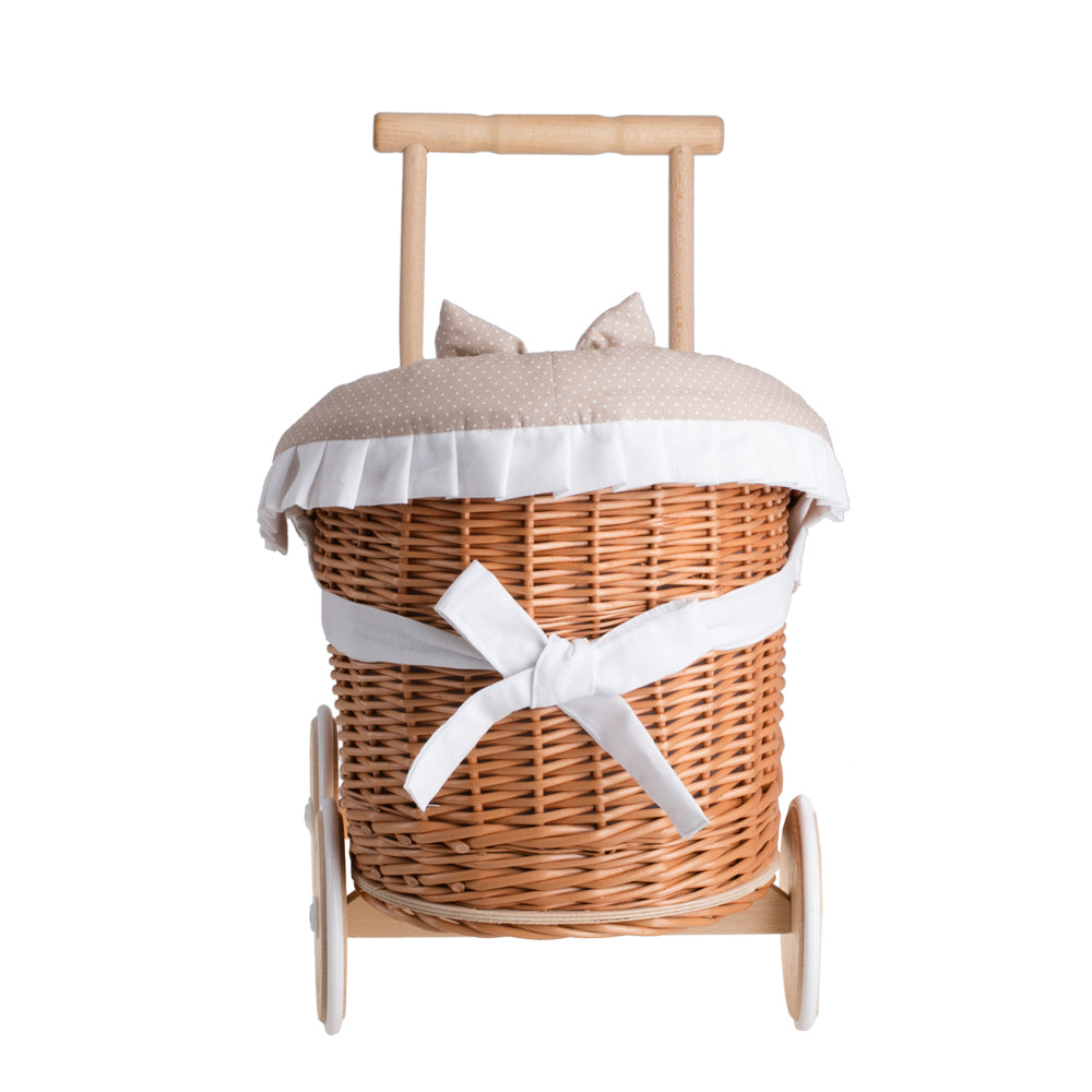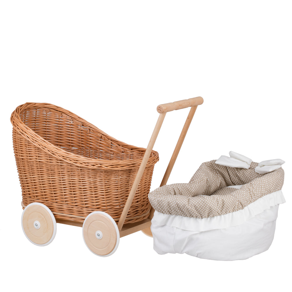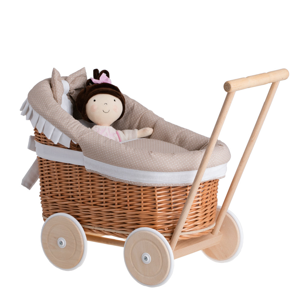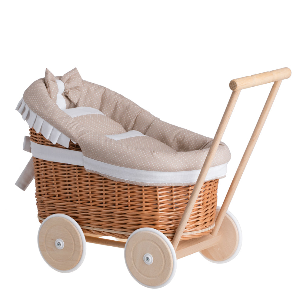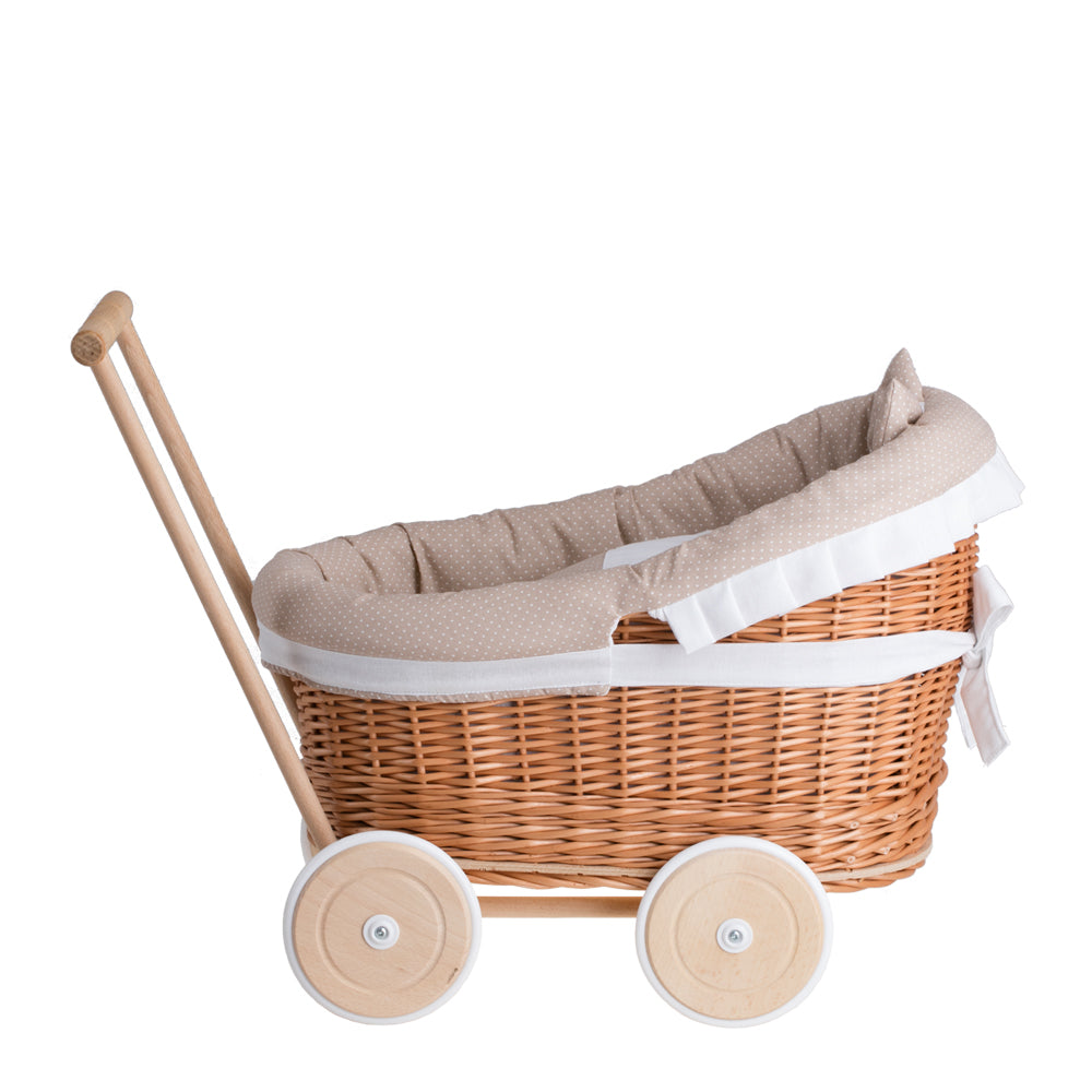 Luna wiklinowy wózek dla lalek z beżowym obszyciem, kołderką i poduszką TheWickerStories