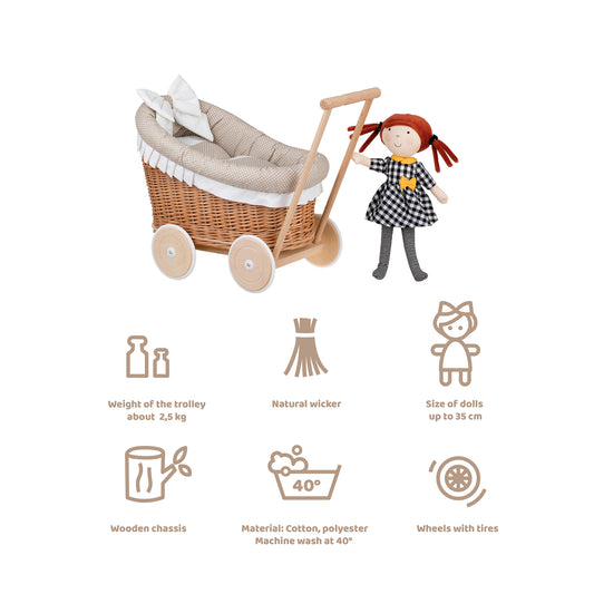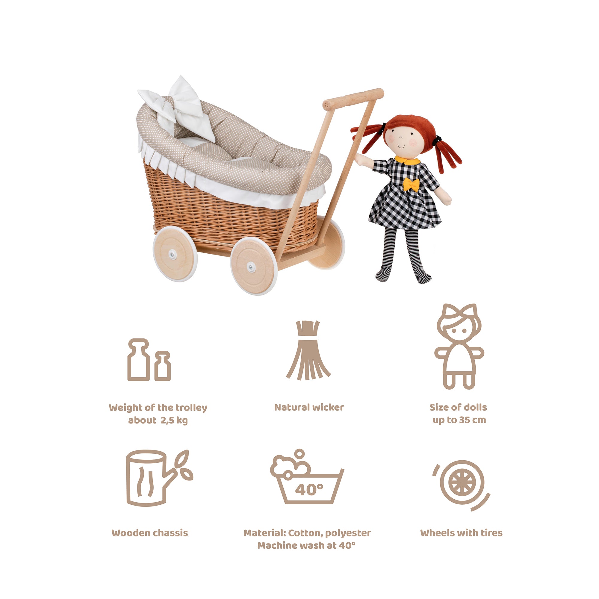 Specyfikacja Twojego Luna wiklinowy wózek dla lalek z beżowym obszyciem, kołderką i poduszką TheWickerStories