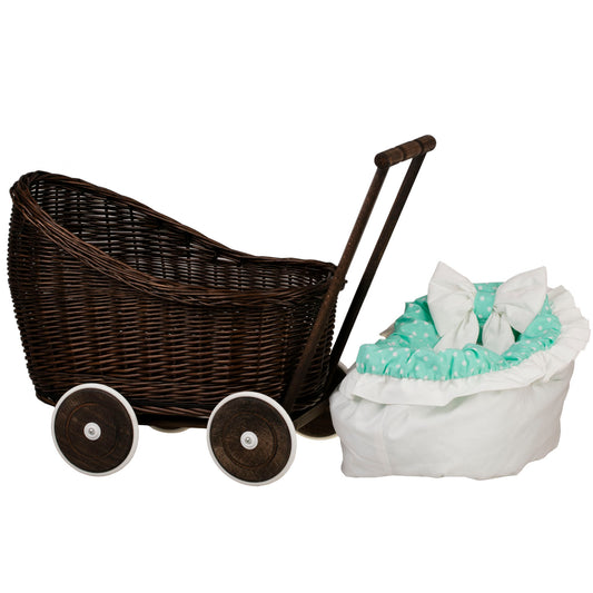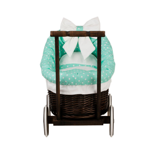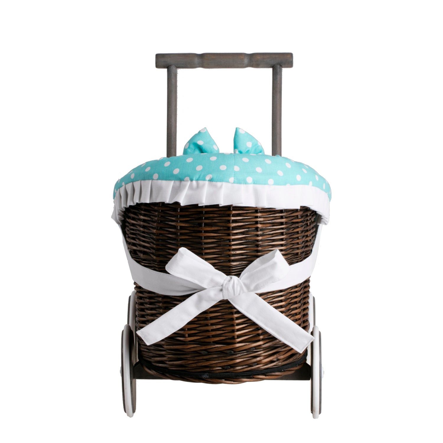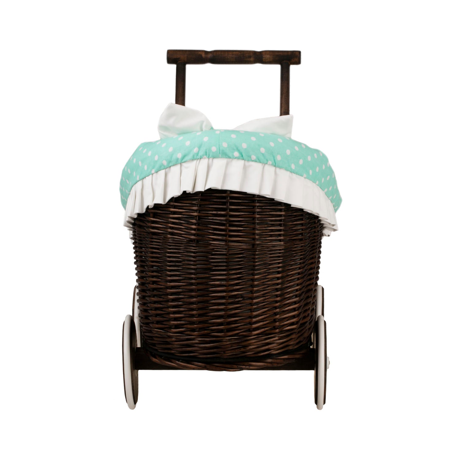 Luna wiklinowy wózek dla lalek z miętowym obszyciem, kołderką i poduszką TheWickerStories