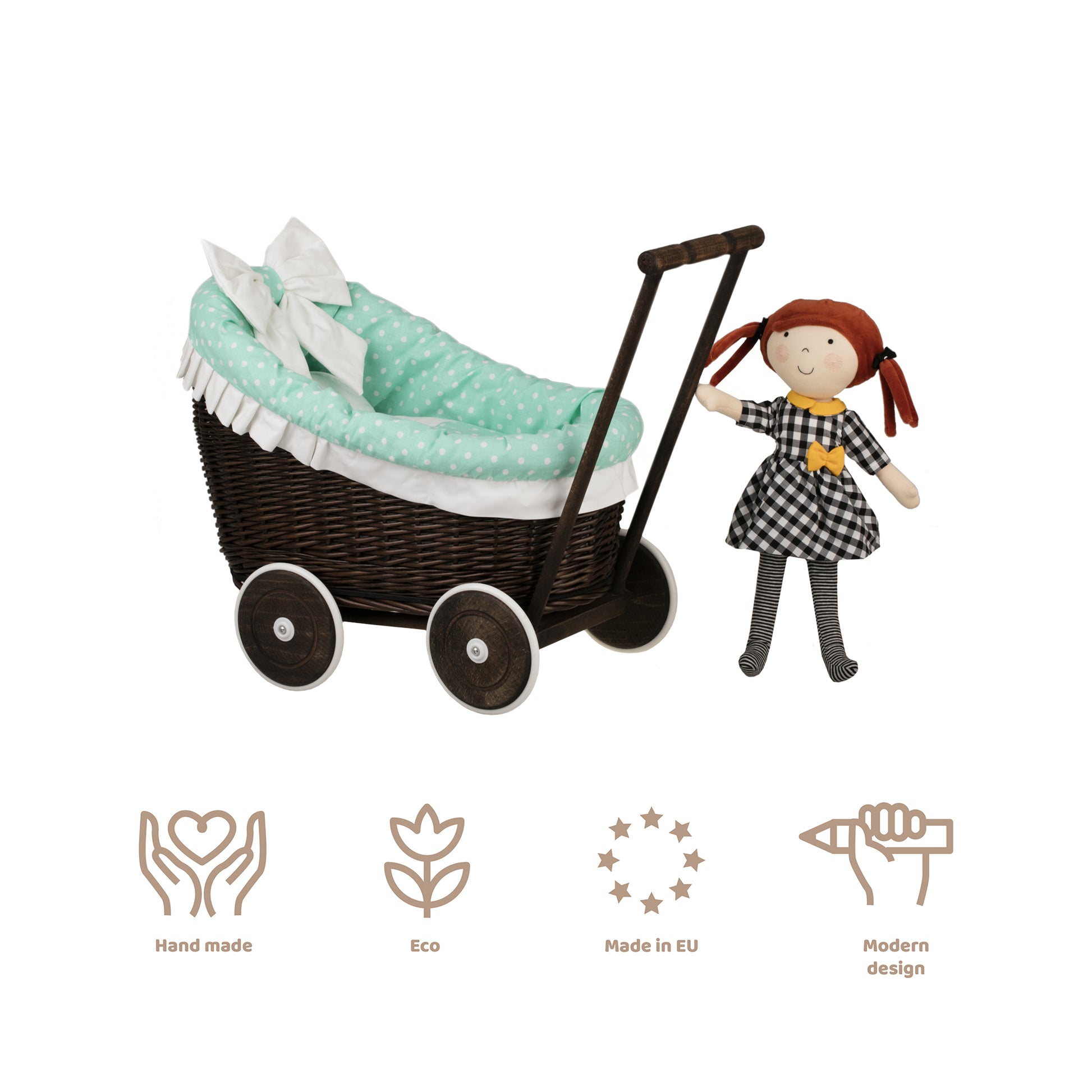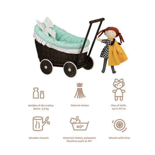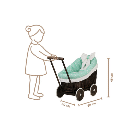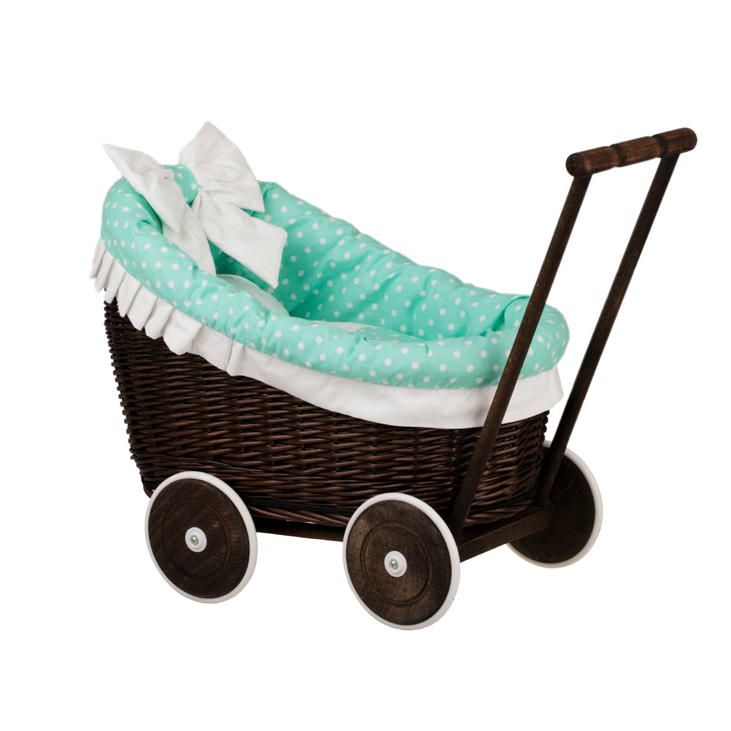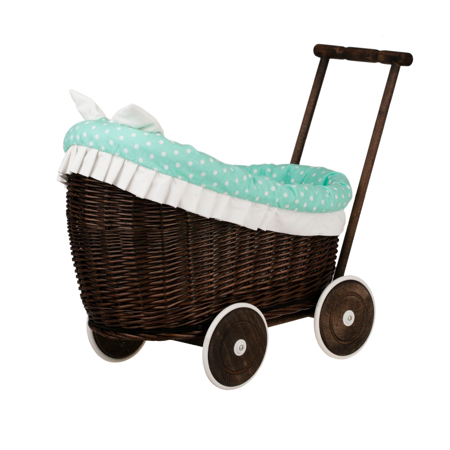 Luna wiklinowy wózek dla lalek z miętowym obszyciem, kołderką i poduszką TheWickerStories