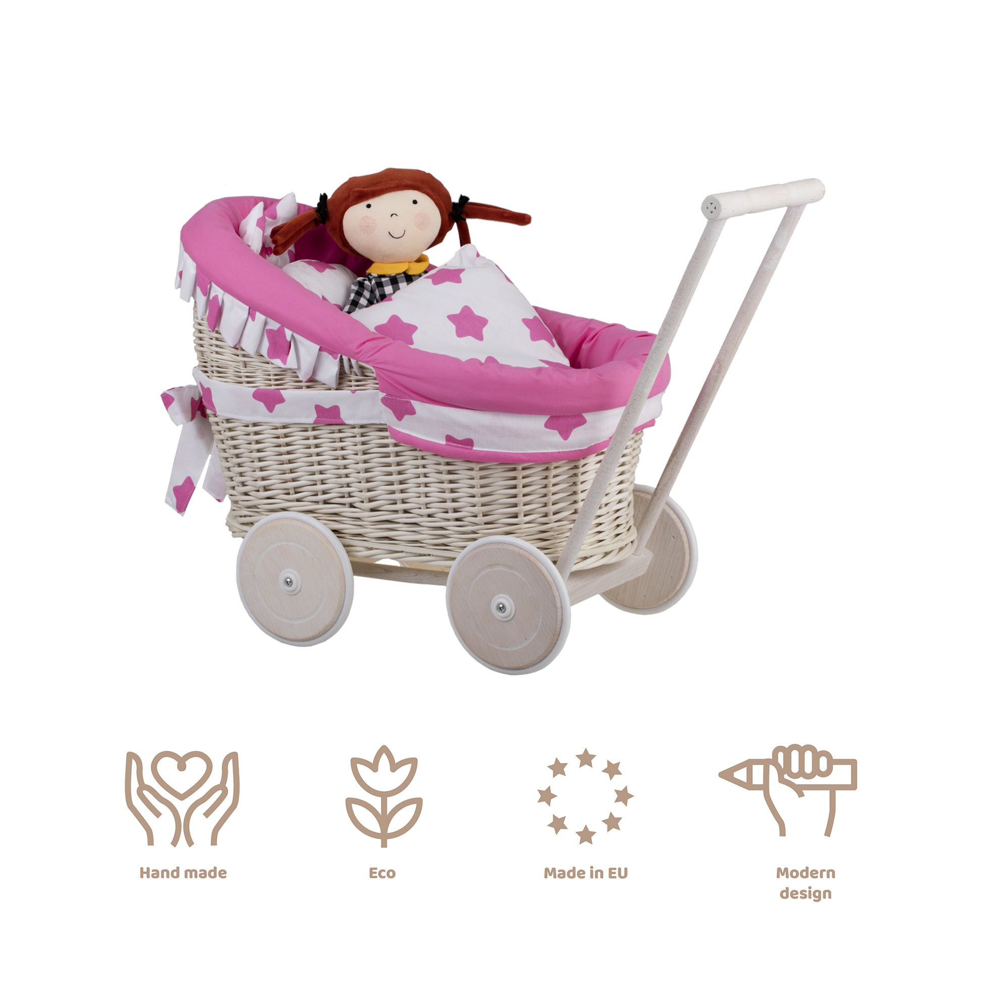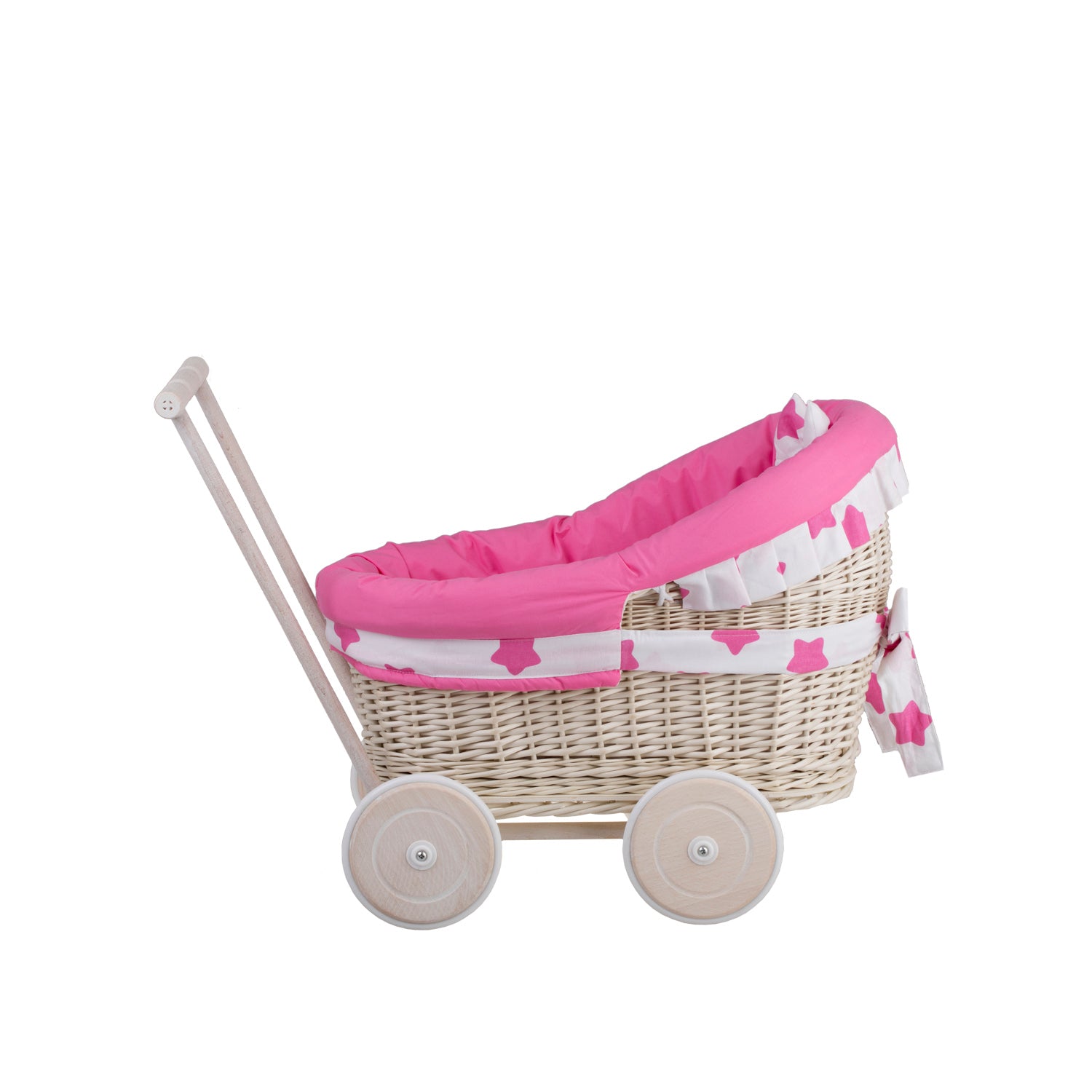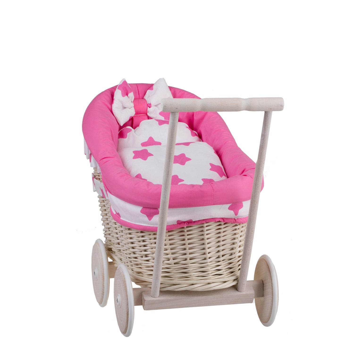 Luna wiklinowy wózek dla lalek z różowym obszyciem, kołderką i poduszką TheWickerStories