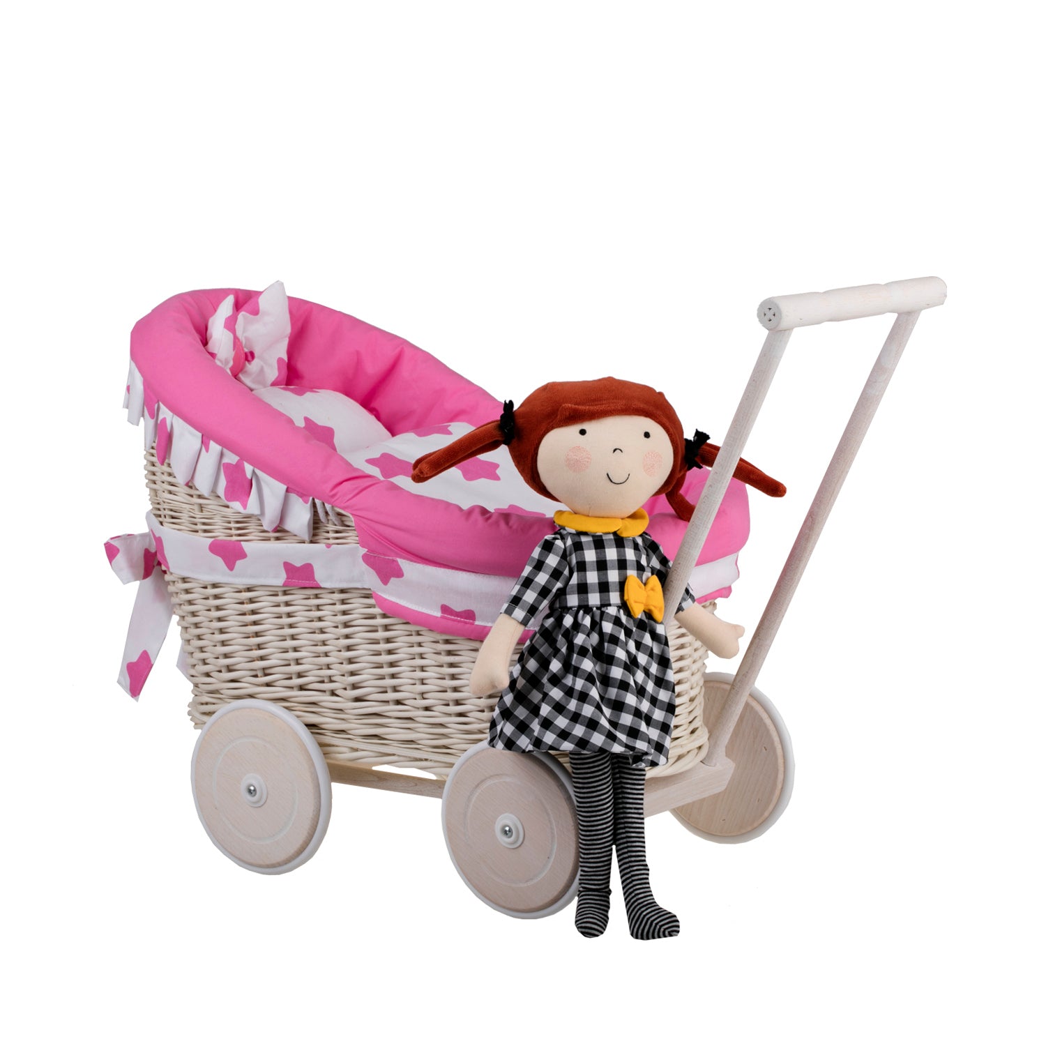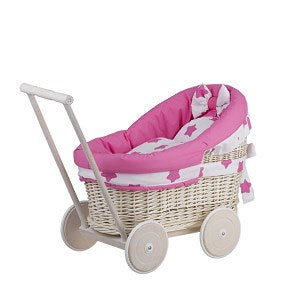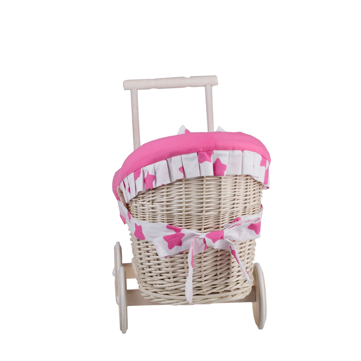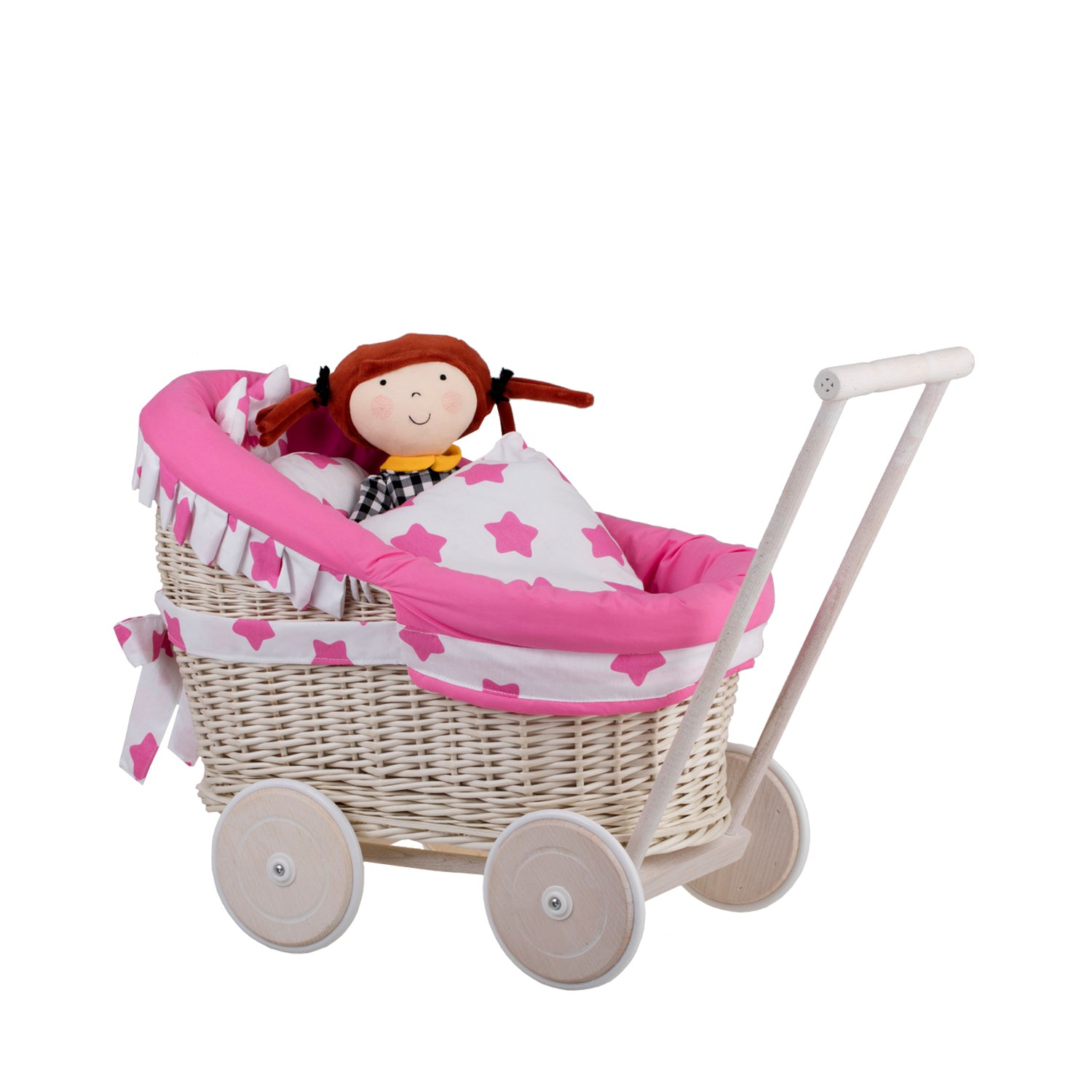 Luna wiklinowy wózek dla lalek z różowym obszyciem, kołderką i poduszką TheWickerStories