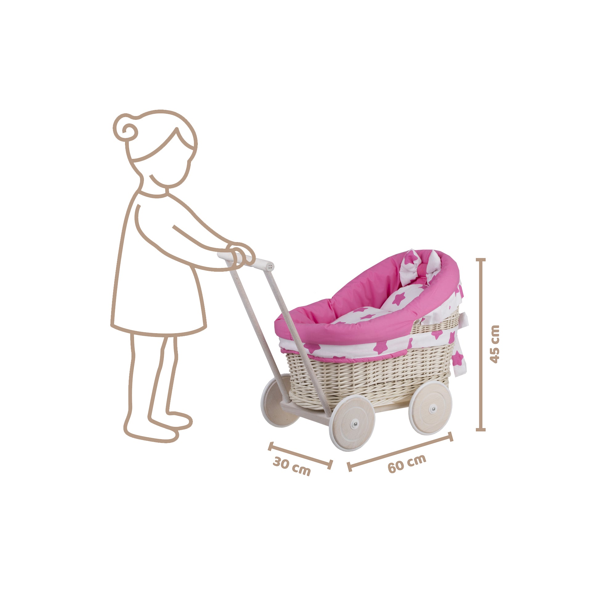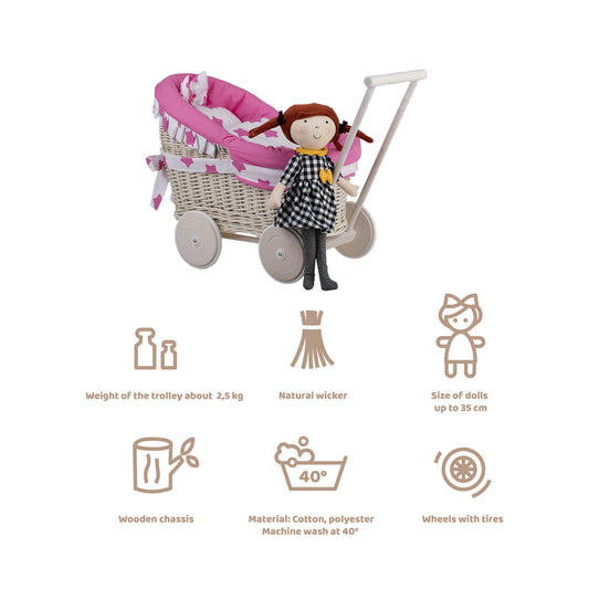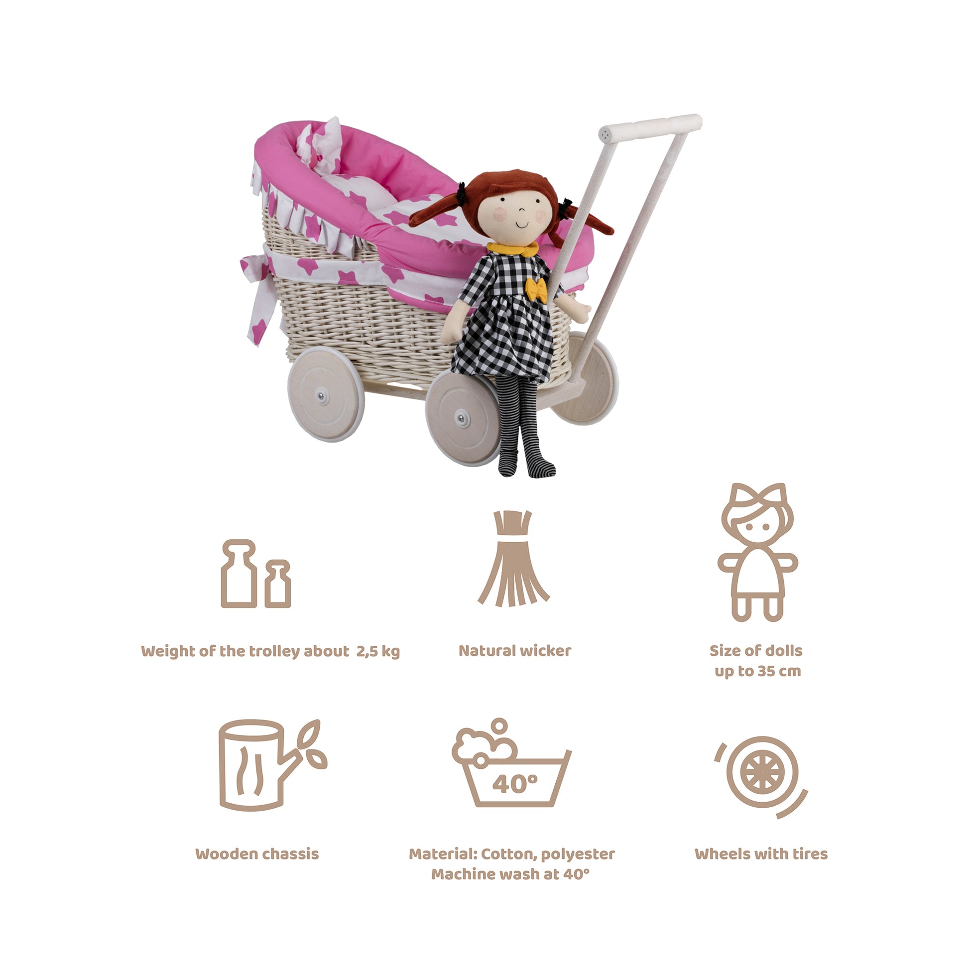 Specyfikacja Twojego Luna wiklinowy wózek dla lalek z różowym obszyciem, kołderką i poduszką TheWickerStories