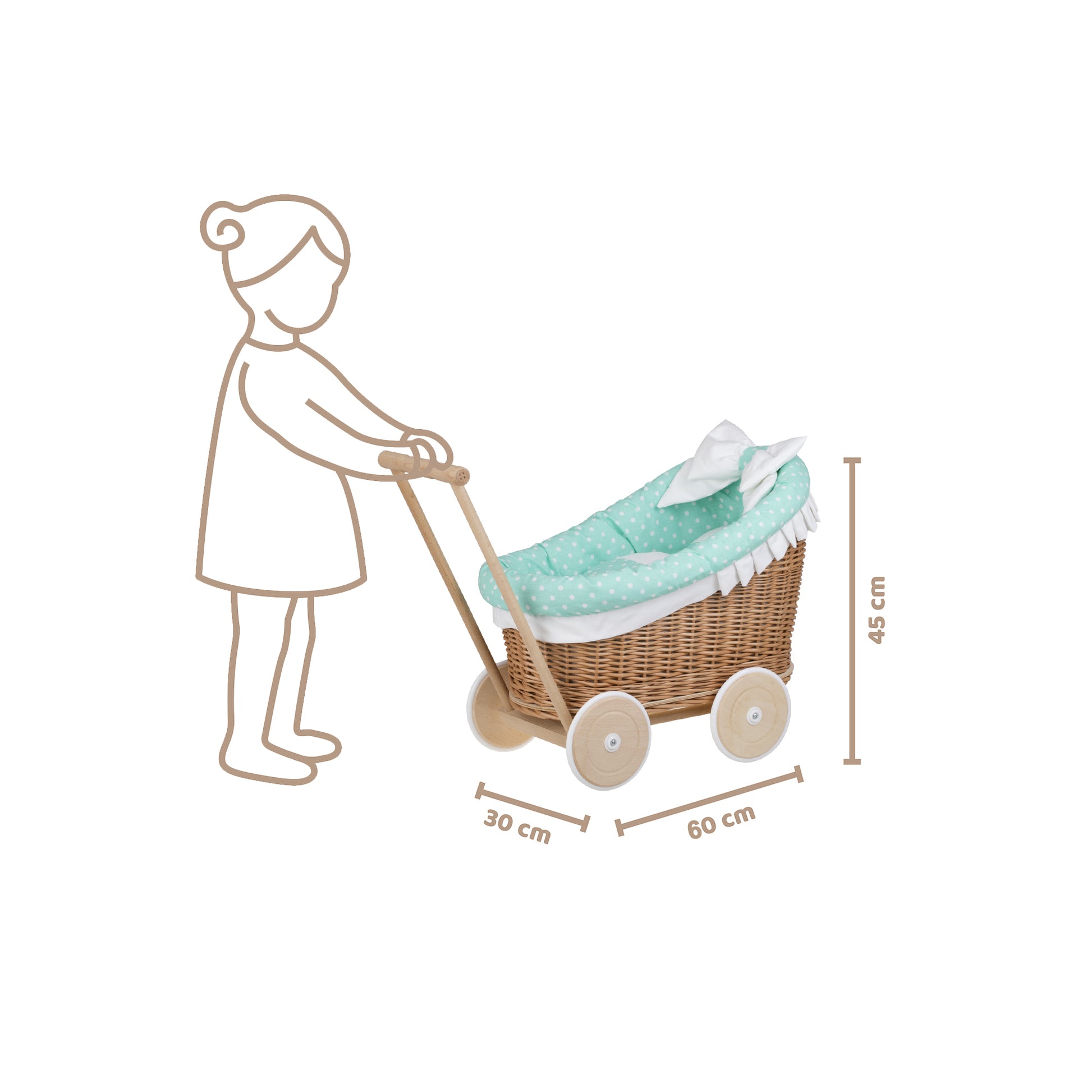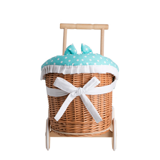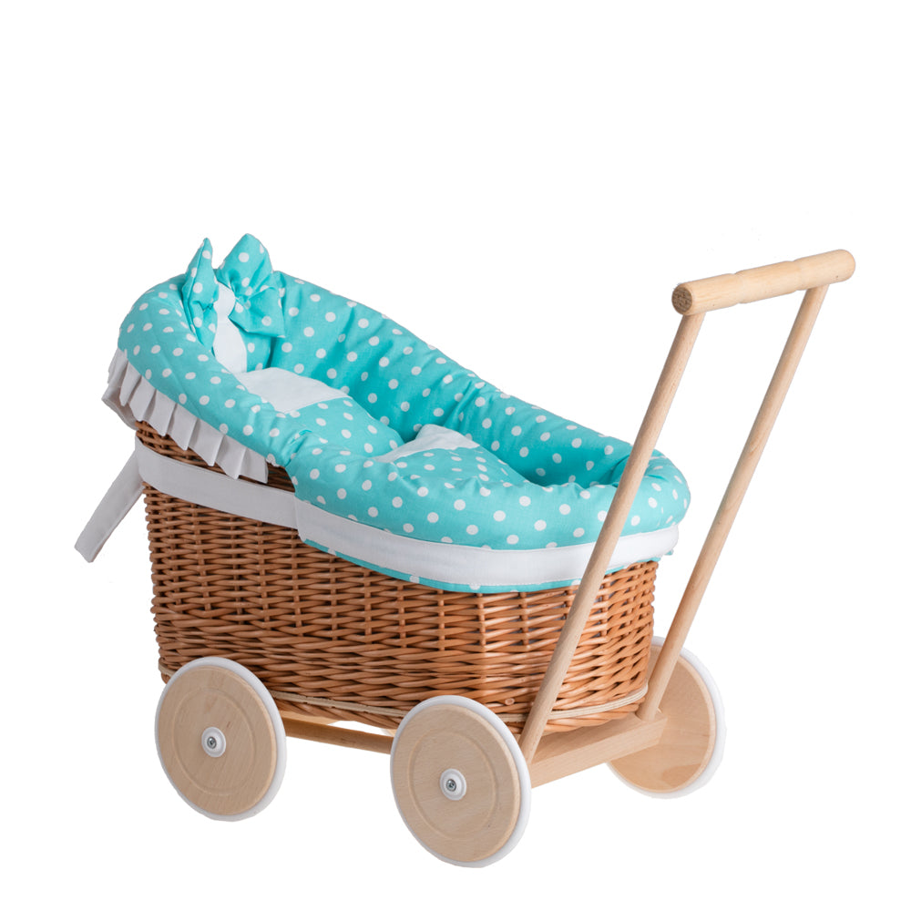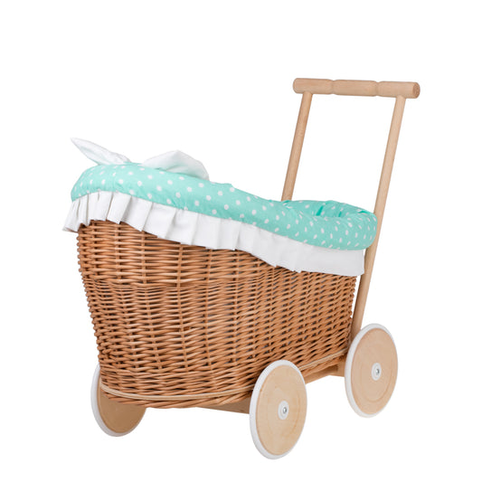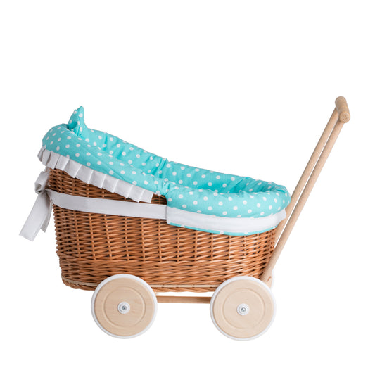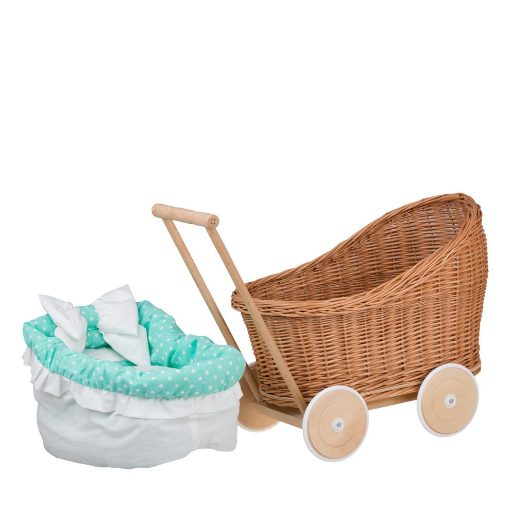 Luna wiklinowy wózek dla lalek z zielonym obszyciem, kołderką i poduszką TheWickerStories