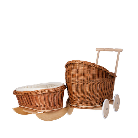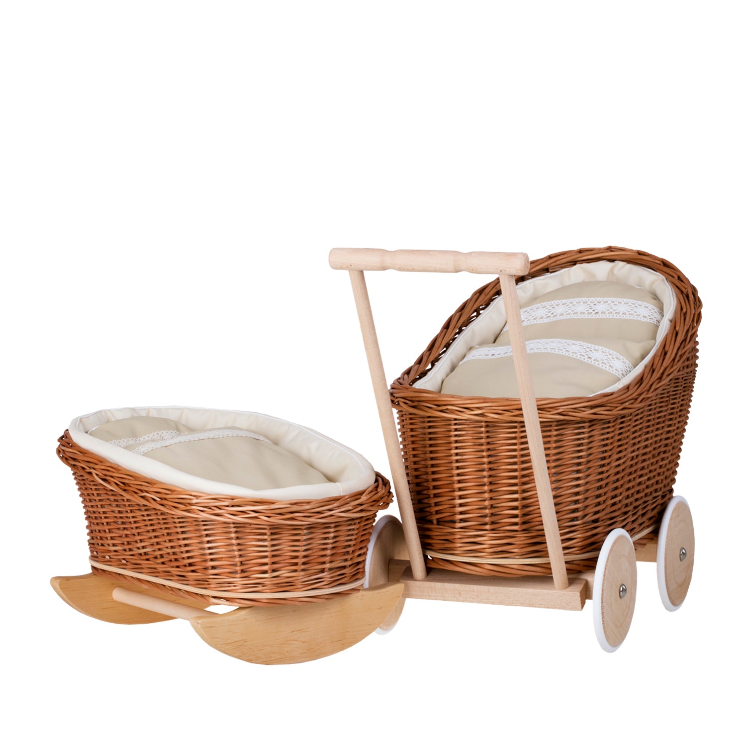 Luna wiklinowy wózek i kołyska dla lalek z beżowym obszyciem, kołderką i poduszką TheWickerStories