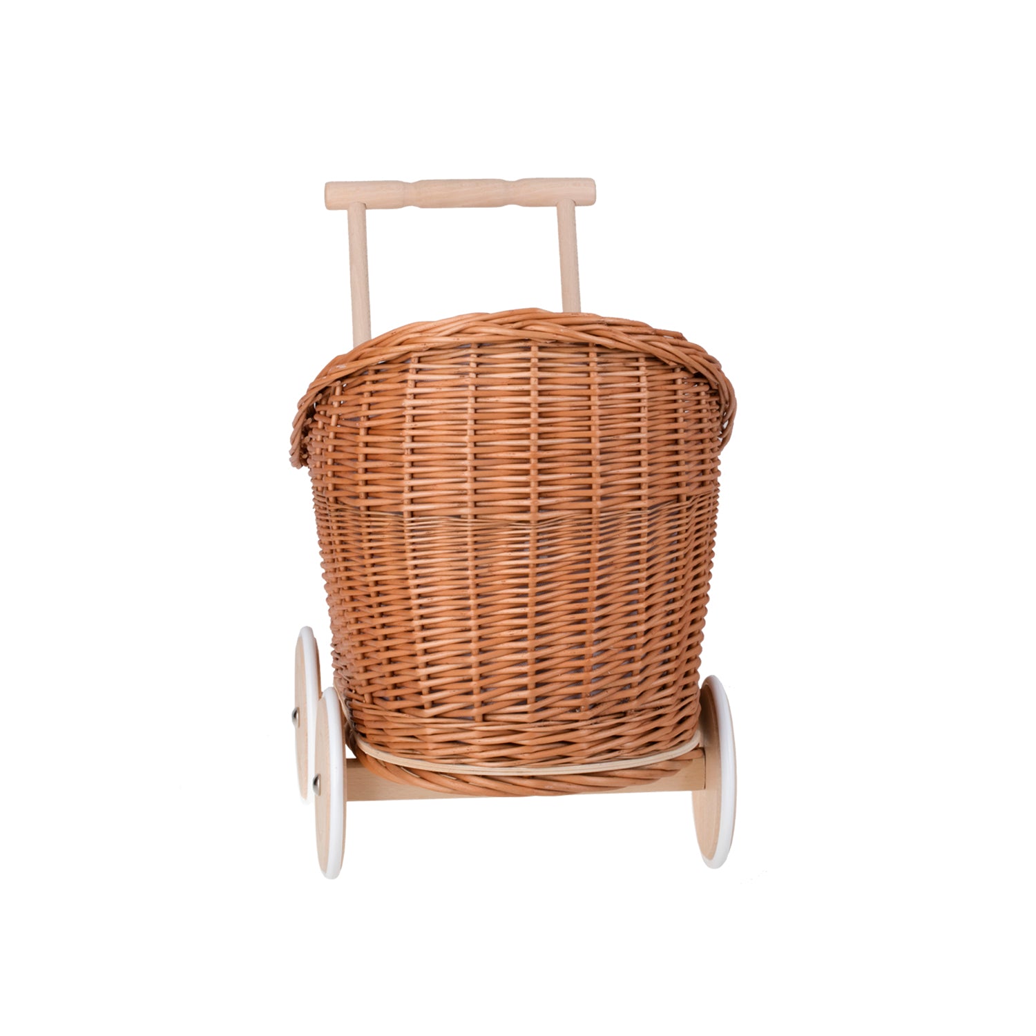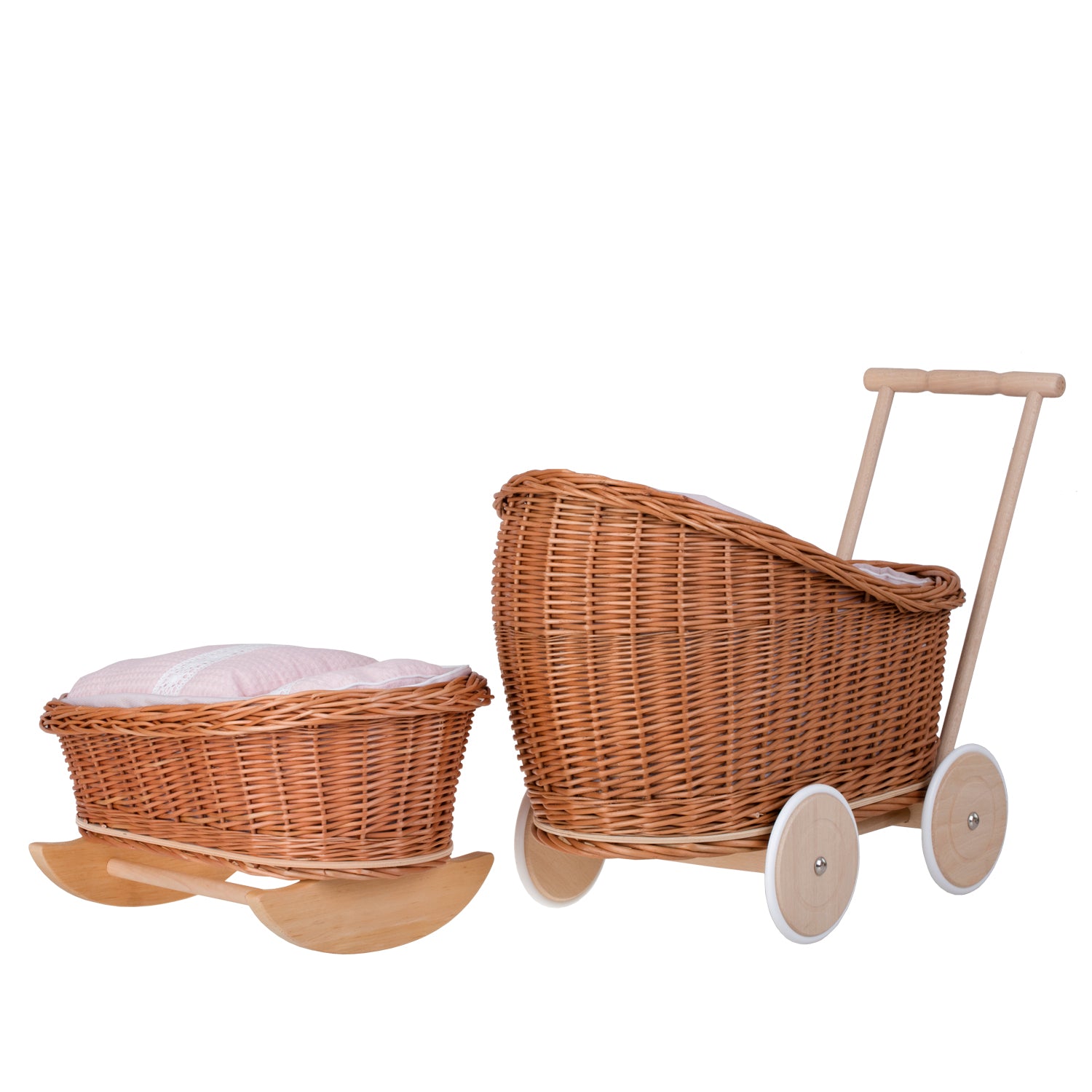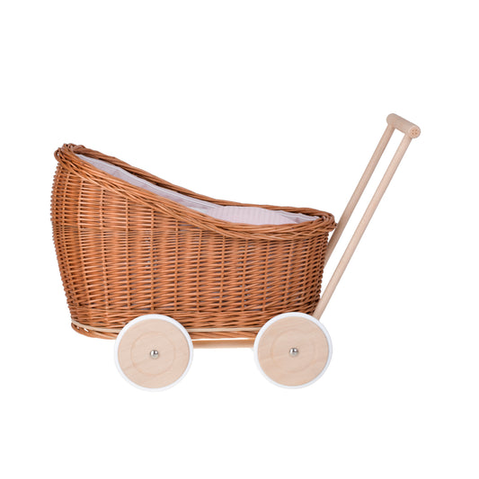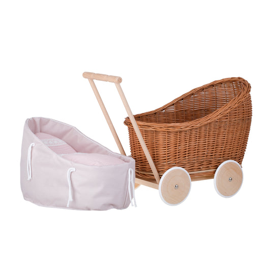Luna wiklinowy wózek i kołyska dla lalek z różowym obszyciem, kołderką i poduszką TheWickerStories