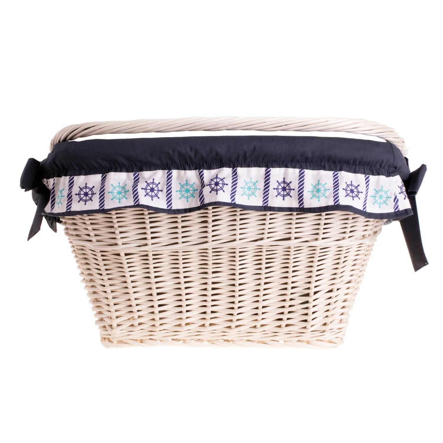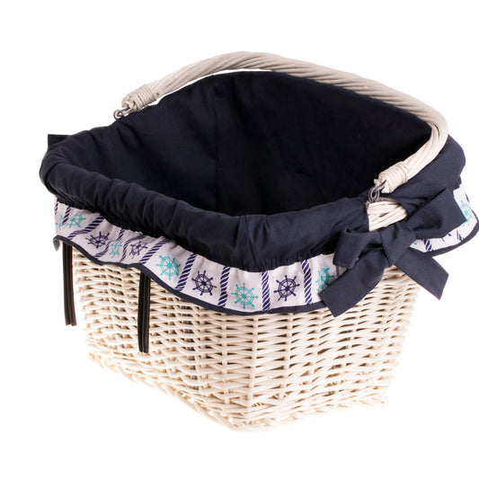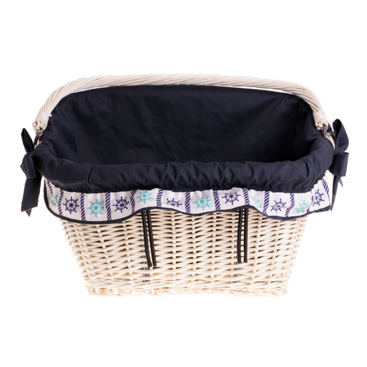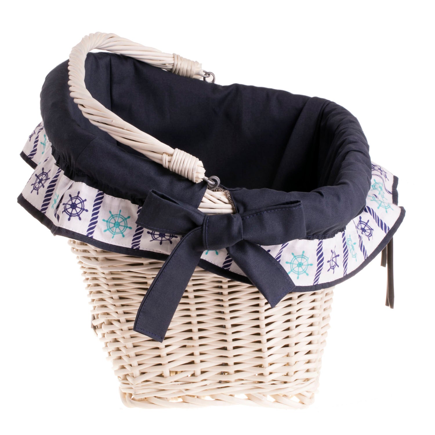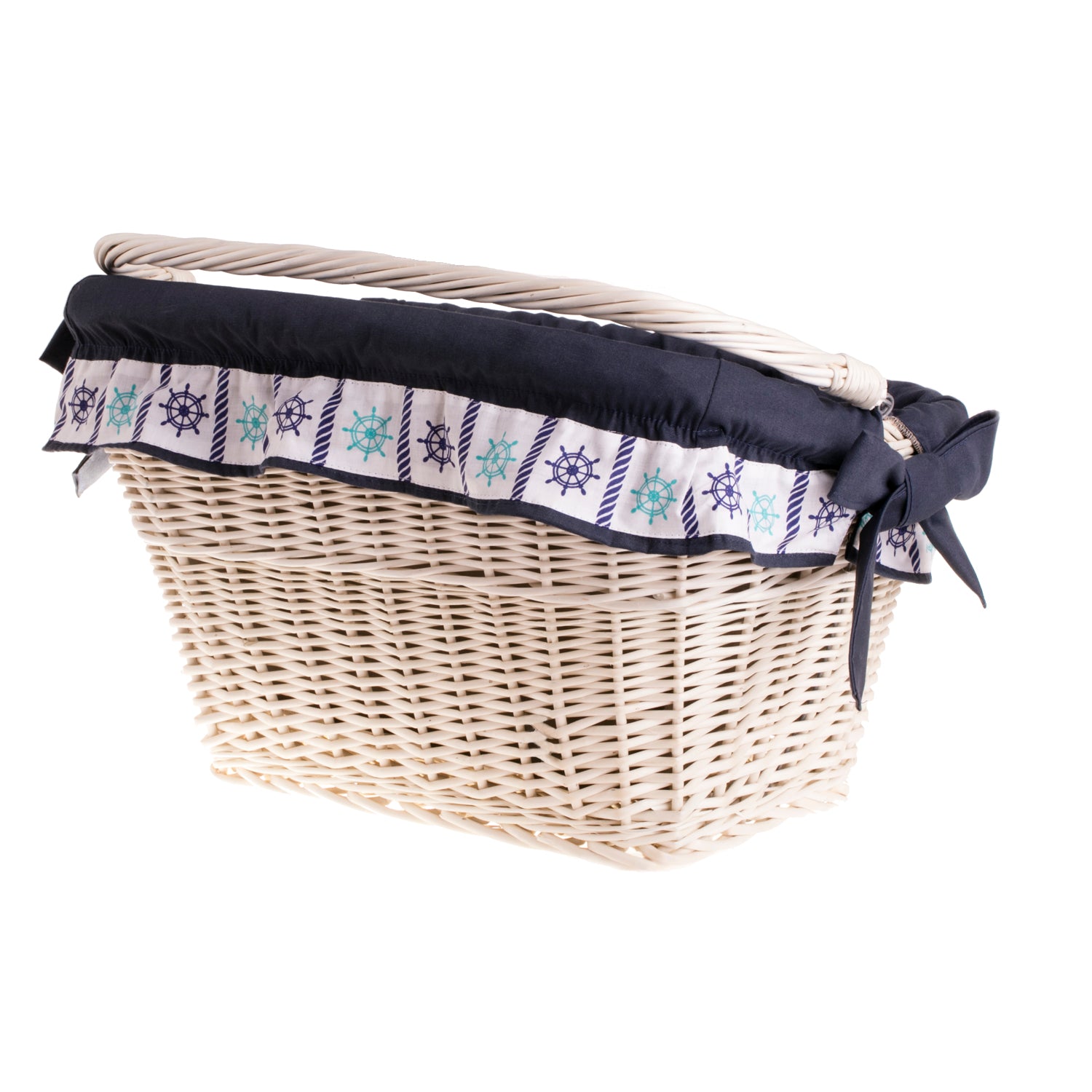 Klasyczny wiklinowy kosz na kierownicę w jasnym odcieniu wikliny przyciąga wzrok gęstym, równym splotem. Ma stabilną, plecioną rączkę do wygodnego przenoszenia oraz miękkie, granatowe obszycie z bawełny, wykończone falbaną i wiązaniami. Szeroki wlot ułatwia pakowanie, a zaokrąglone obrzeże jest przyjemne dla dłoni.