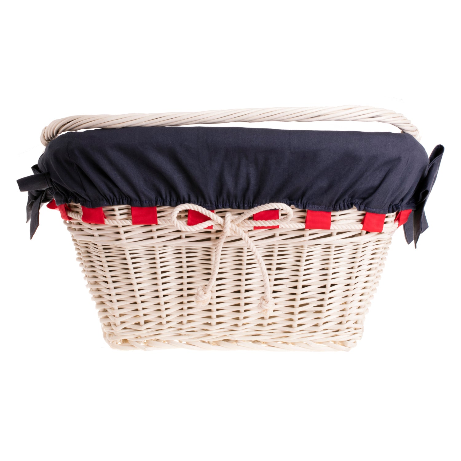 Magnus wiklinowy kosz na rower z granatowym obszyciem, z rączką i kokardami TheWickerStories