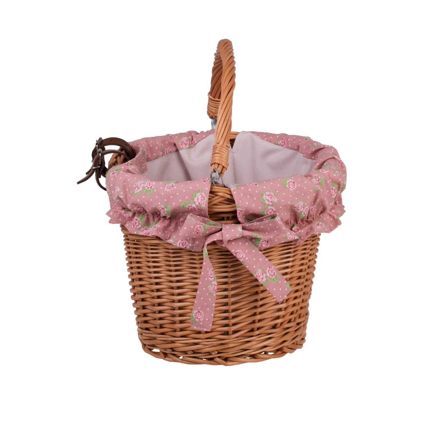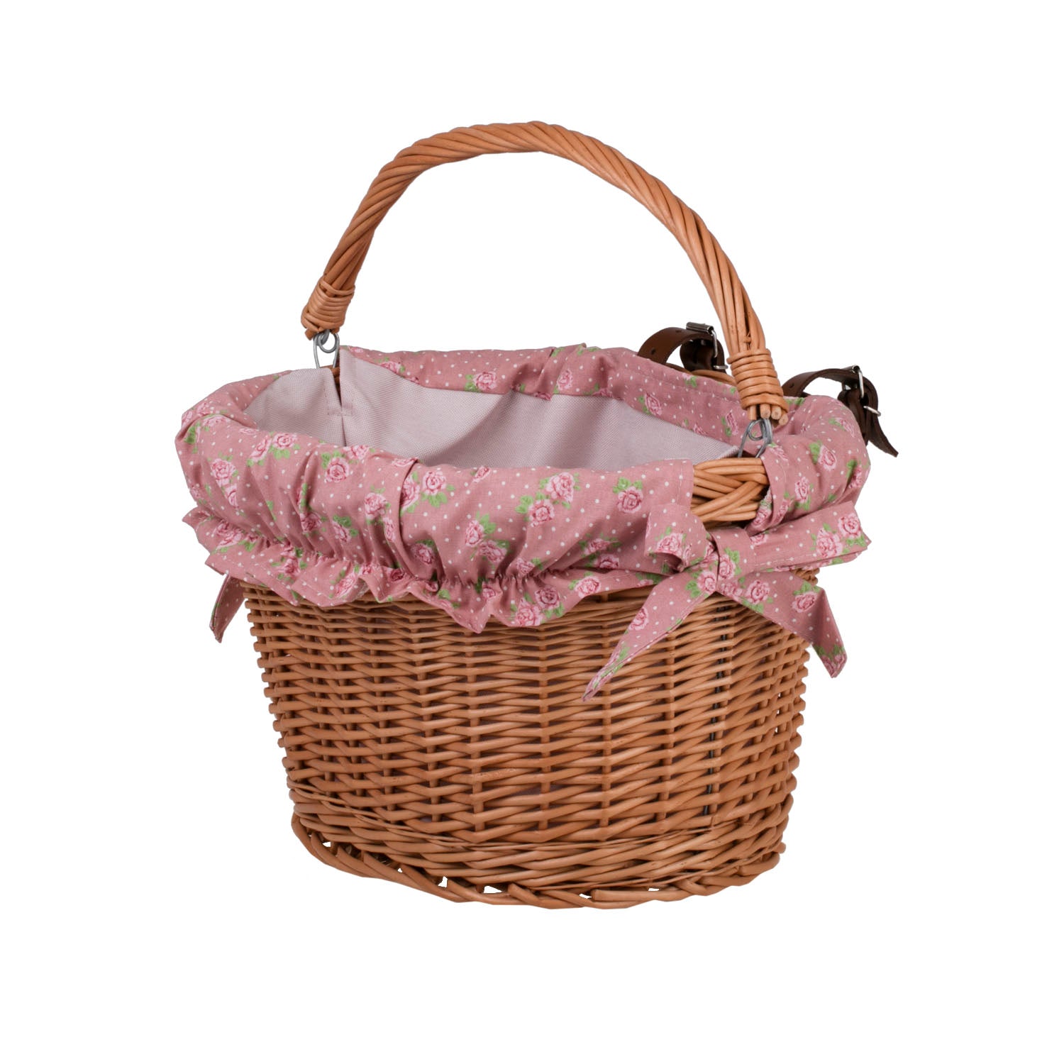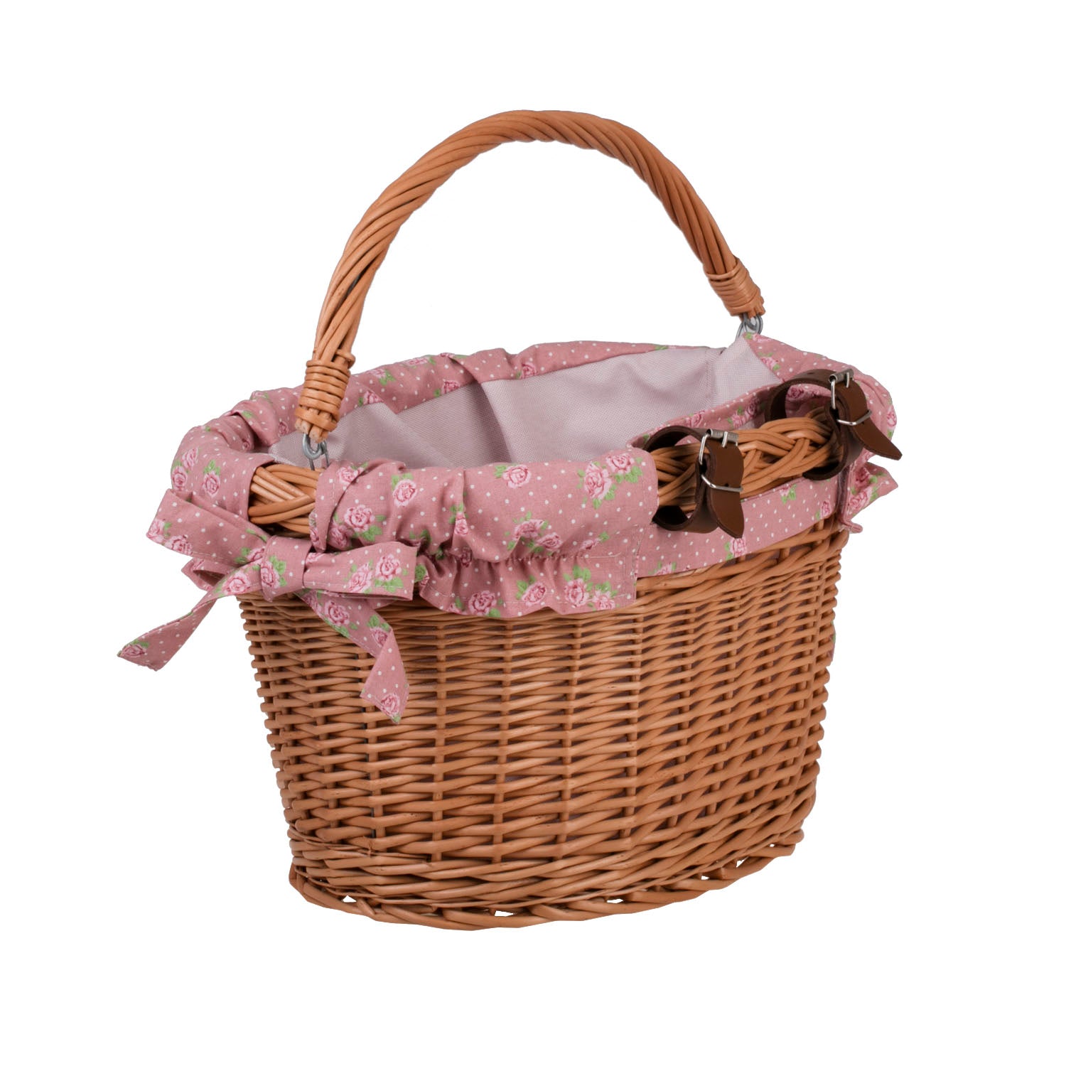 Specyfikacja Twojego Magnus wiklinowy kosz na rower z różowym obszyciem, z rączką i paskami do kierownicy TheWickerStories