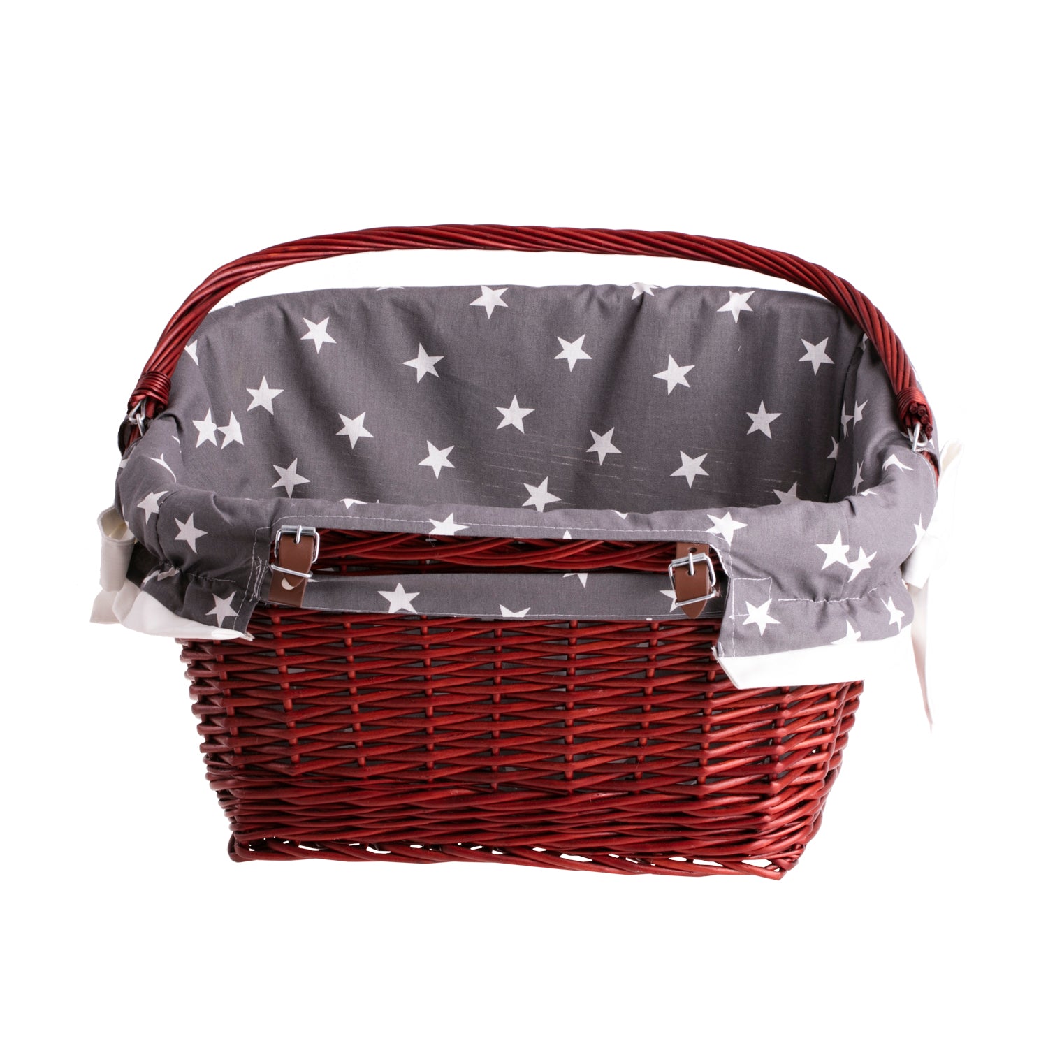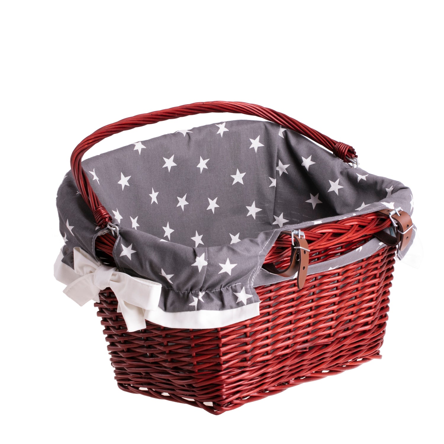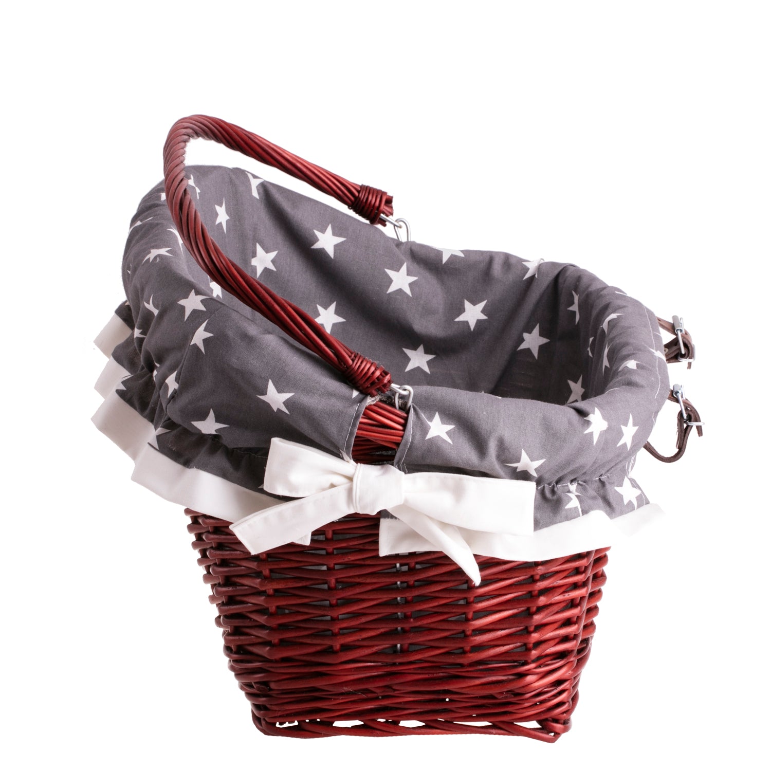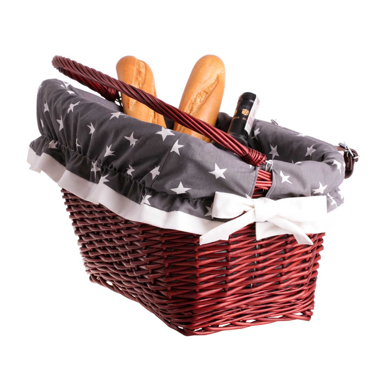 Magnus wiklinowy kosz na rower z szarym obszyciem, z rączką i paskami TheWickerStories