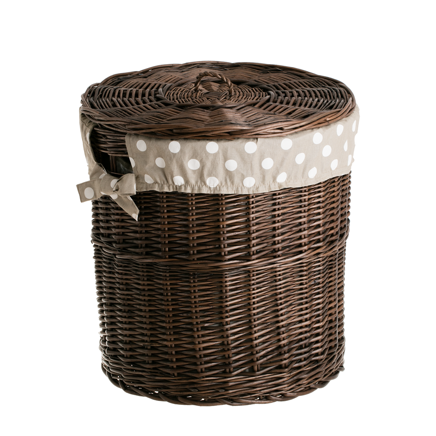 Elegancki wiklinowy kosz na pranie w odcieniu ciemnego brązu zachwyca klasycznym, ponadczasowym wyglądem. Okrągła linia ścian i gęsty, równy splot tworzą solidną bryłę o uporządkowanej strukturze, a delikatnie satynowe wybarwienie podkreśla rysunek wikliny. Górę wykańcza wyjmowane, kremowe obszycie z materiałową lamówką, które wprowadza miękki akcent. Dopasowana pokrywa z plecionym uchwytem stabilnie spoczywa na rancie, estetycznie zasłaniając zawartość.