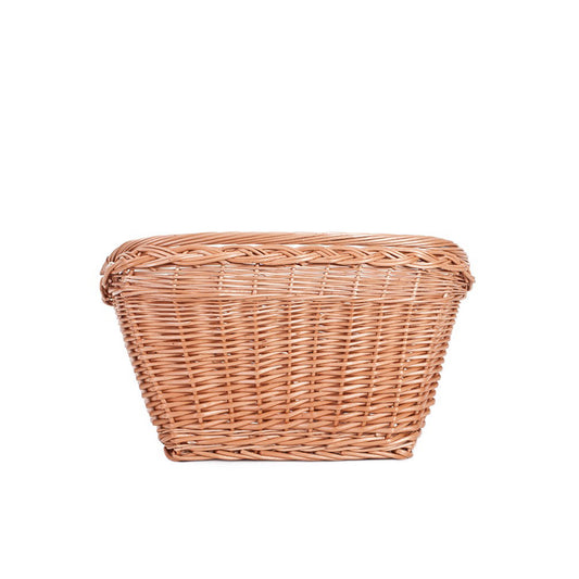 Wiklinowy kosz na kierownicę zachwyca naturalnym, miodowym odcieniem (honiggelb) i starannym splotem pełnej wikliny. Górny rant zdobi podwójny, dekoracyjny warkocz, który dodatkowo usztywnia konstrukcję i podkreśla retro charakter. Po bokach znajdują się dwa stalowe haki z osłoną z tworzywa, a wewnątrz ukryto wygodny uchwyt do przenoszenia. Profil kosza lekko rozszerza się ku górze, co ułatwia pakowanie i pomaga utrzymać zawartość na swoim miejscu podczas jazdy.