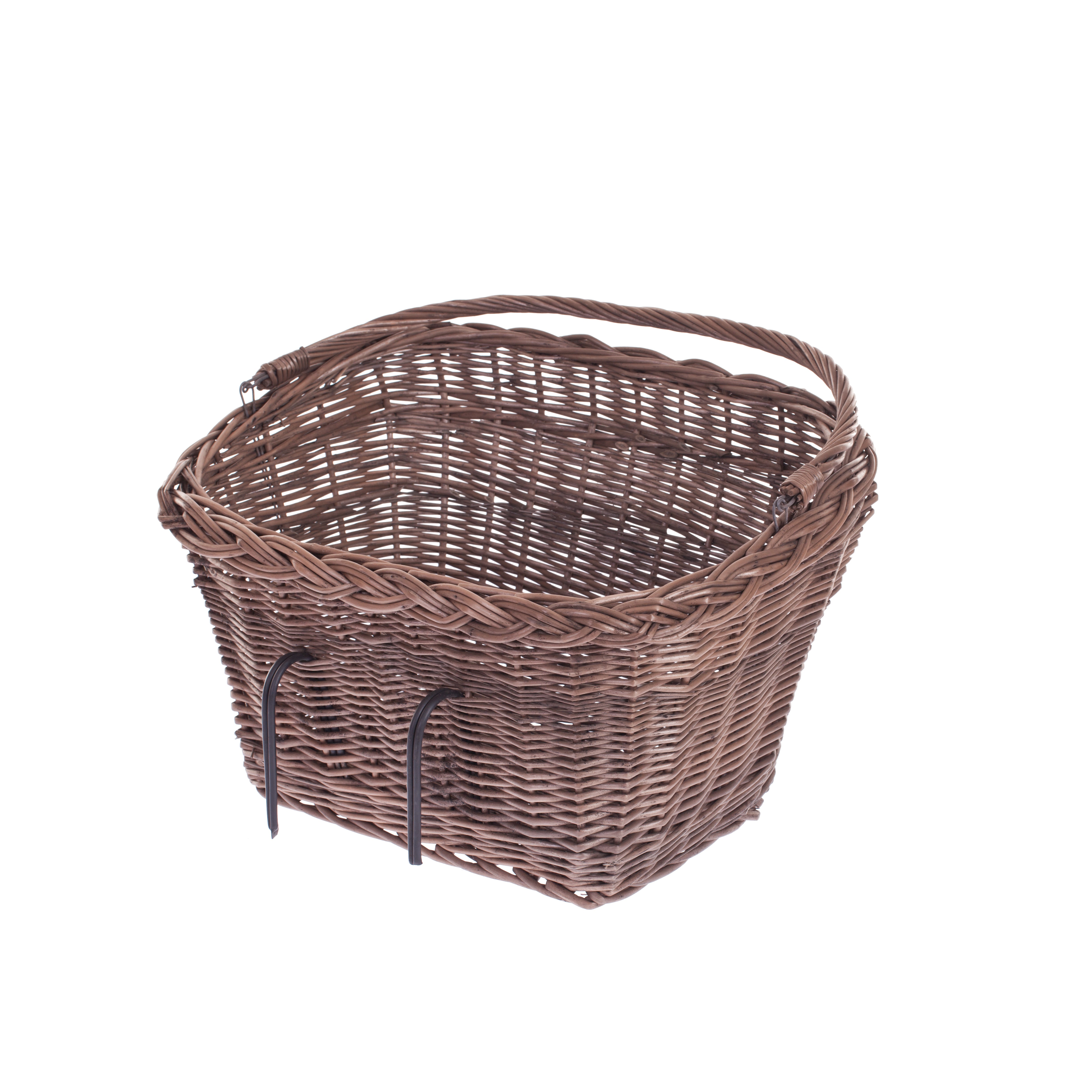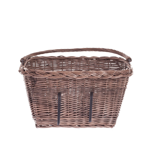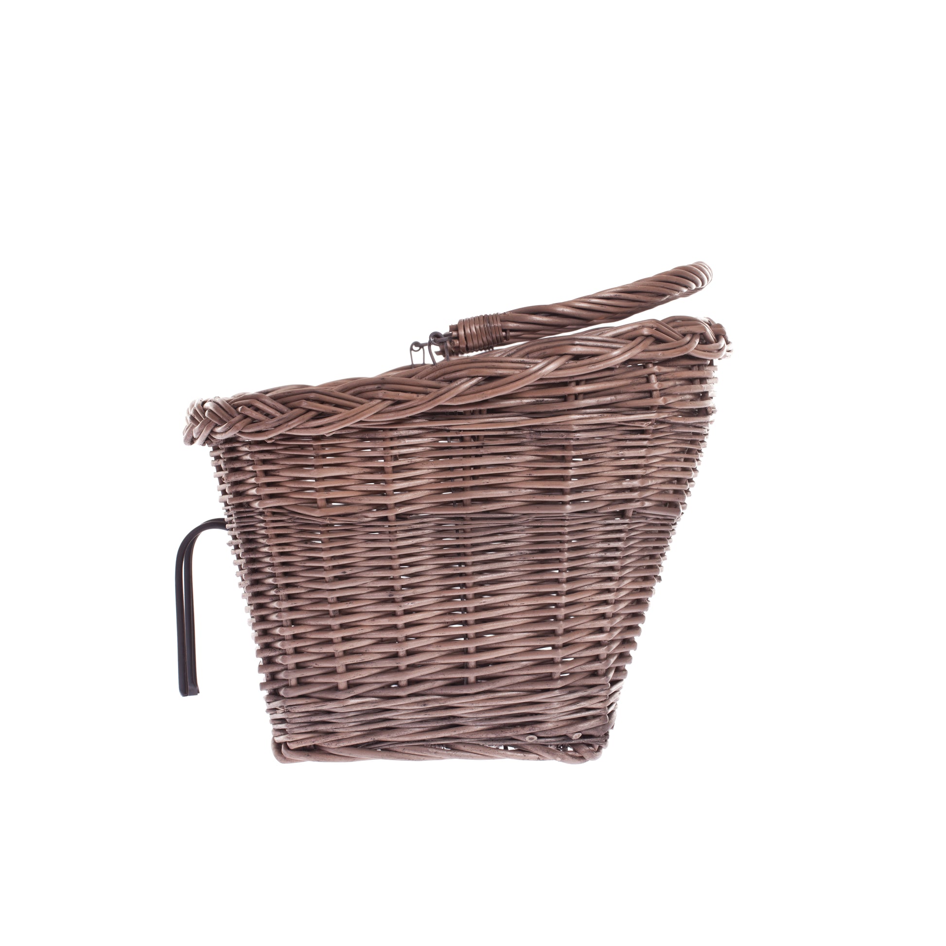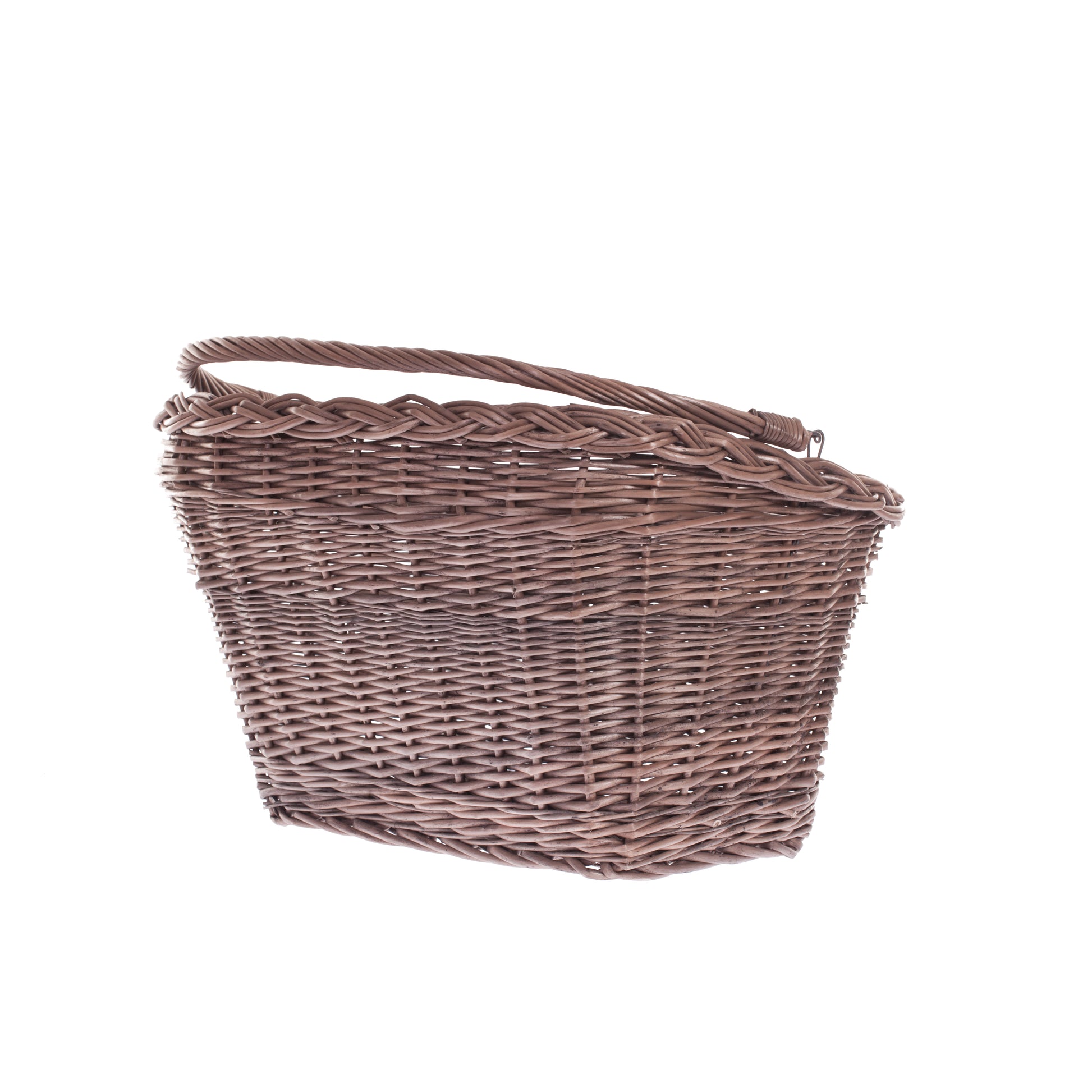 Elegancki kosz wiklinowy w odcieniu ciemnego brązu, zaprojektowany jako praktyczny kosz na kierownicę. Gęsty, równy splot oraz ozdobnie pleciony rant podkreślają jego retro charakter. Wygodny, składany uchwyt ułatwia przenoszenie po zdjęciu z roweru. Korpus jest szerszy u góry i węższy u podstawy, co sprzyja pakowaniu i stabilnemu ułożeniu zawartości. Wykończenie jest gładkie, bez wystających końcówek.