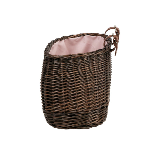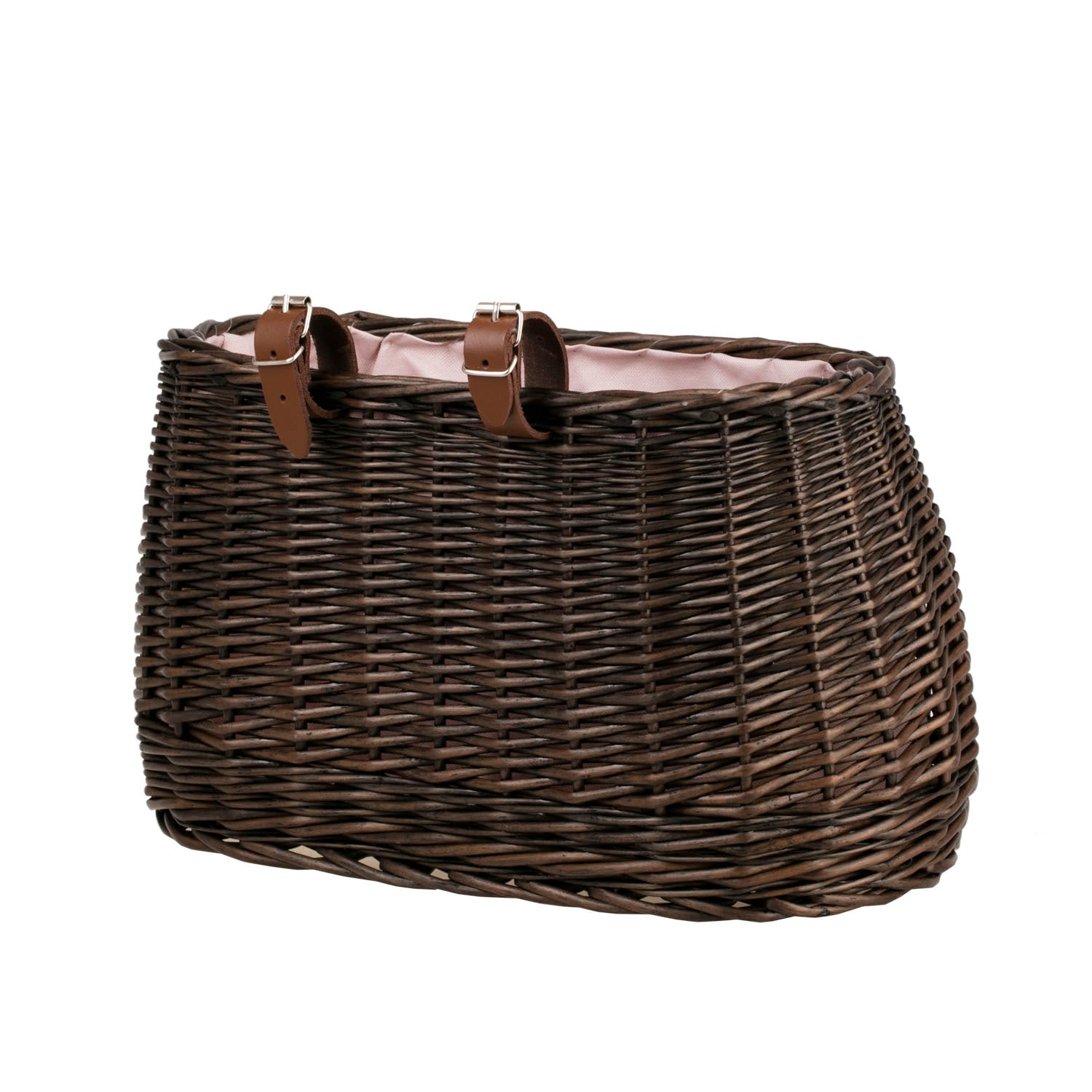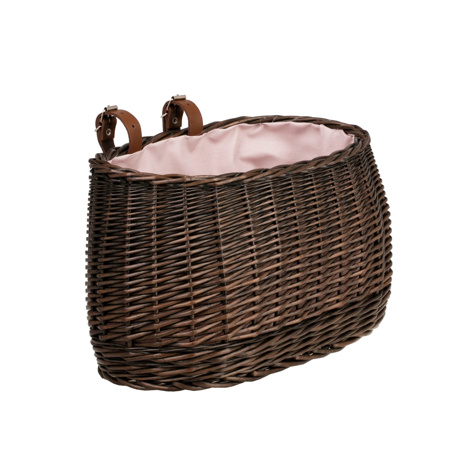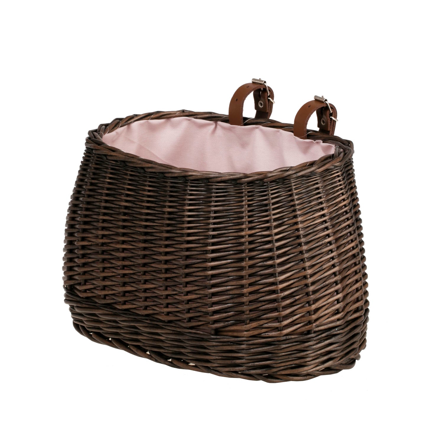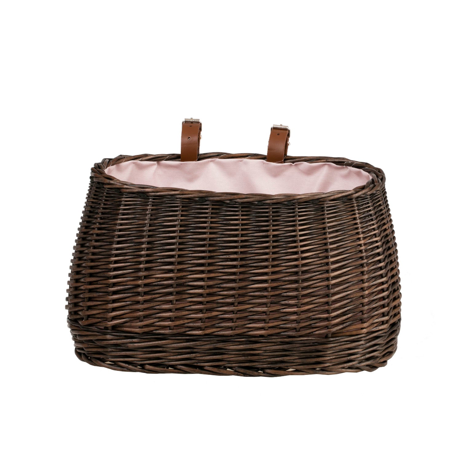 Marone wiklinowy koszyczek rowerowy z różowym obszyciem i paskami TheWickerStories
