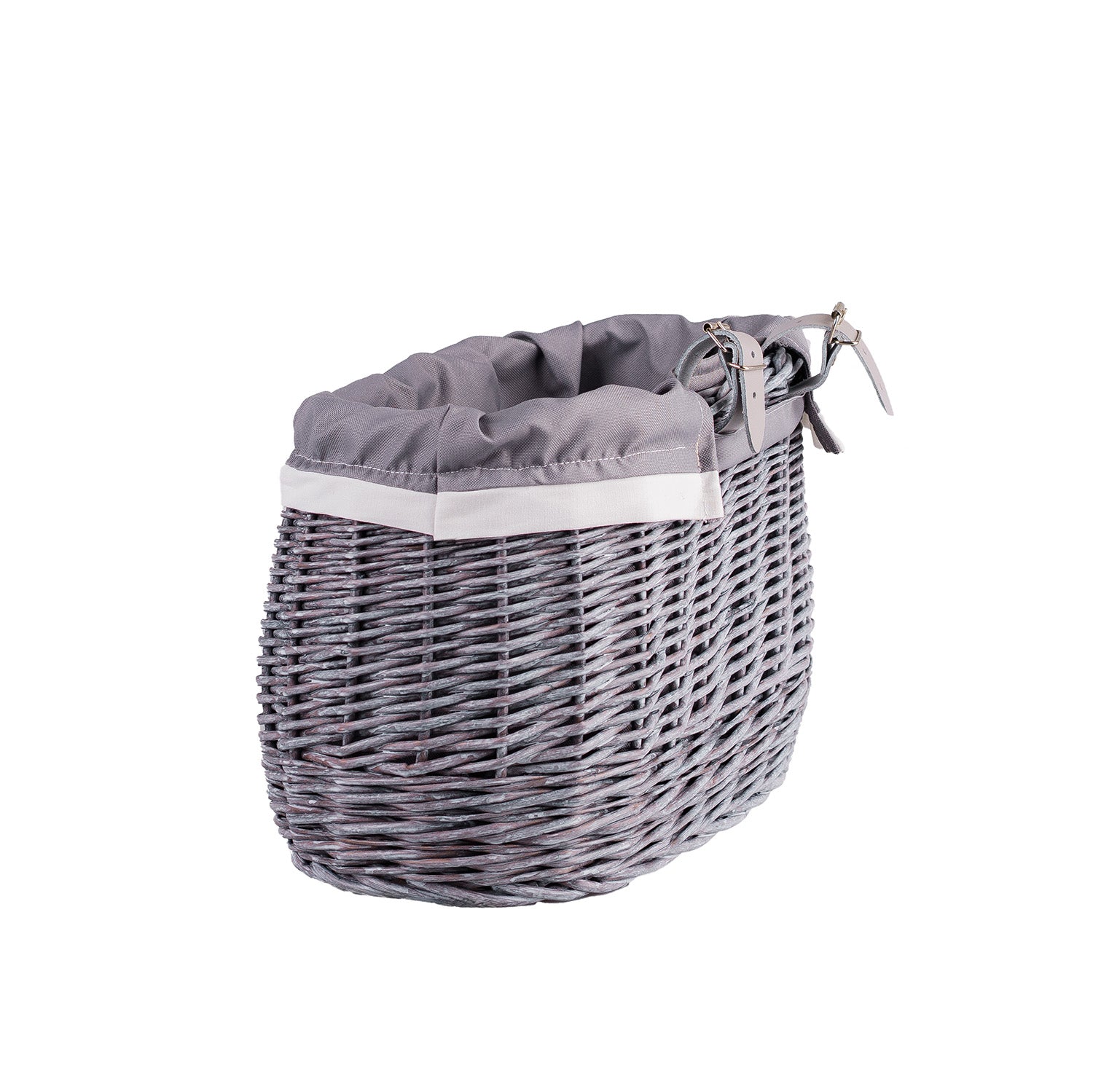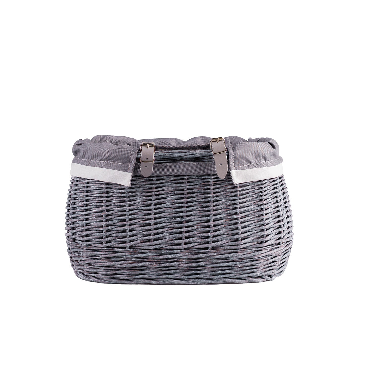 Marone wiklinowy koszyczek rowerowy z szarym obszyciem i paskami TheWickerStories