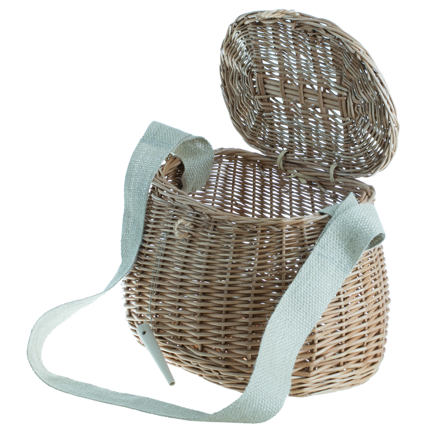 Kosz został wyposażony w praktyczny pasek, który umożliwia wygodne noszenie go na ramieniu – nawet przy dłuższych spacerach czy wędkarskich wyprawach. Solidne zapięcie z drewnianym kołkiem zabezpiecza zawartość przed przypadkowym otwarciem, a jego wyprofilowany kształt dobrze przylega do ciała, co zwiększa komfort noszenia.