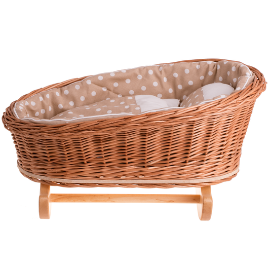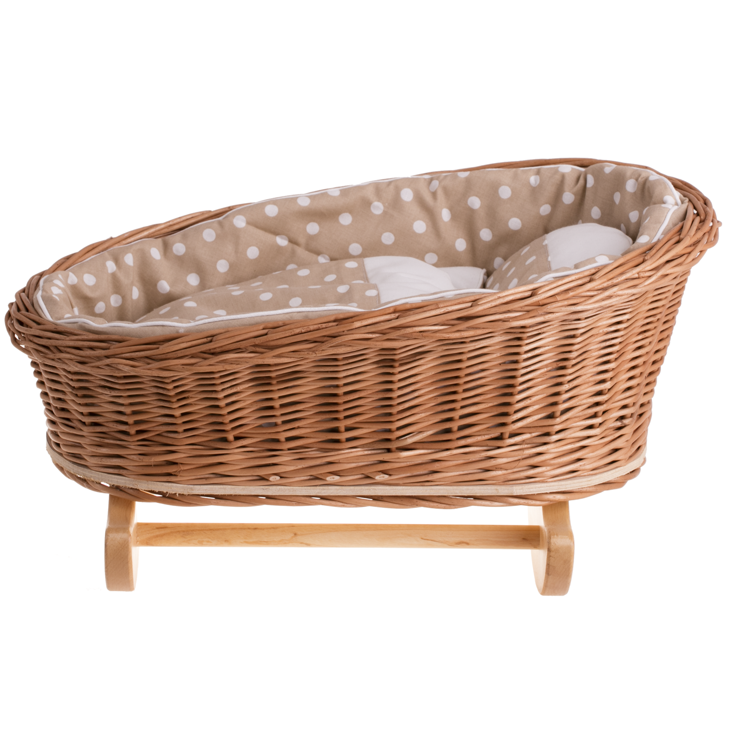 Mimi wiklinowa kołyska dla lalek z beżowym obszyciem, poduszką i kołderką TheWickerStories