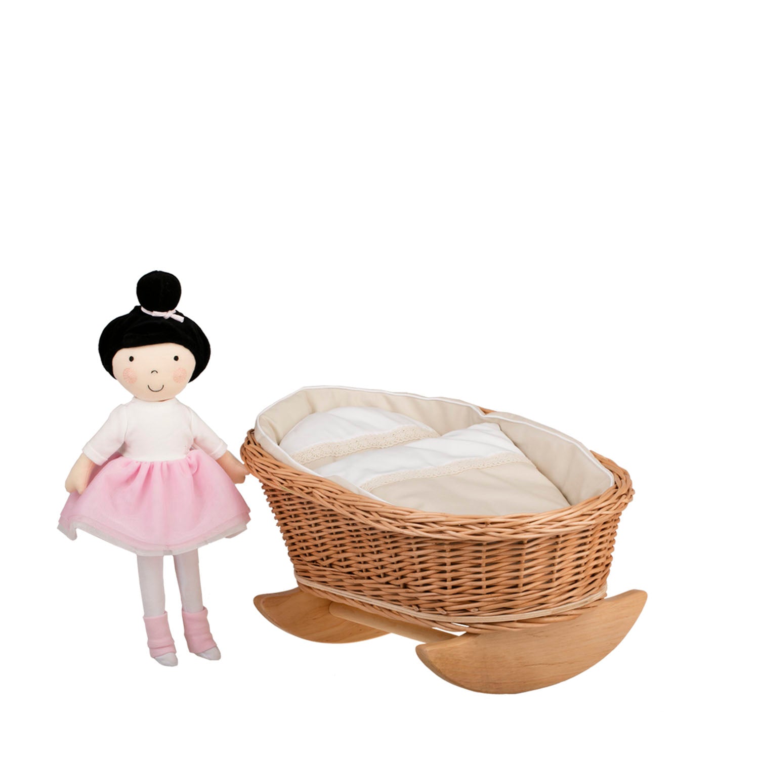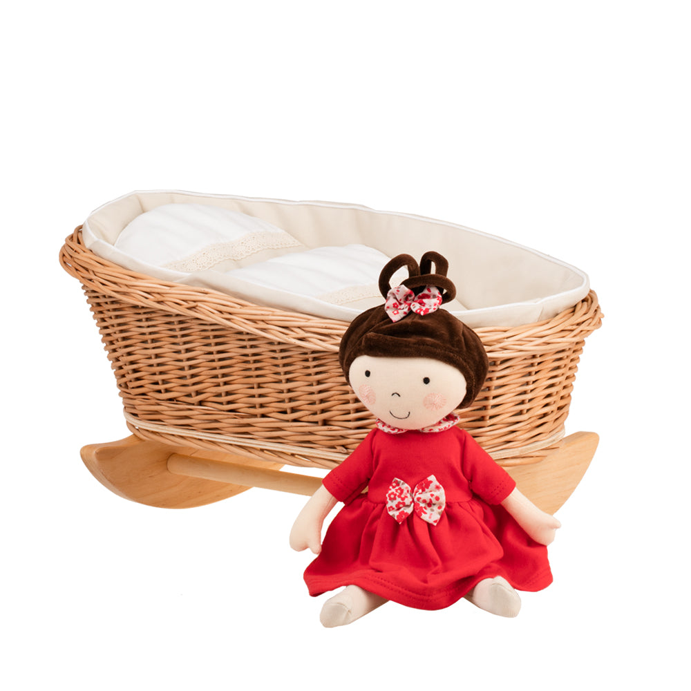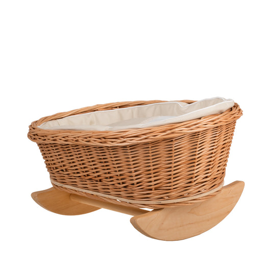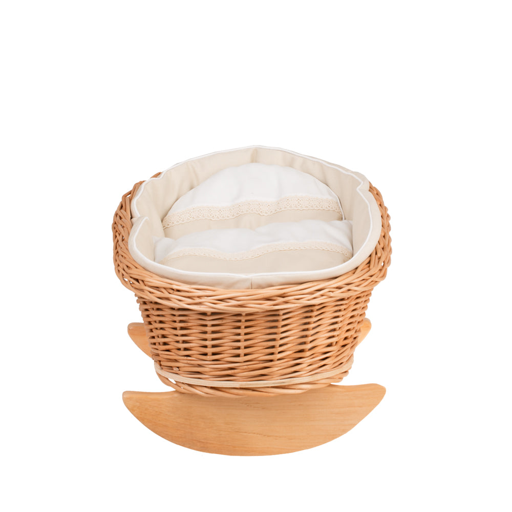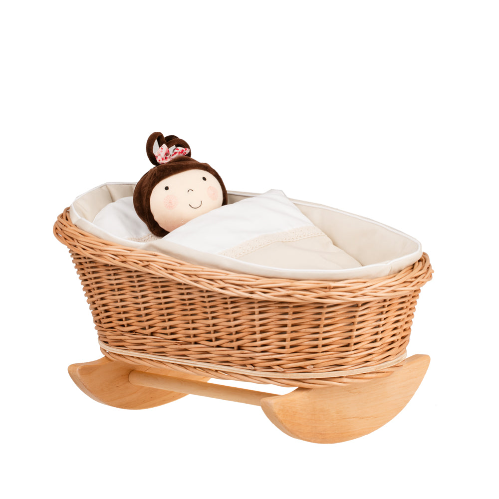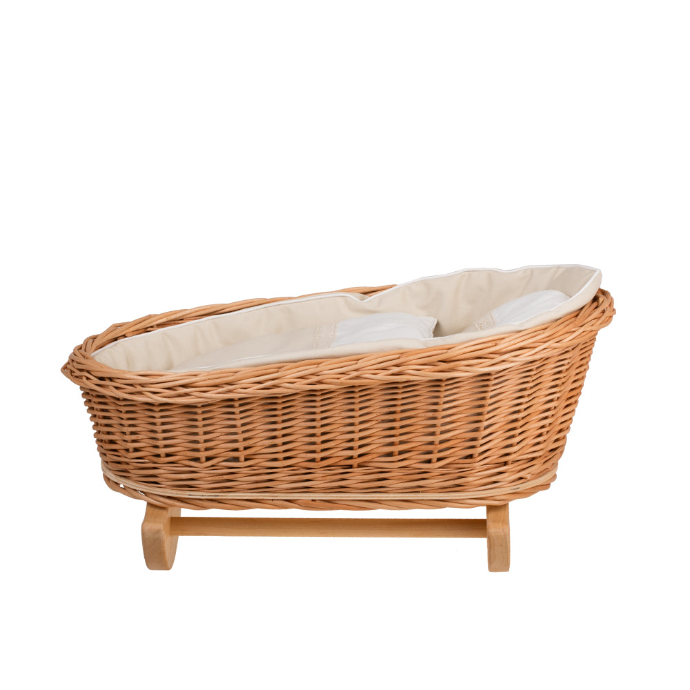 Mimi wiklinowa kołyska dla lalek z beżowym obszyciem, poduszką i kołderką TheWickerStories