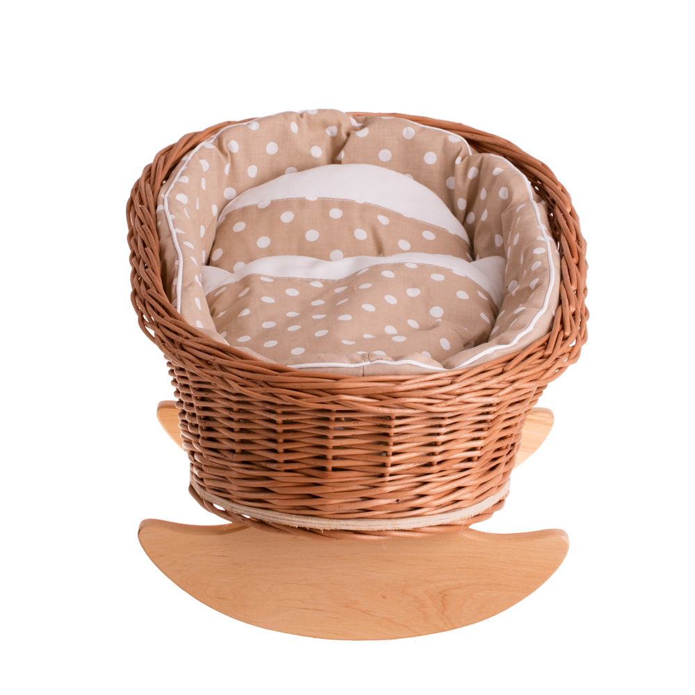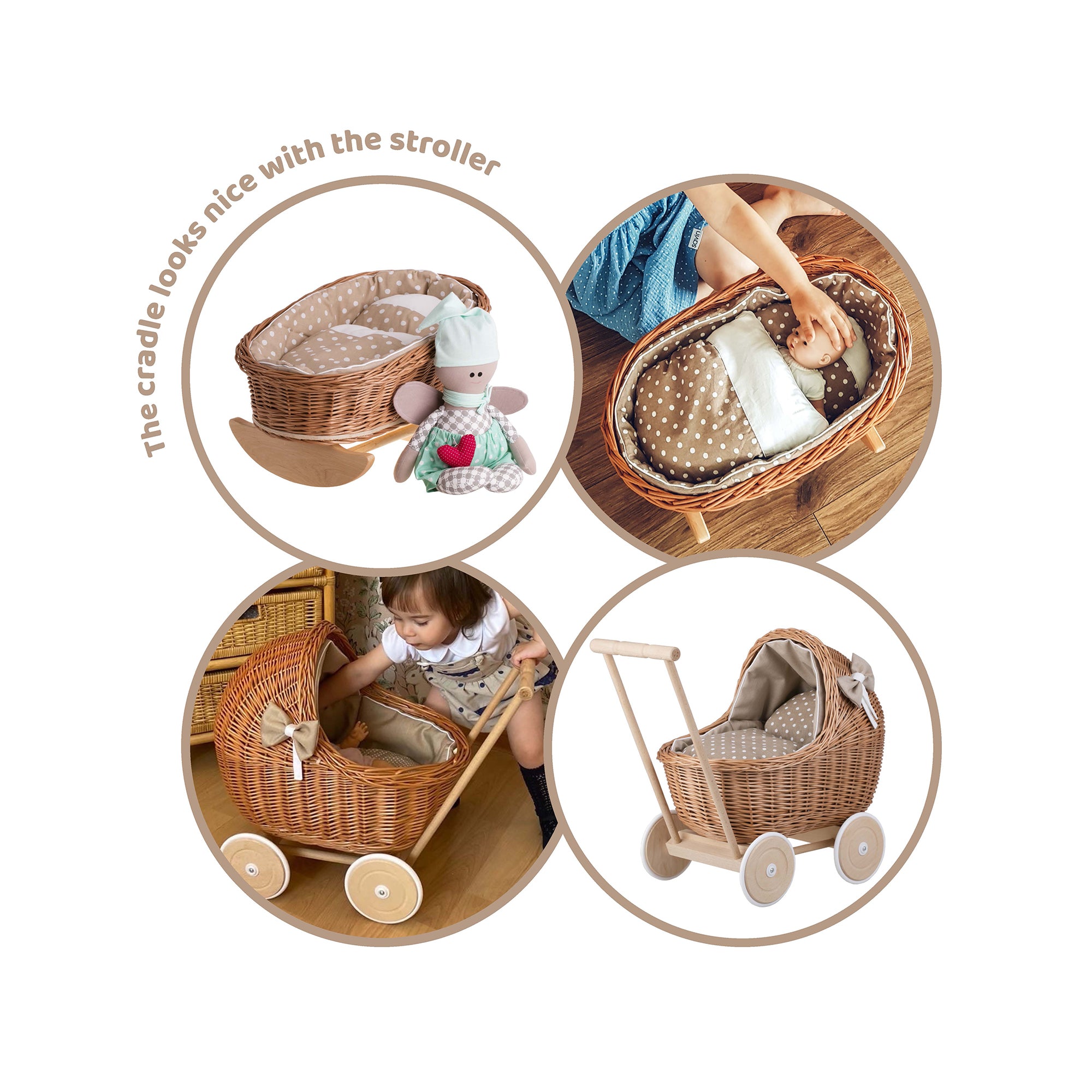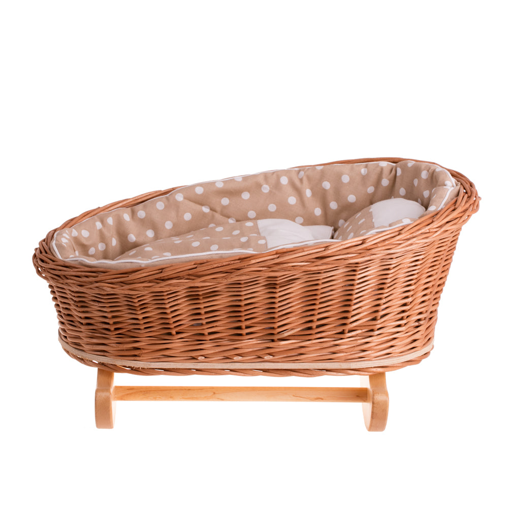 Mimi wiklinowa kołyska dla lalek z beżowym obszyciem, poduszką i kołderką TheWickerStories