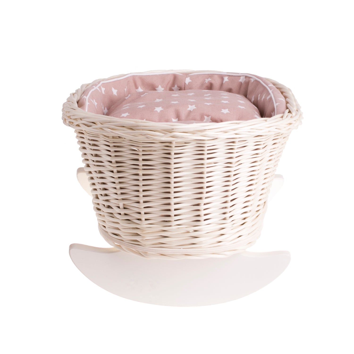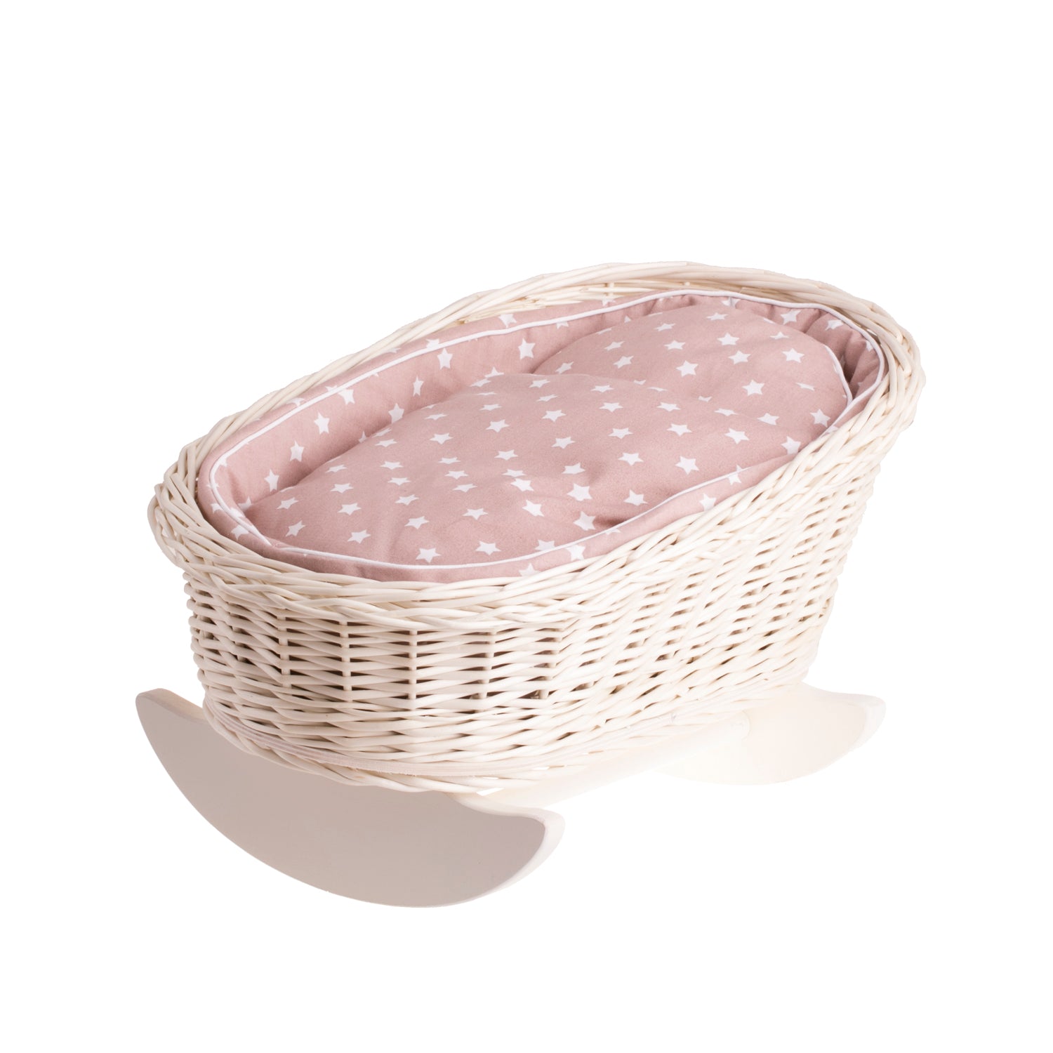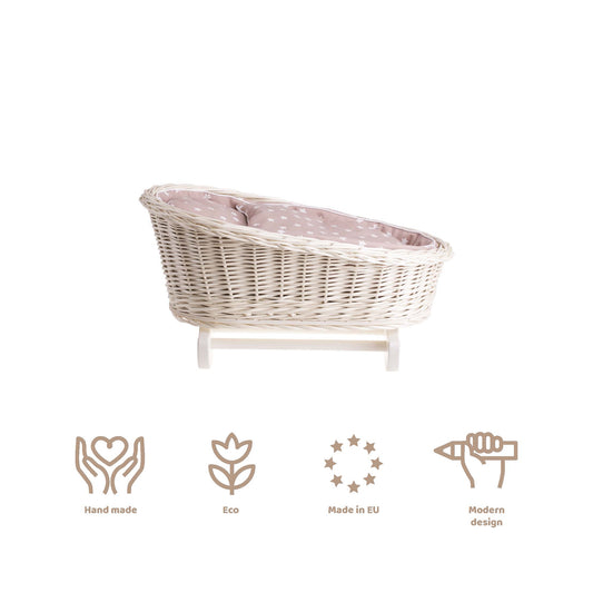 Mimi wiklinowa kołyska dla lalek z beżowym obszyciem, poduszką i kołderką TheWickerStories