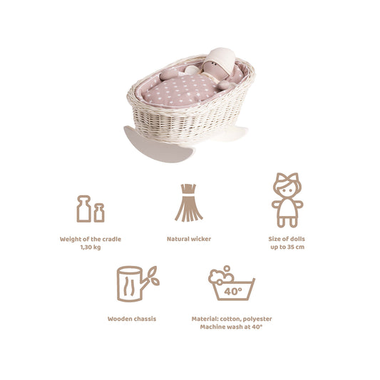 Specyfikacja Twojego Mimi wiklinowa kołyska dla lalek z beżowym obszyciem, poduszką i kołderką TheWickerStories