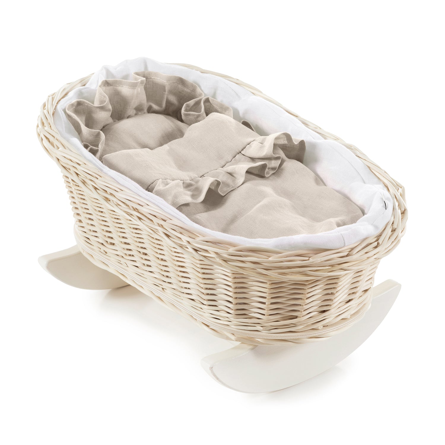 Mimi wiklinowa kołyska dla lalek z białym obszyciem, z poduszką i kołderką, na płozach TheWickerStories
