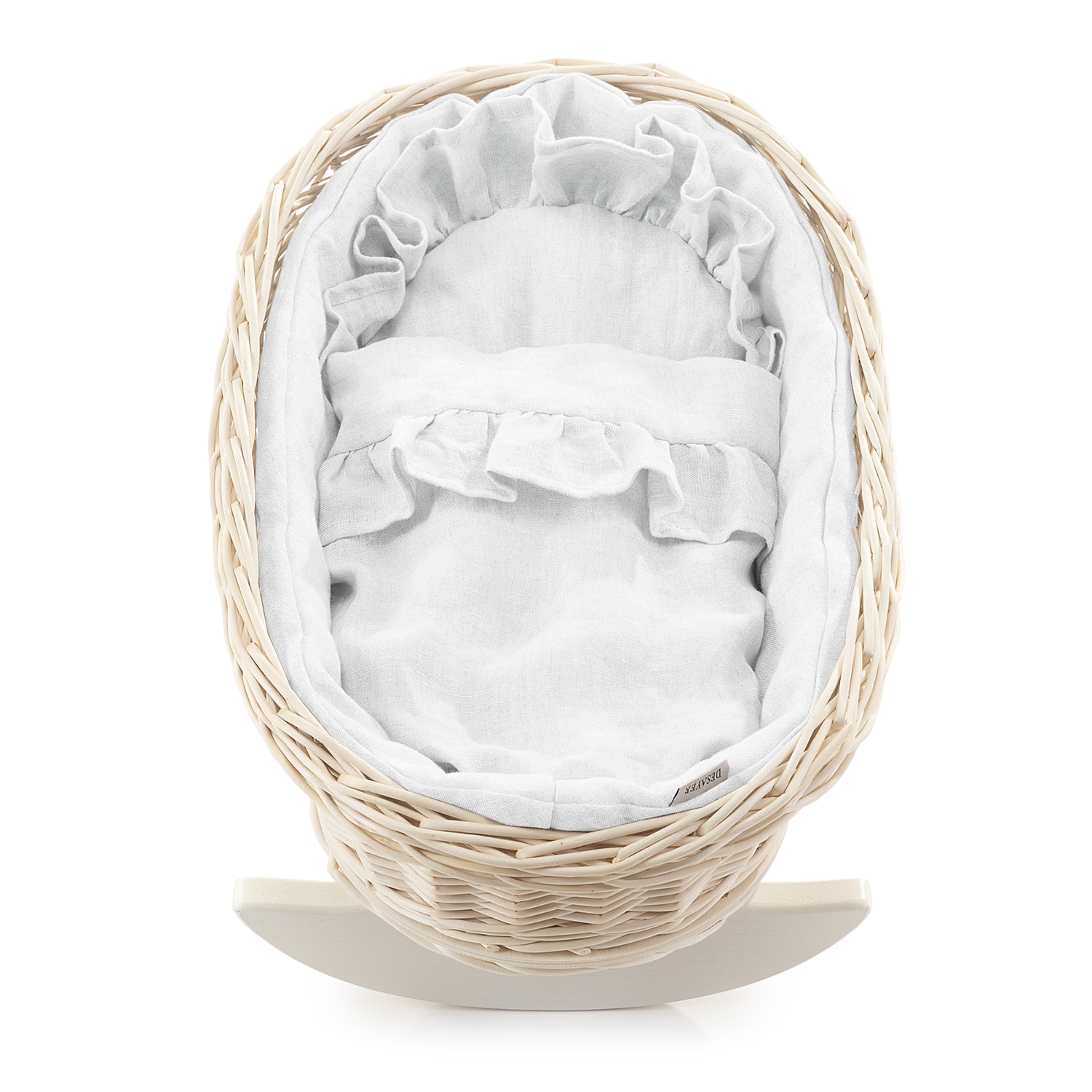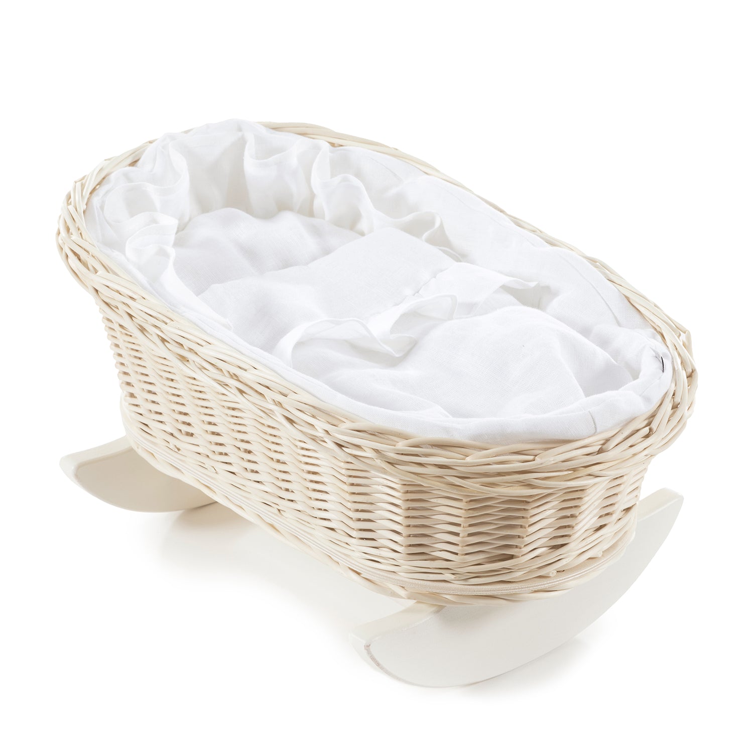 Mimi wiklinowa kołyska dla lalek z białym obszyciem, z poduszką i kołderką TheWickerStories