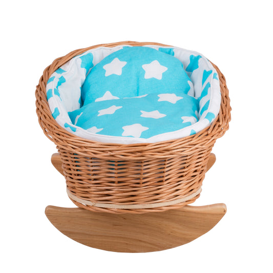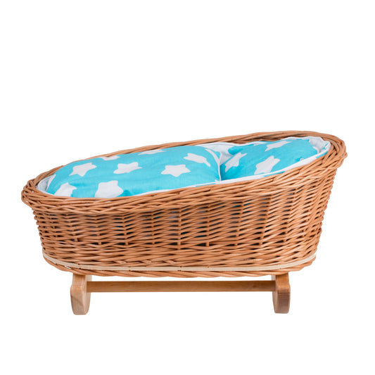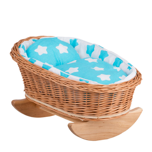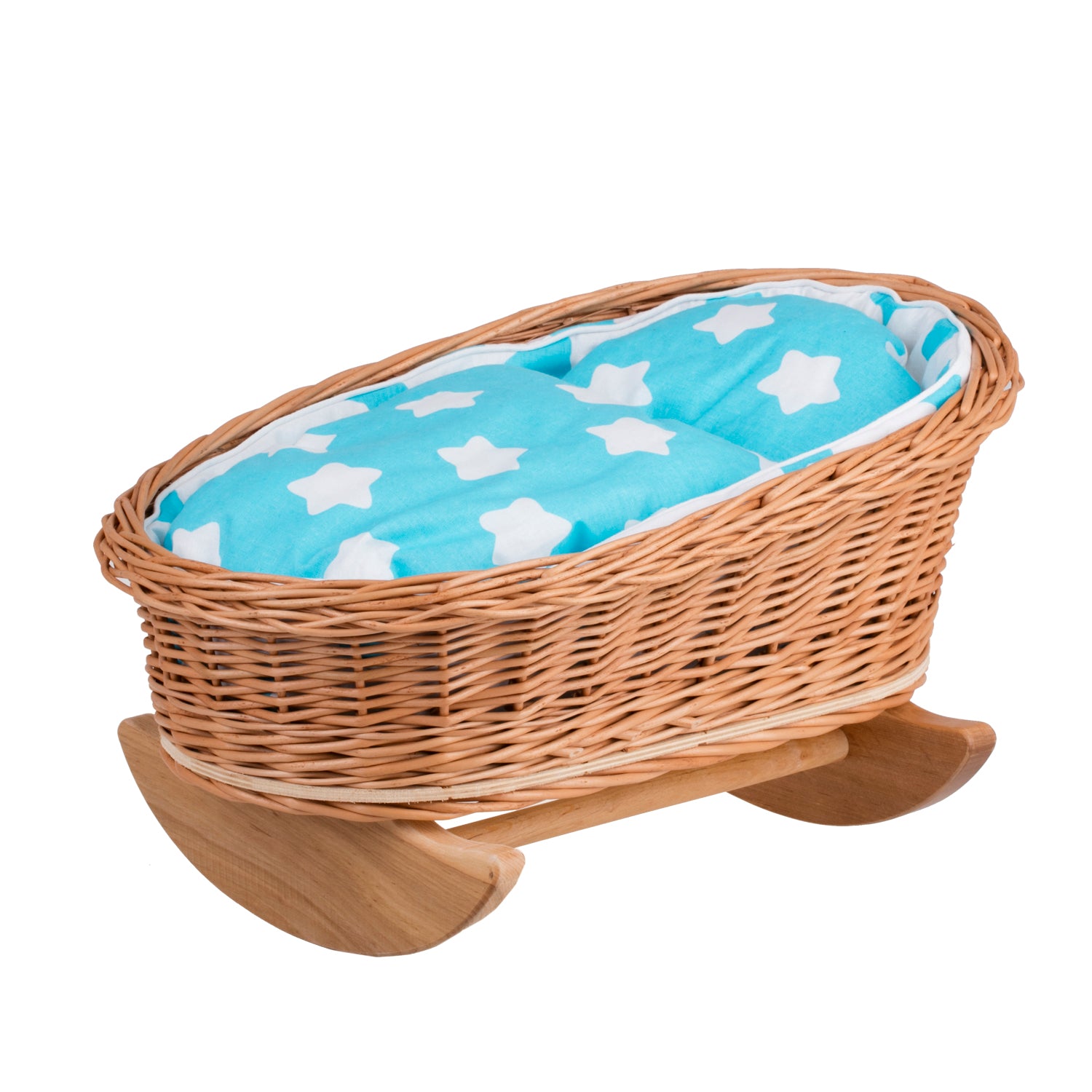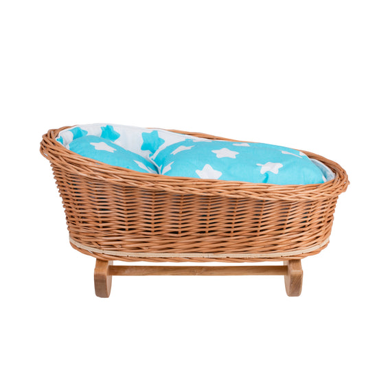Mimi wiklinowa kołyska dla lalek z niebieskim obszyciem, poduszką i kołderką TheWickerStories