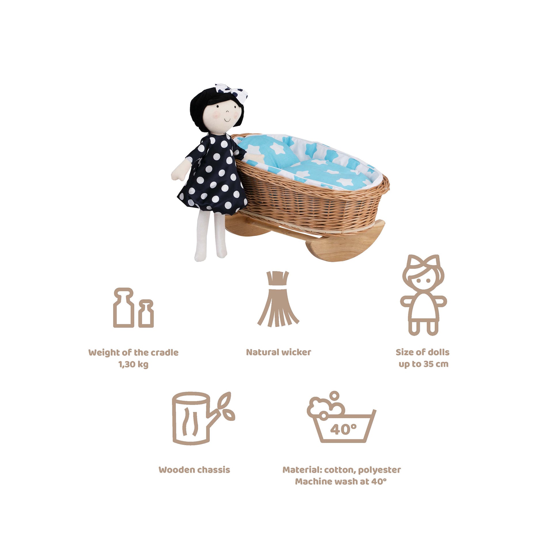 Specyfikacja Twojego Mimi wiklinowa kołyska dla lalek z niebieskim obszyciem, poduszką i kołderką TheWickerStories