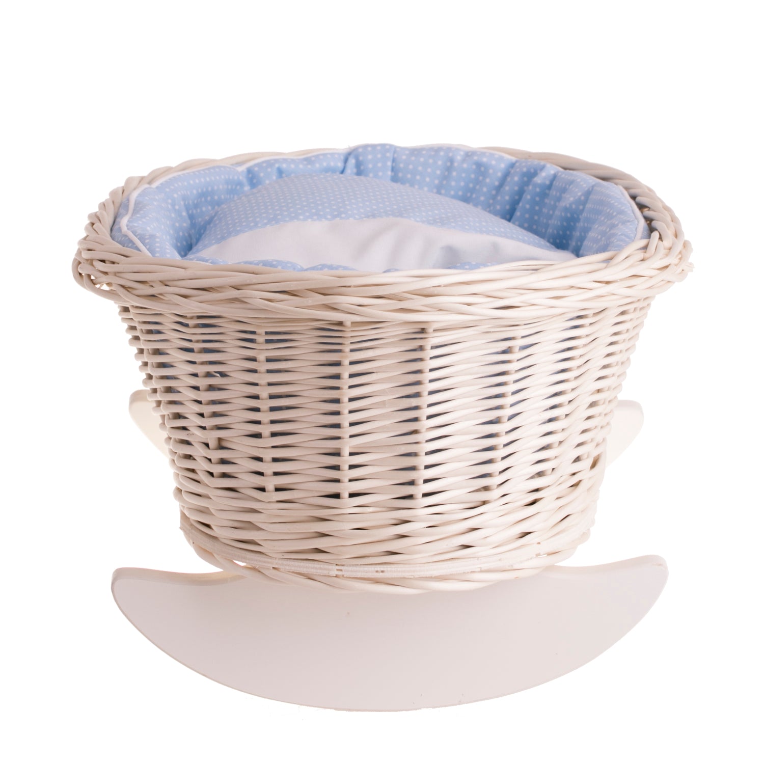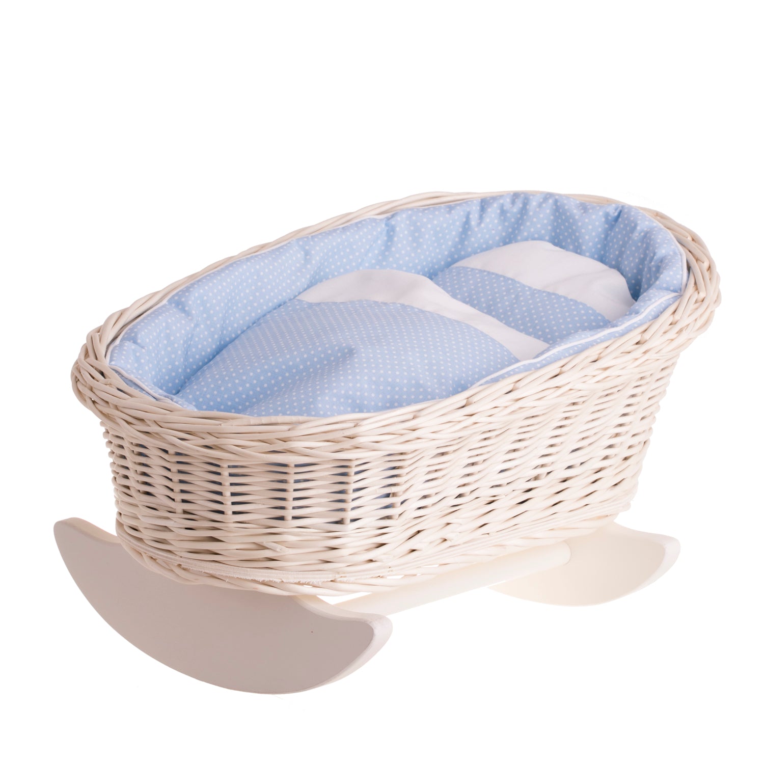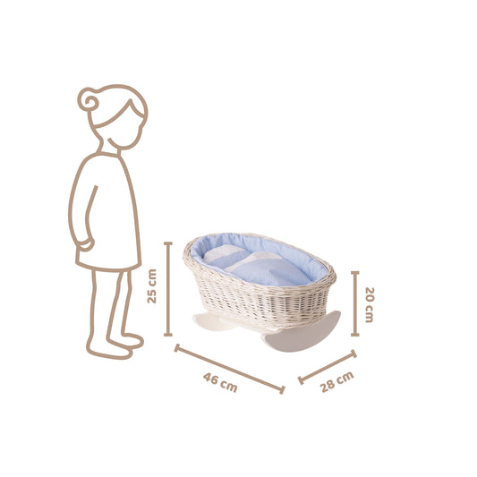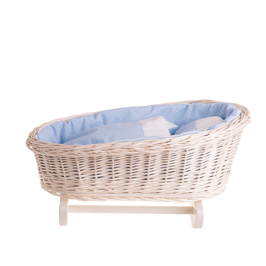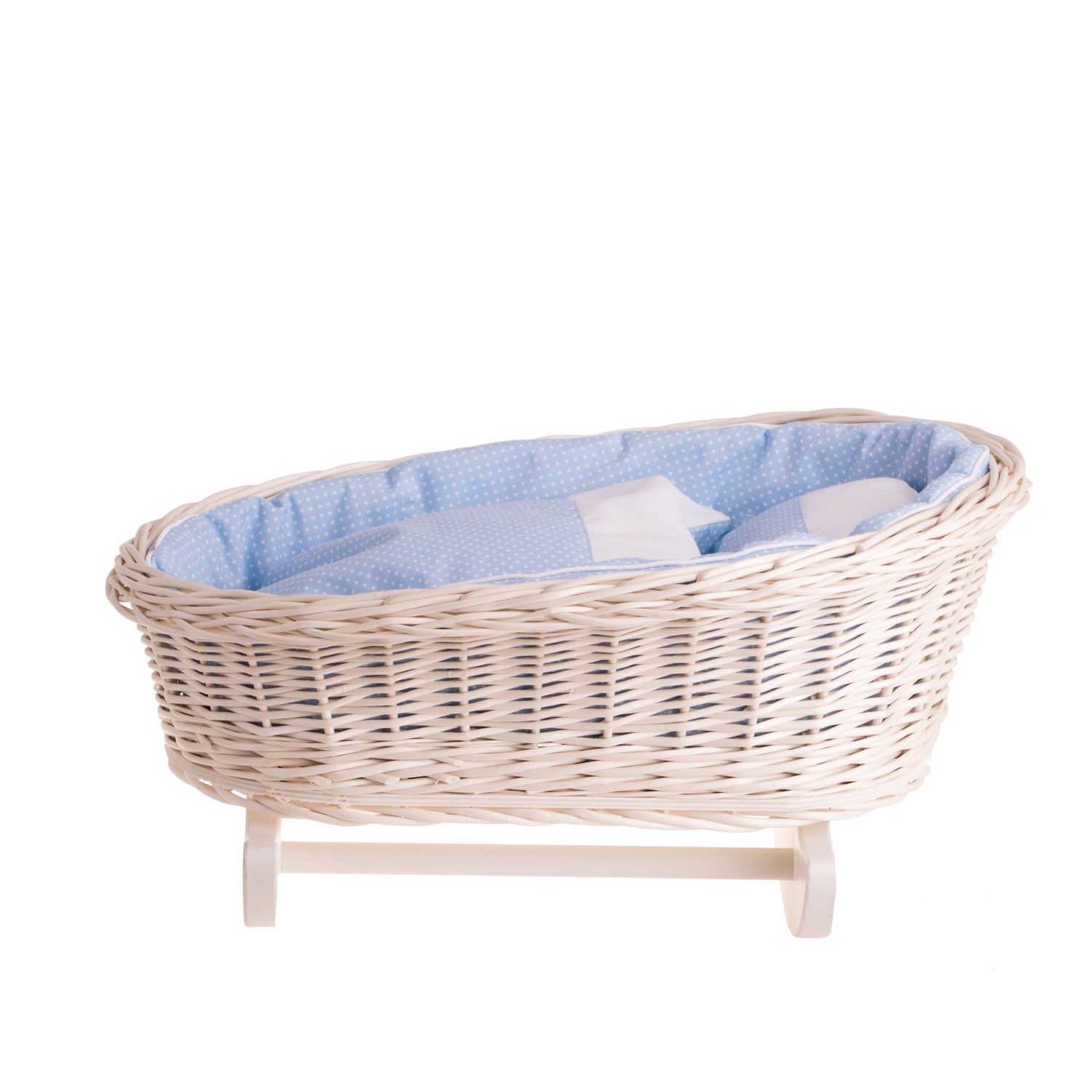 Mimi wiklinowa kołyska dla lalek z niebieskim obszyciem, poduszką i kołderką TheWickerStories