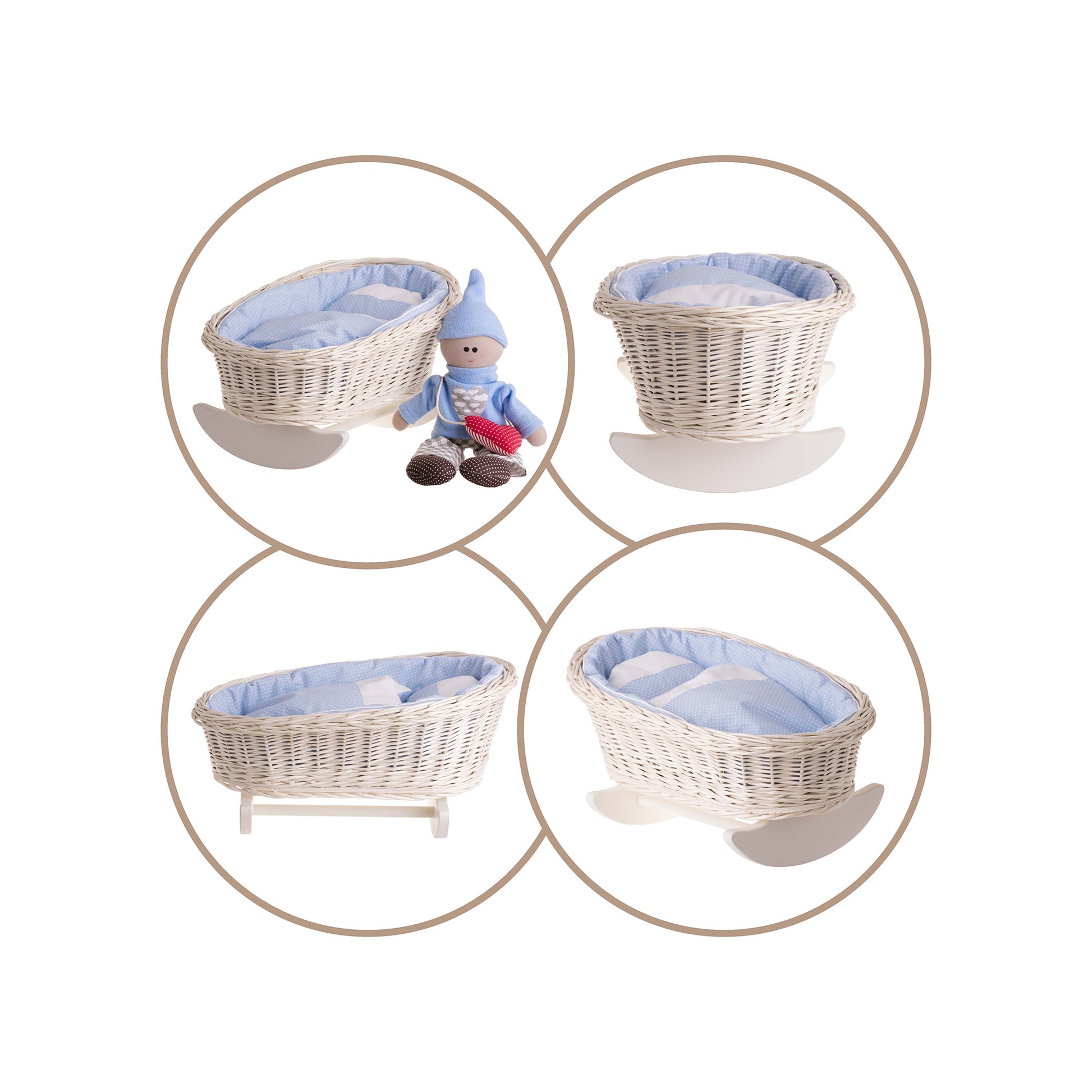 Specyfikacja Twojego Mimi wiklinowa kołyska dla lalek z niebieskim obszyciem, poduszką i kołderką TheWickerStories