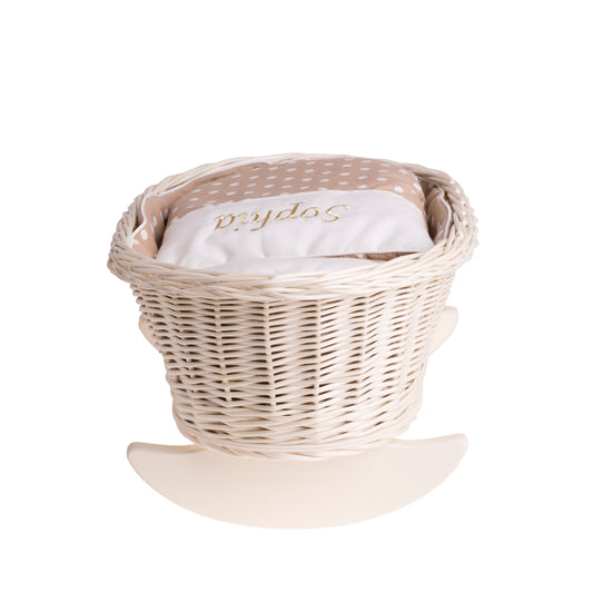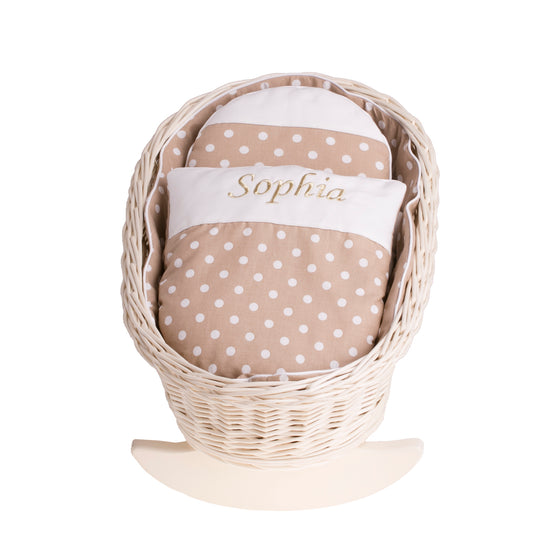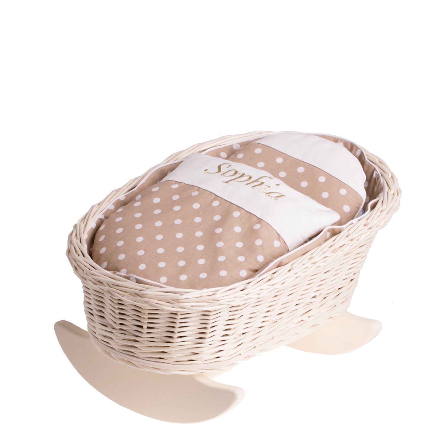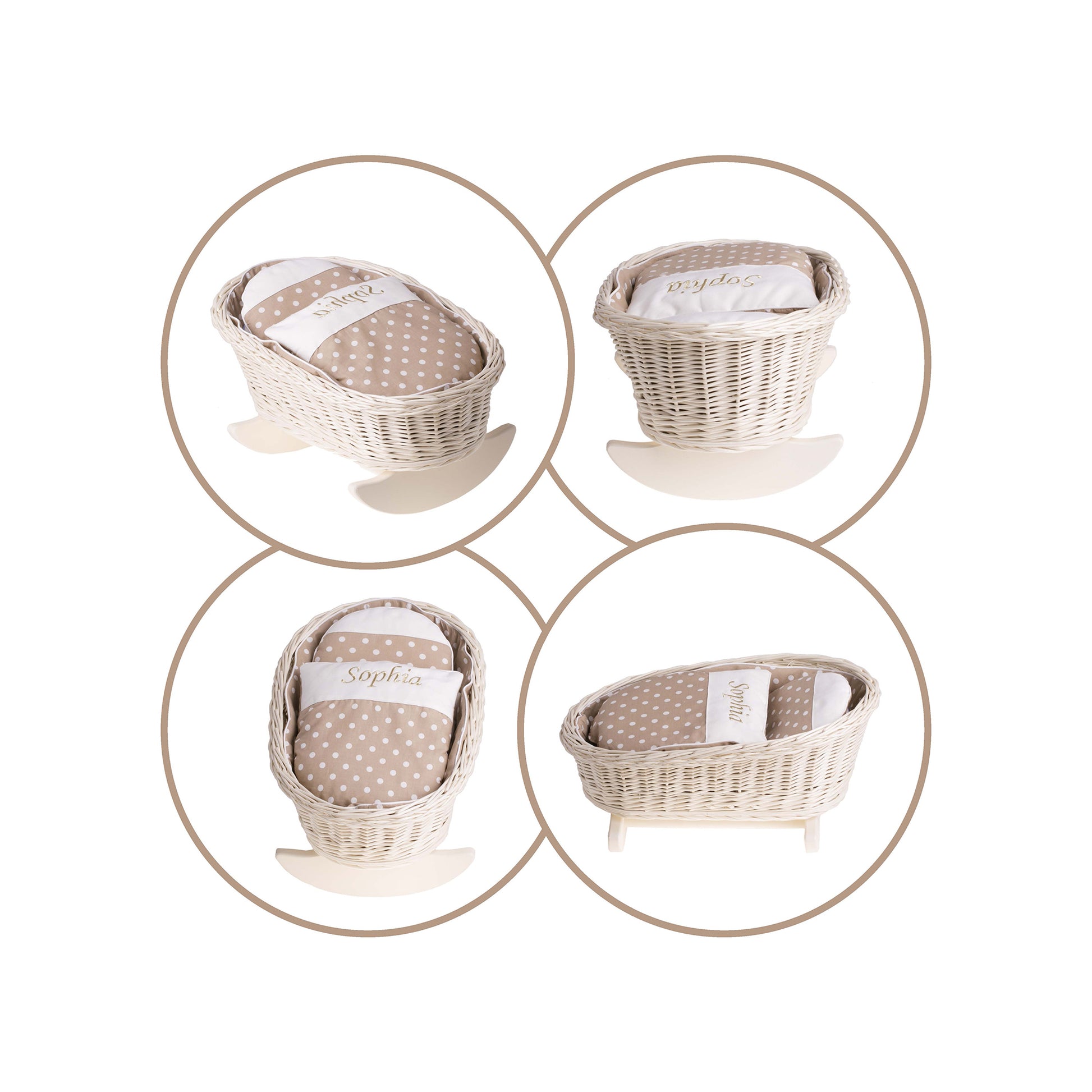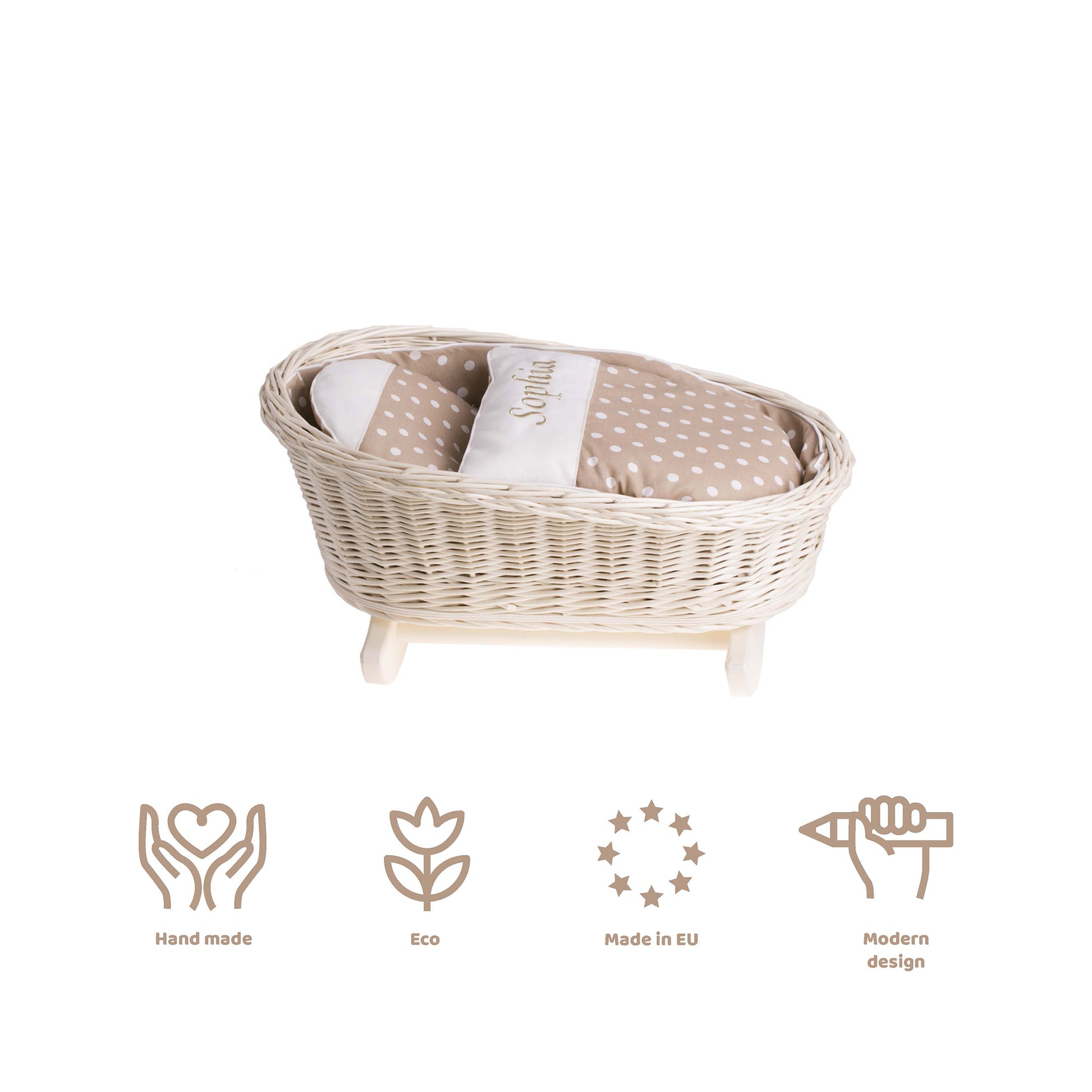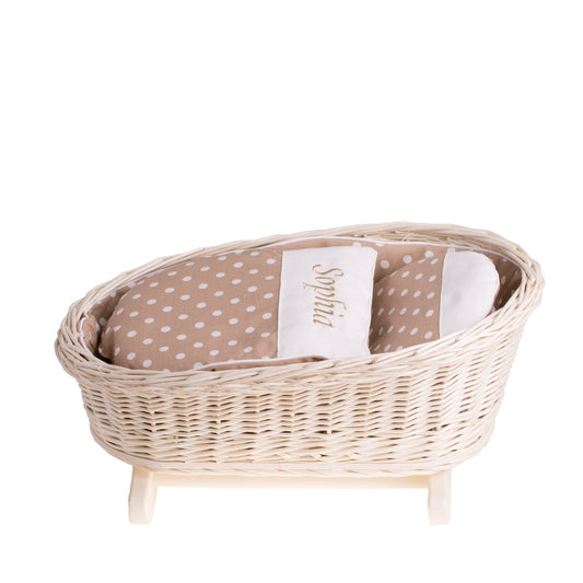 Mimi wiklinowa kołyska dla lalek z personalizacją, beżowym obszyciem, poduszką i kołderką TheWickerStories