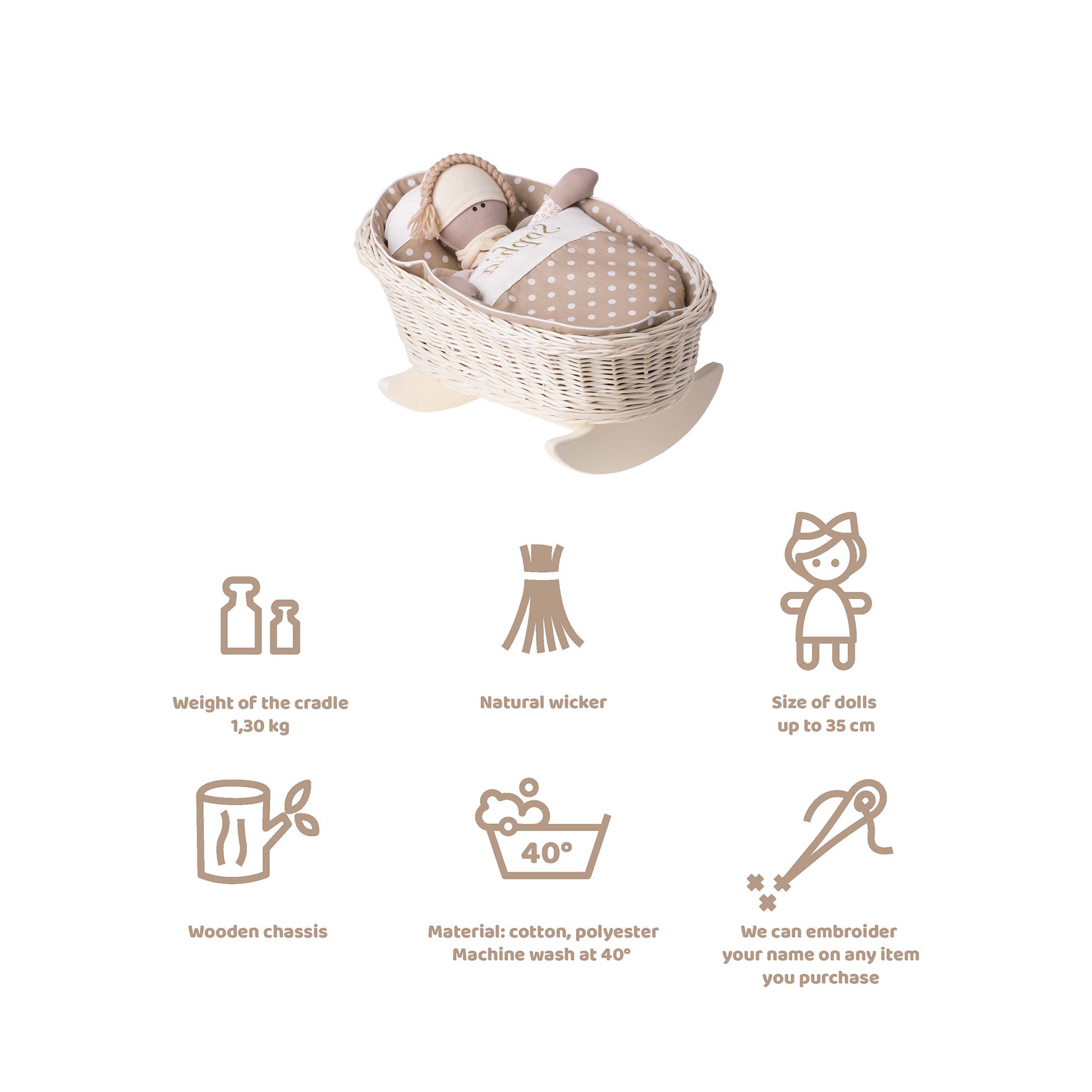 Specyfikacja Twojego Mimi wiklinowa kołyska dla lalek z personalizacją, beżowym obszyciem, poduszką i kołderką TheWickerStories