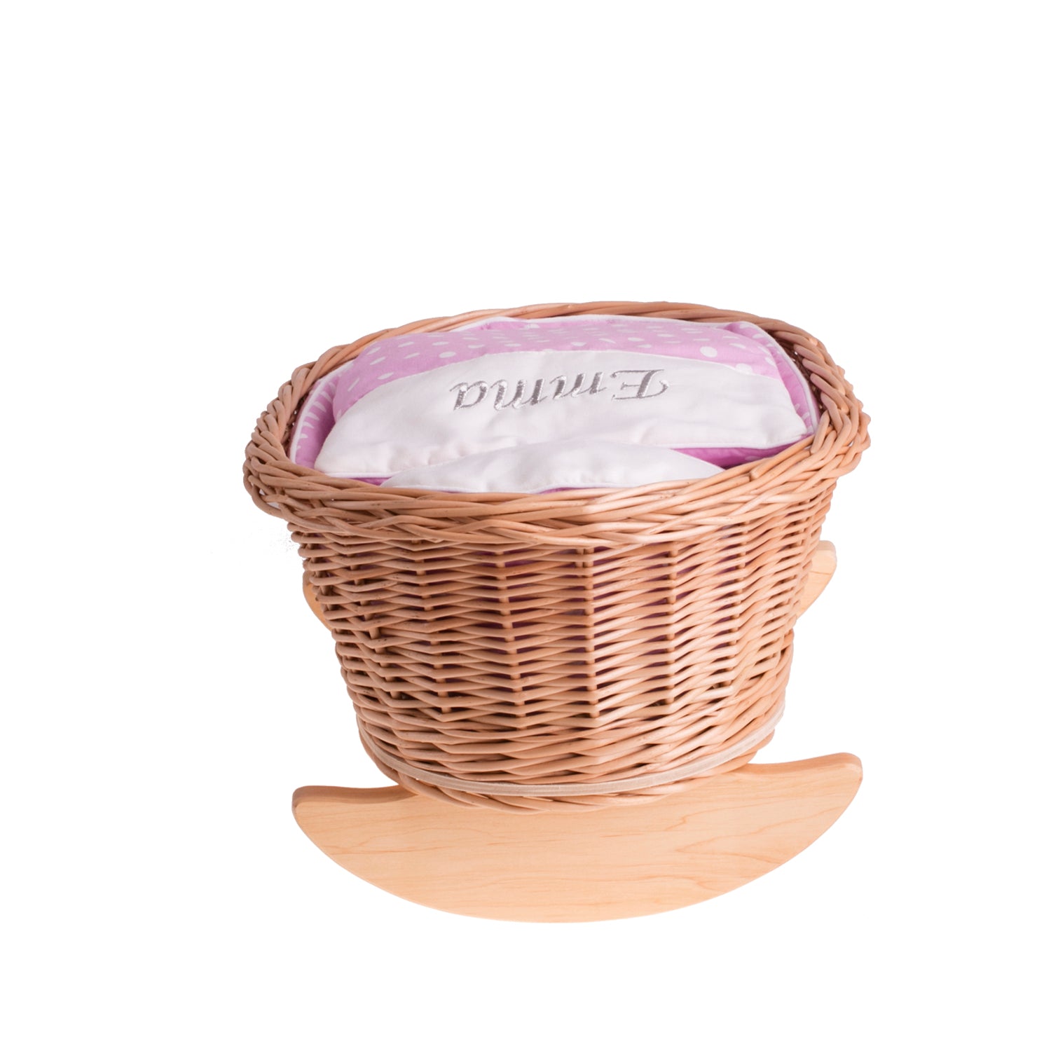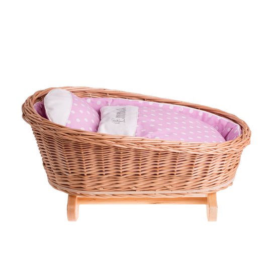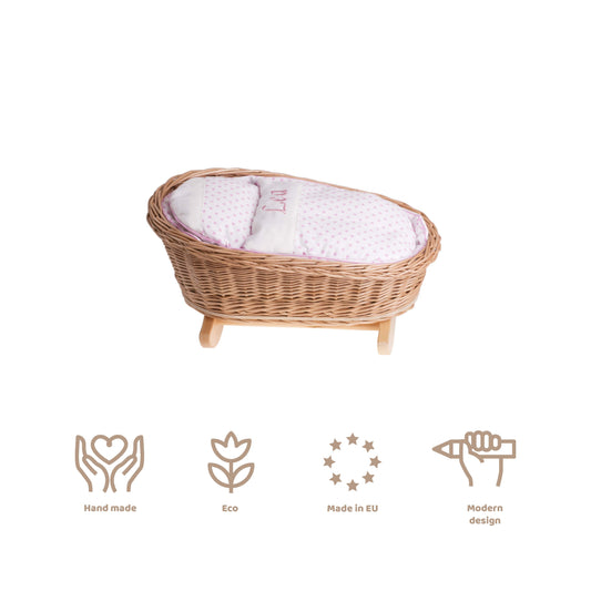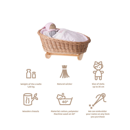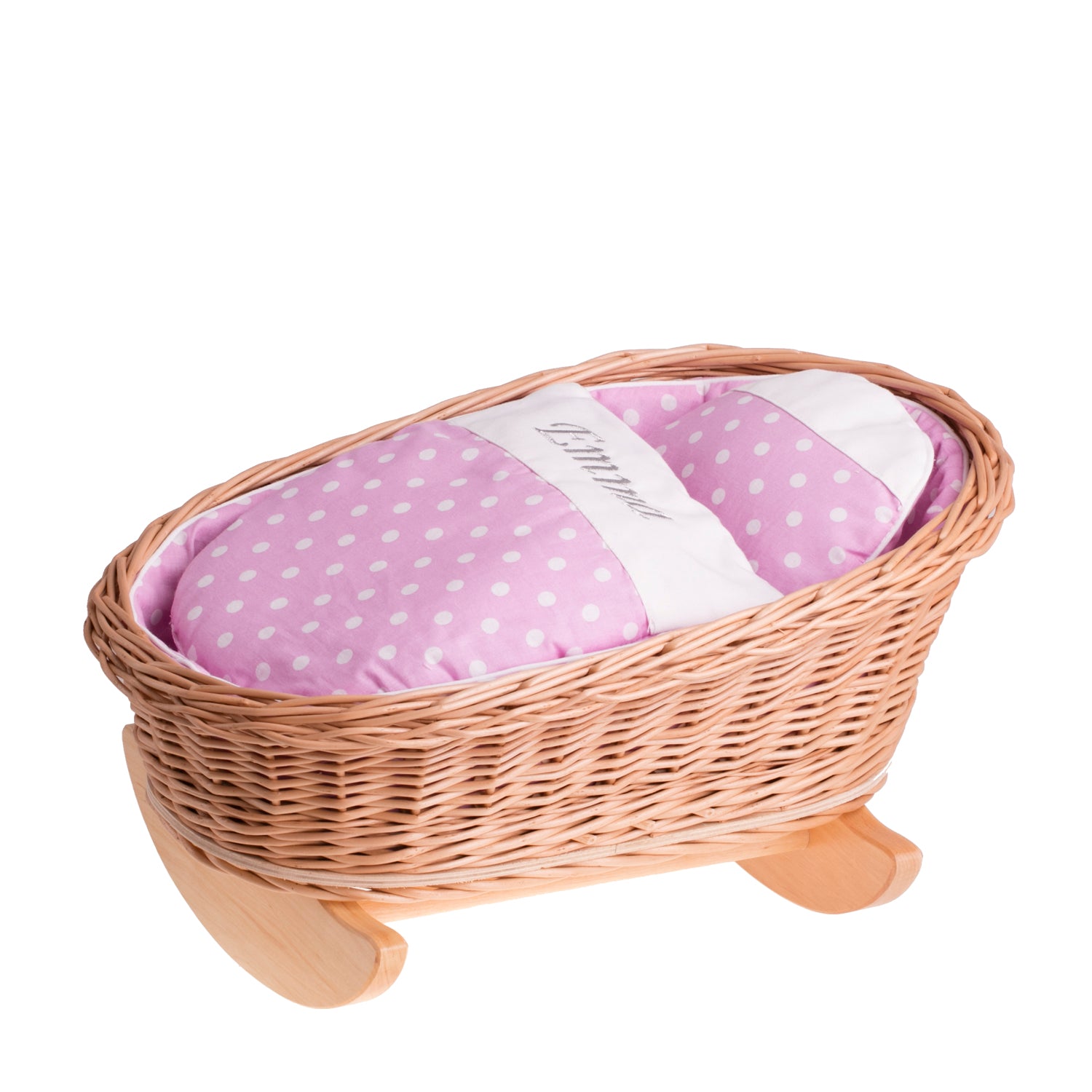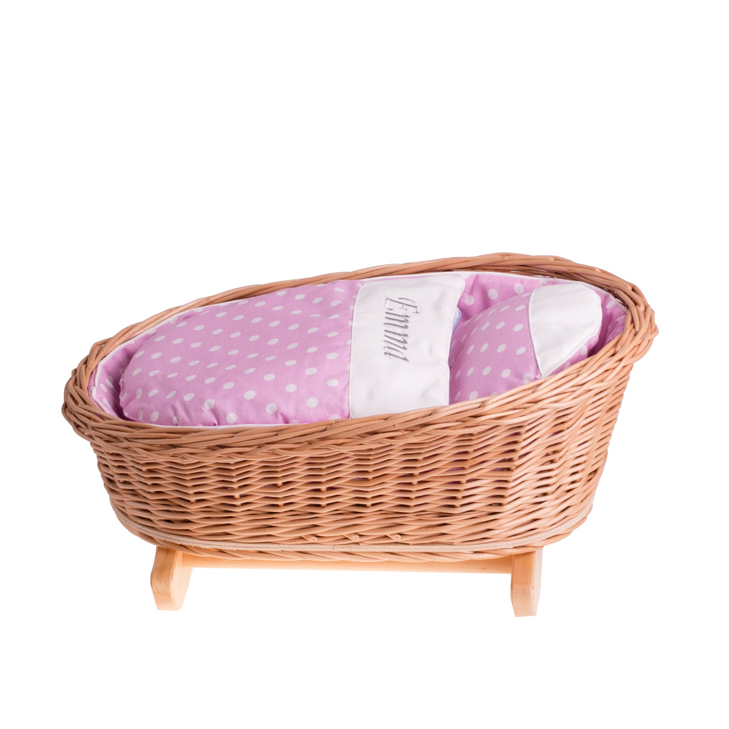 Mimi wiklinowa kołyska dla lalek z personalizacją, różowym obszyciem, poduszką i kołderką TheWickerStories