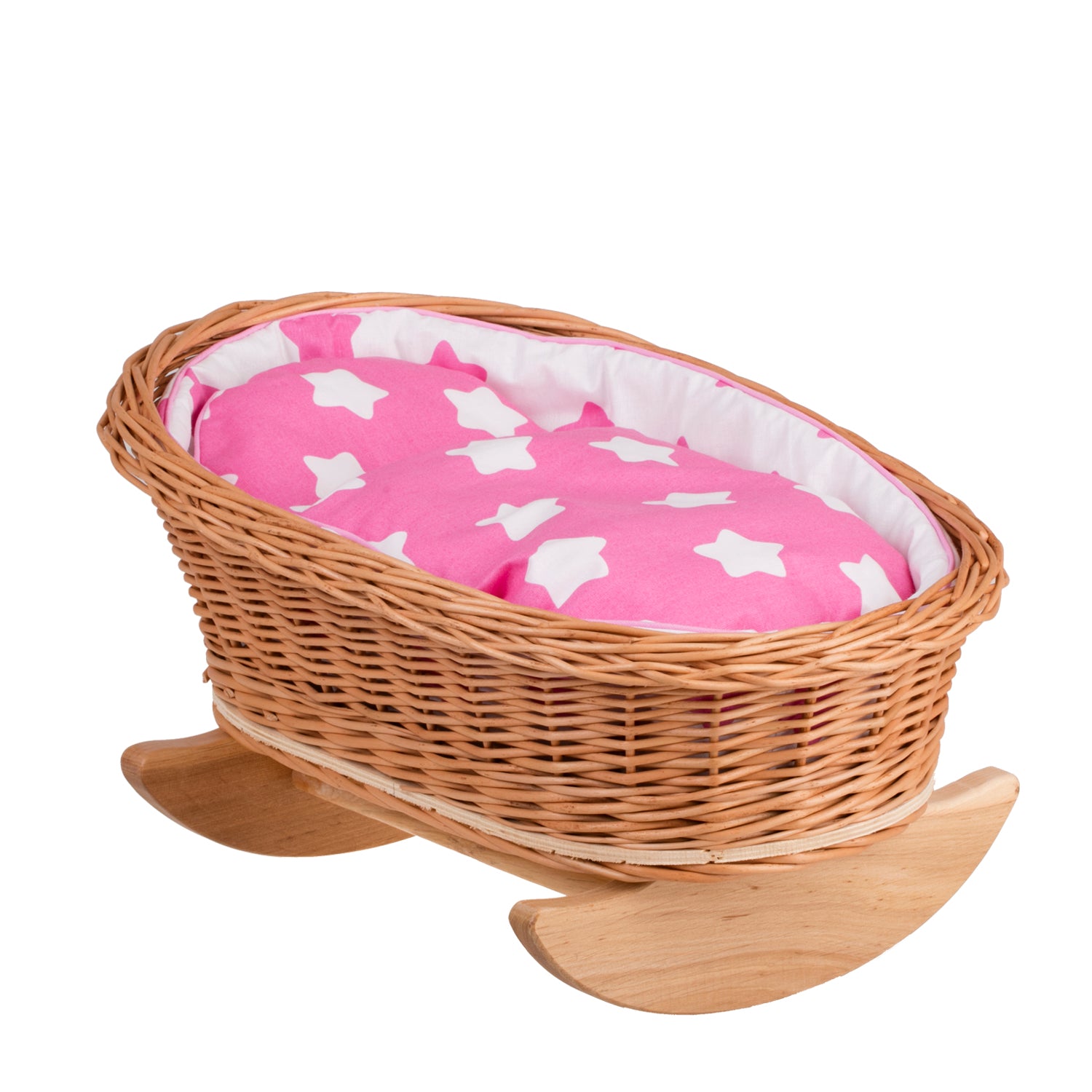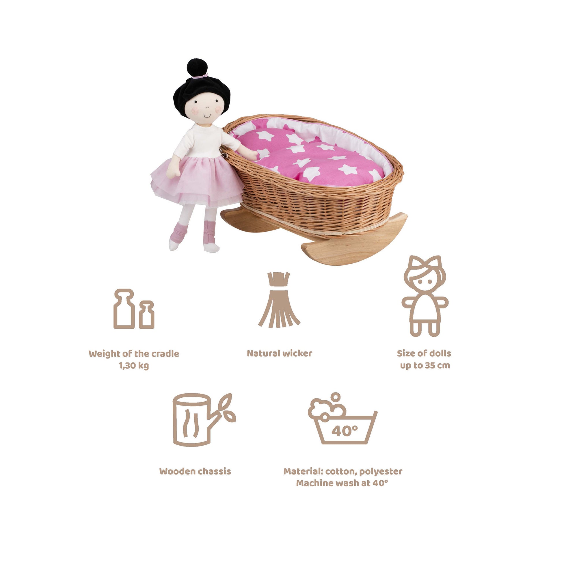 Specyfikacja Twojego Mimi wiklinowa kołyska dla lalek z różowym obszyciem, poduszką i kołderką TheWickerStories