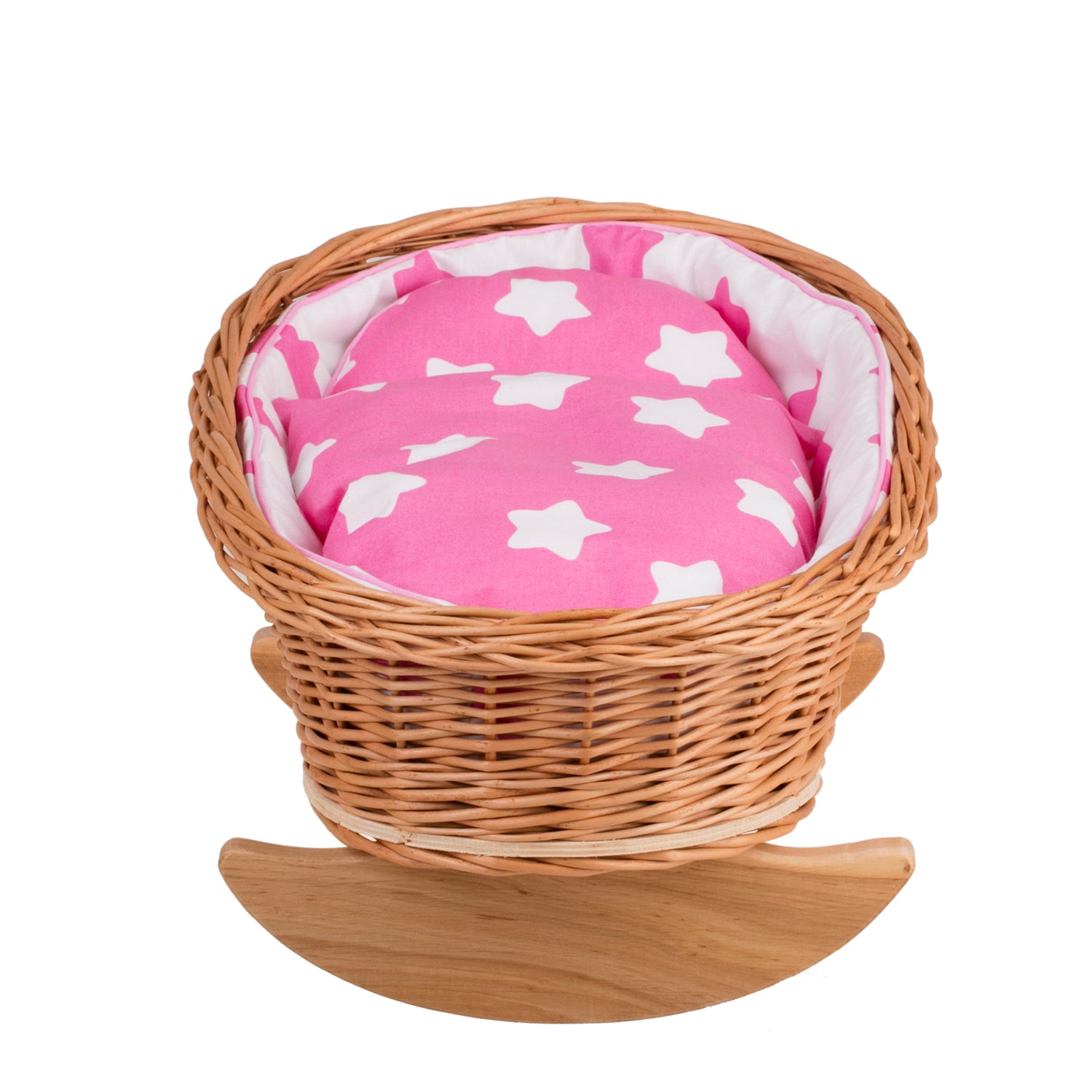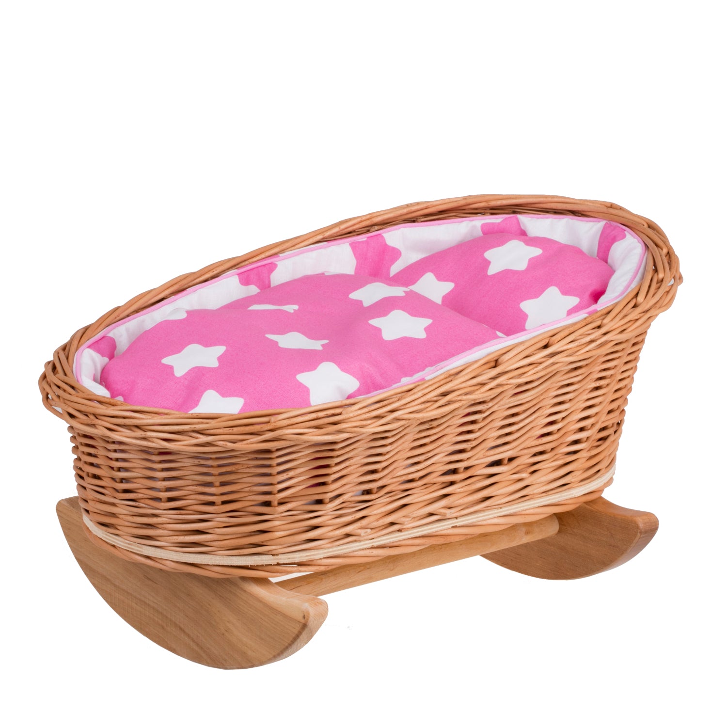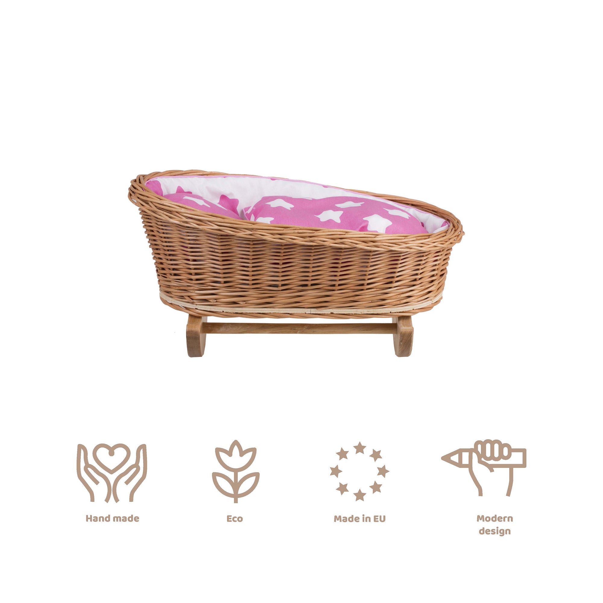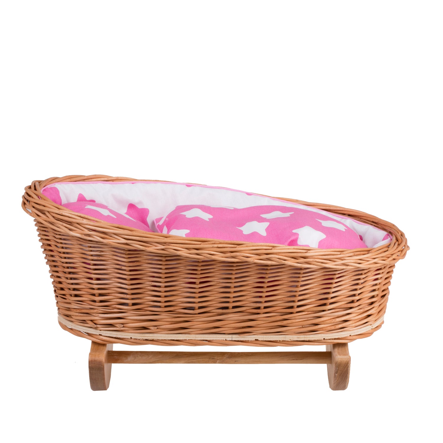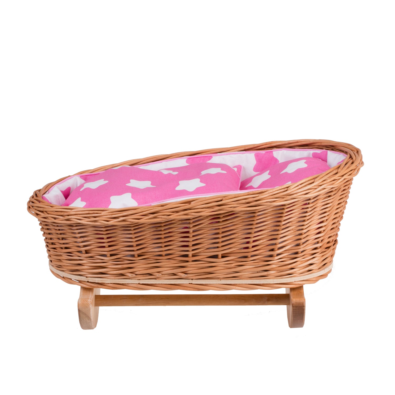 Mimi wiklinowa kołyska dla lalek z różowym obszyciem, poduszką i kołderką TheWickerStories