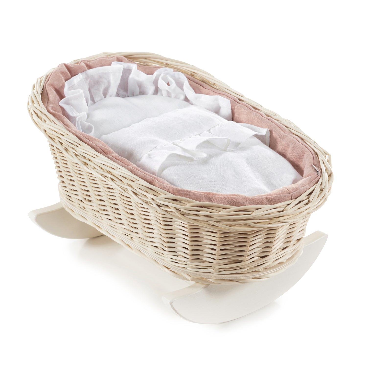 Mimi wiklinowa kołyska dla lalek z różowym obszyciem, z poduszką i kołderką TheWickerStories