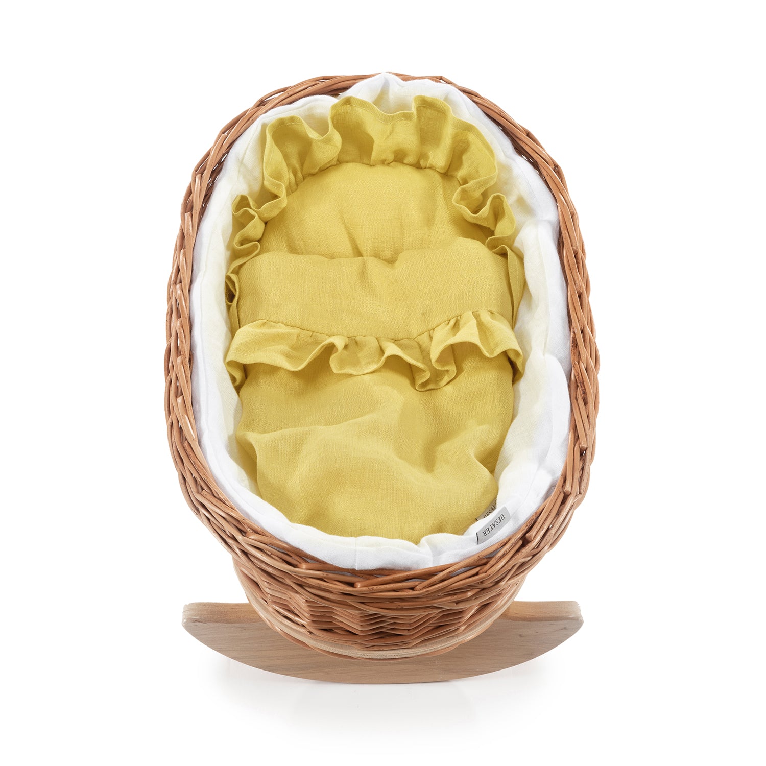 Ta wiklinowa kołyska dla lalek DESAYER zachwyca gęstym splotem i naturalnym wykończeniem. Brzeg zdobi elegancki warkocz, a wnętrze miękko otula lniane obszycie w żółtym kolorze z subtelną falbanką. Stabilne płozy z litego buku zapewniają płynne kołysanie. W komplecie są poduszka i pikowana kołderka. Delikatne marszczenia materiału dodają uroku klasycznemu rzemiosłu.