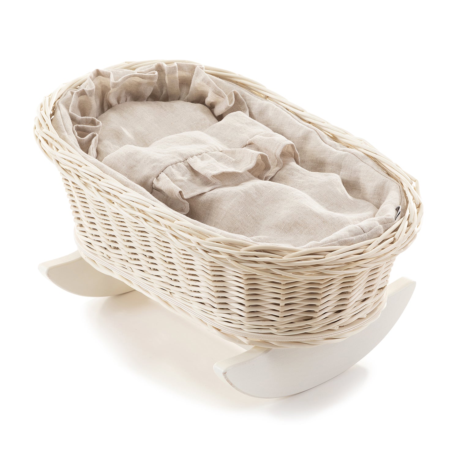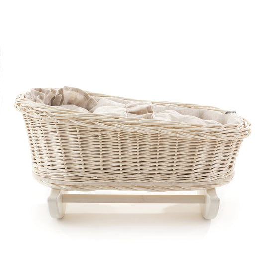 Mimi wiklinowy kosz-kołyska dla lalek z lnianym obszyciem, poduszką i kołderką, na bukowych płozach TheWickerStories