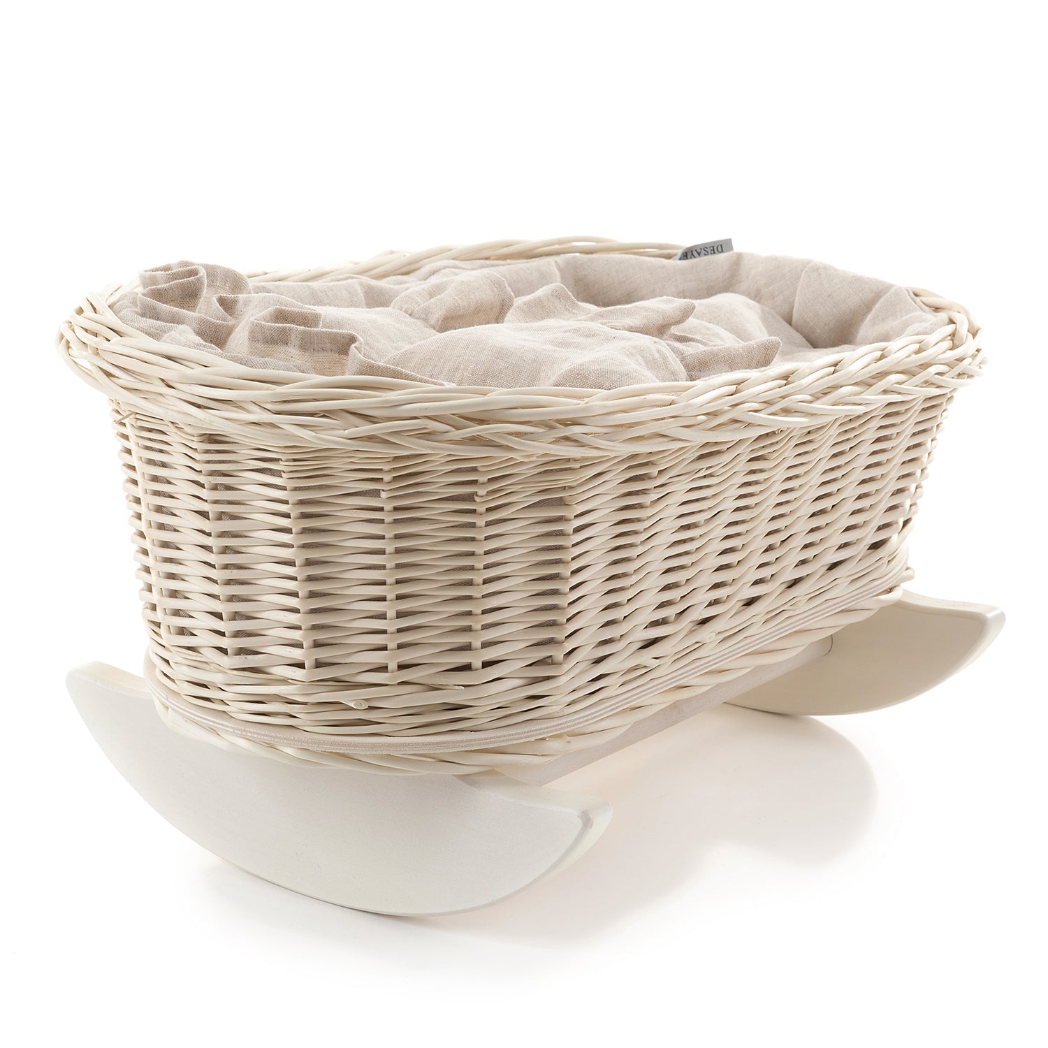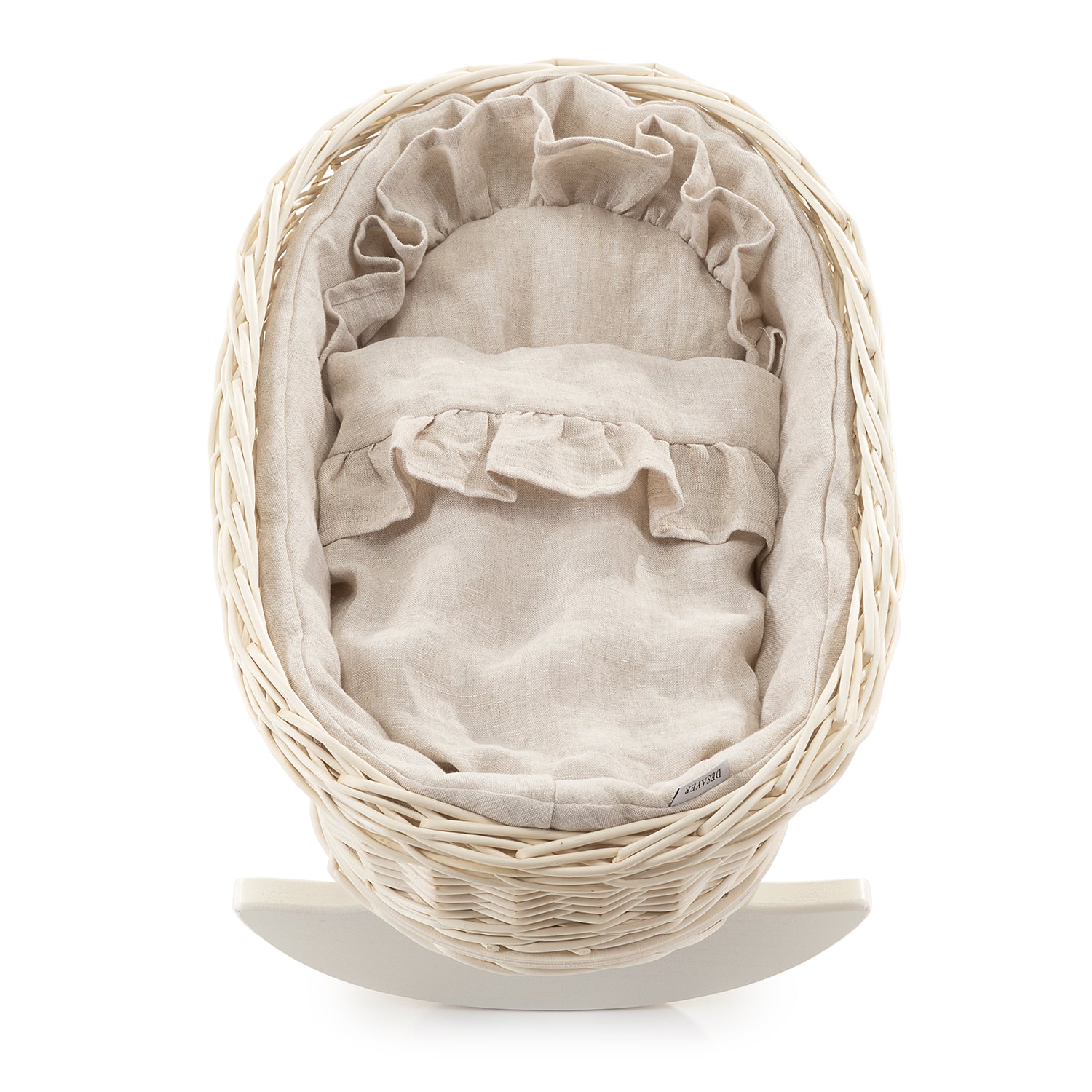 Specyfikacja Twojego Mimi wiklinowy kosz-kołyska dla lalek z lnianym obszyciem, poduszką i kołderką, na bukowych płozach TheWickerStories