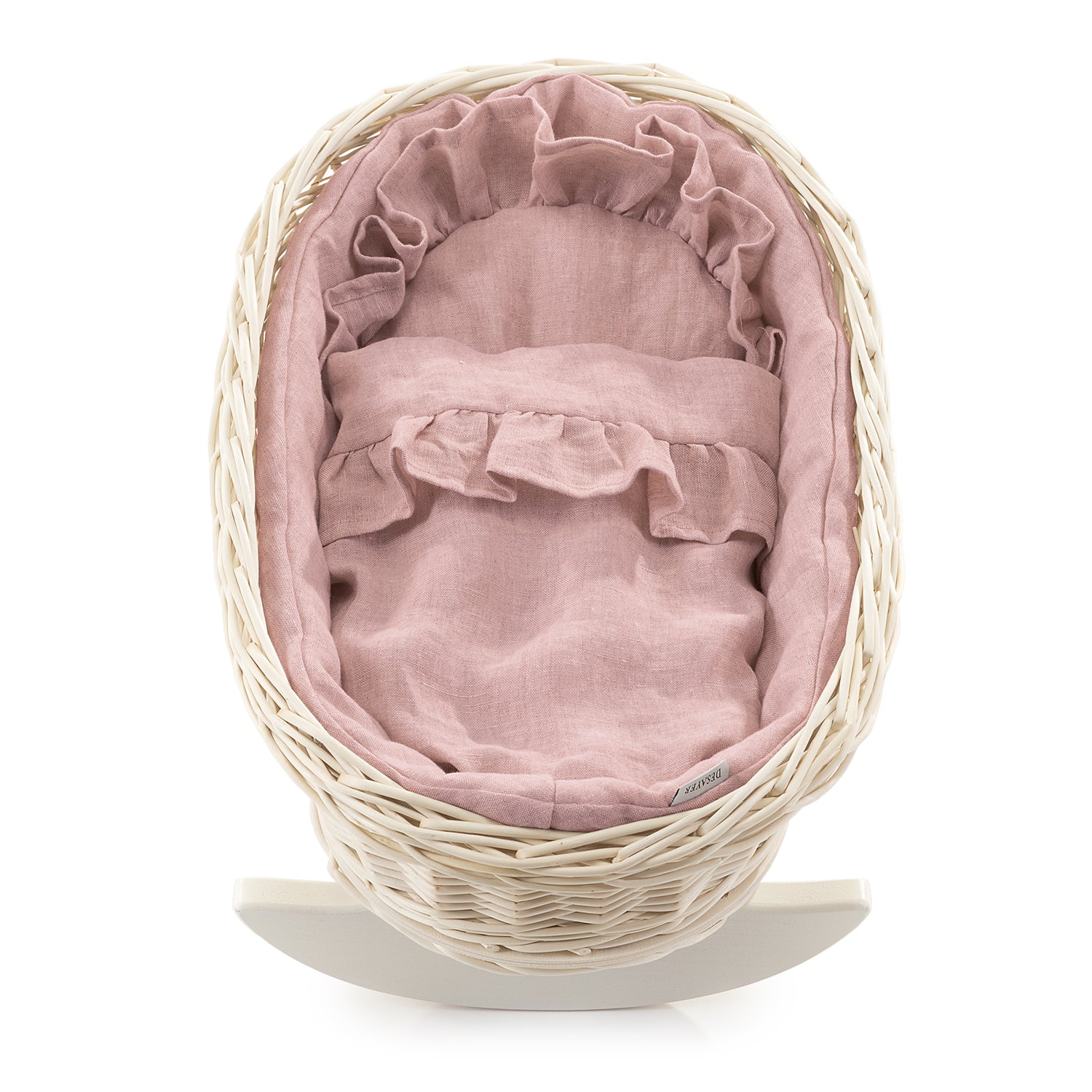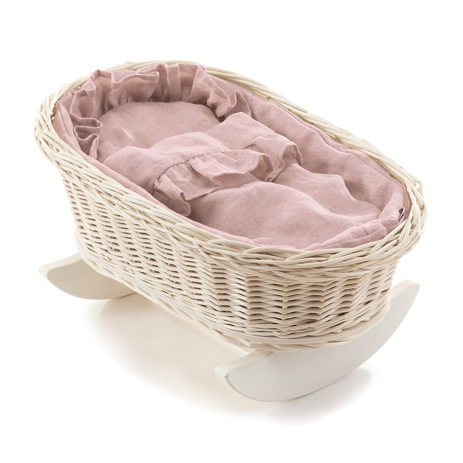 Mimi wiklinowy kosz-kołyska dla lalek z różowym obszyciem, z poduszką i kołderką TheWickerStories