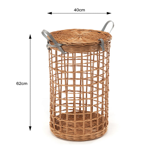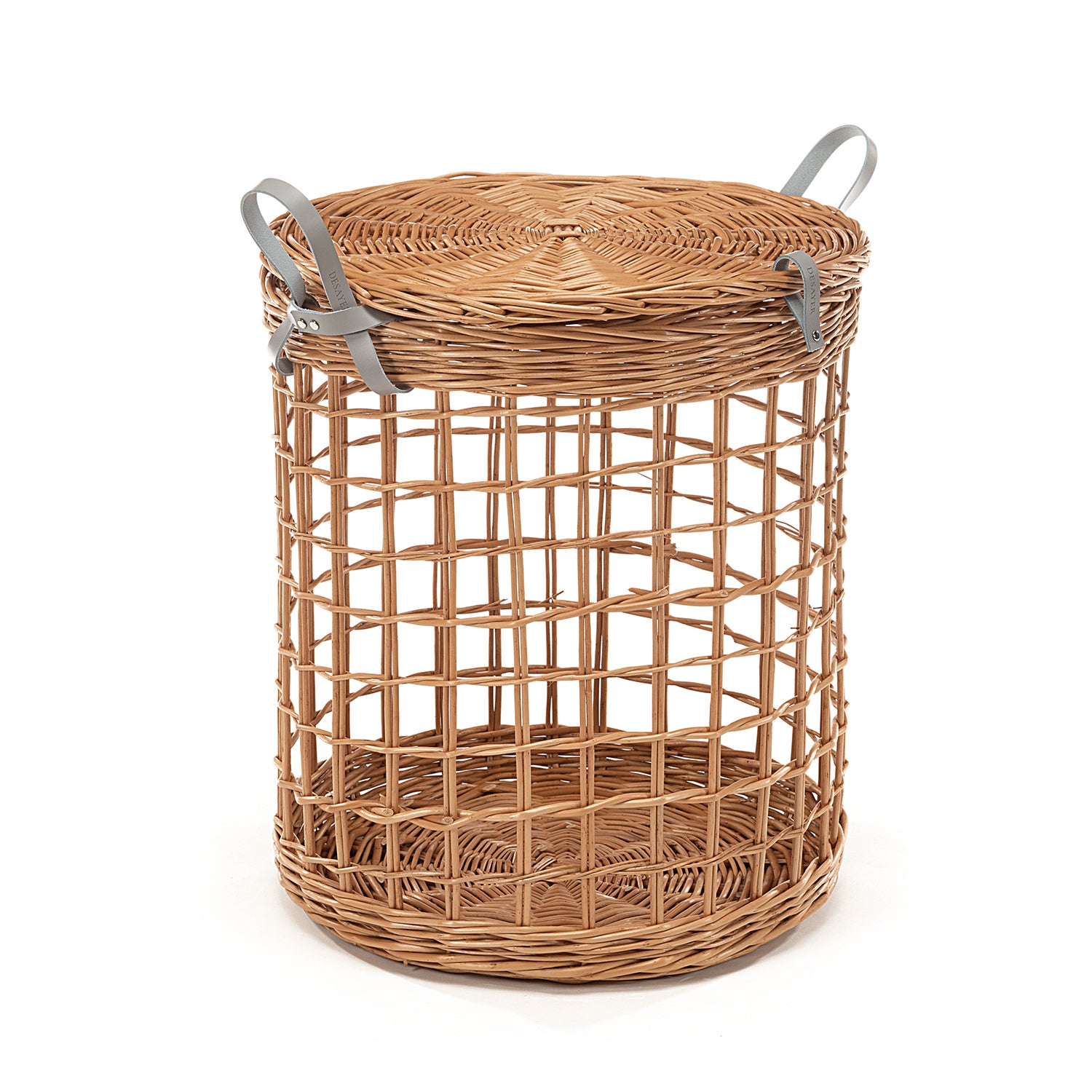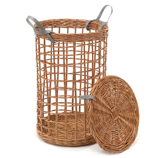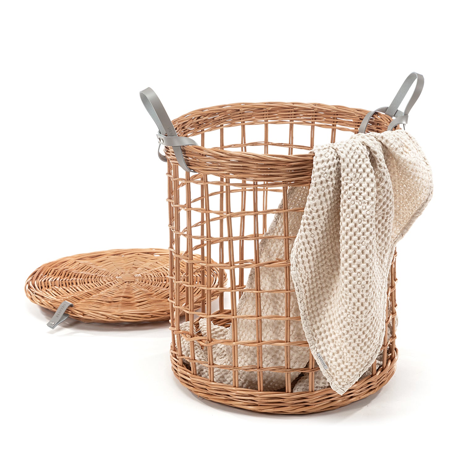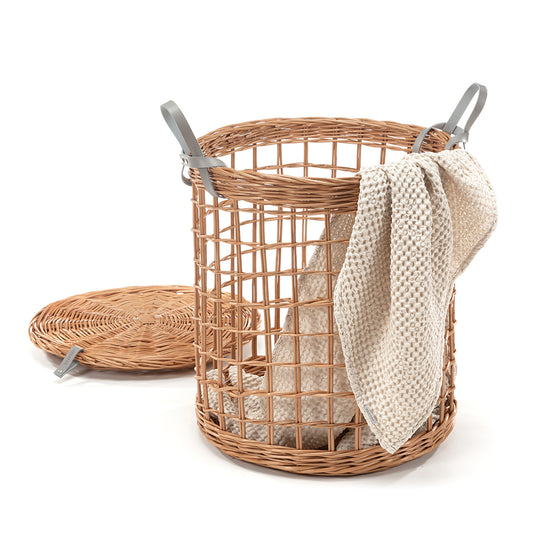 DESAYER to ażurowy wiklinowy kosz z pokrywą, łączący lekkość formy z solidnością. Cylindryczna bryła została wypleciona w przejrzystą siatkę, dzięki czemu wnętrze oddycha i pozostaje widoczne. Naturalny odcień wikliny ociepla przestrzeń, a stabilne, gęściej plecione dno oraz płaska, misternie skręcana pokrywa podkreślają rzemieślniczy charakter. Dwa srebrnoszare skórzane uchwyty dodają elegancji i wygody.