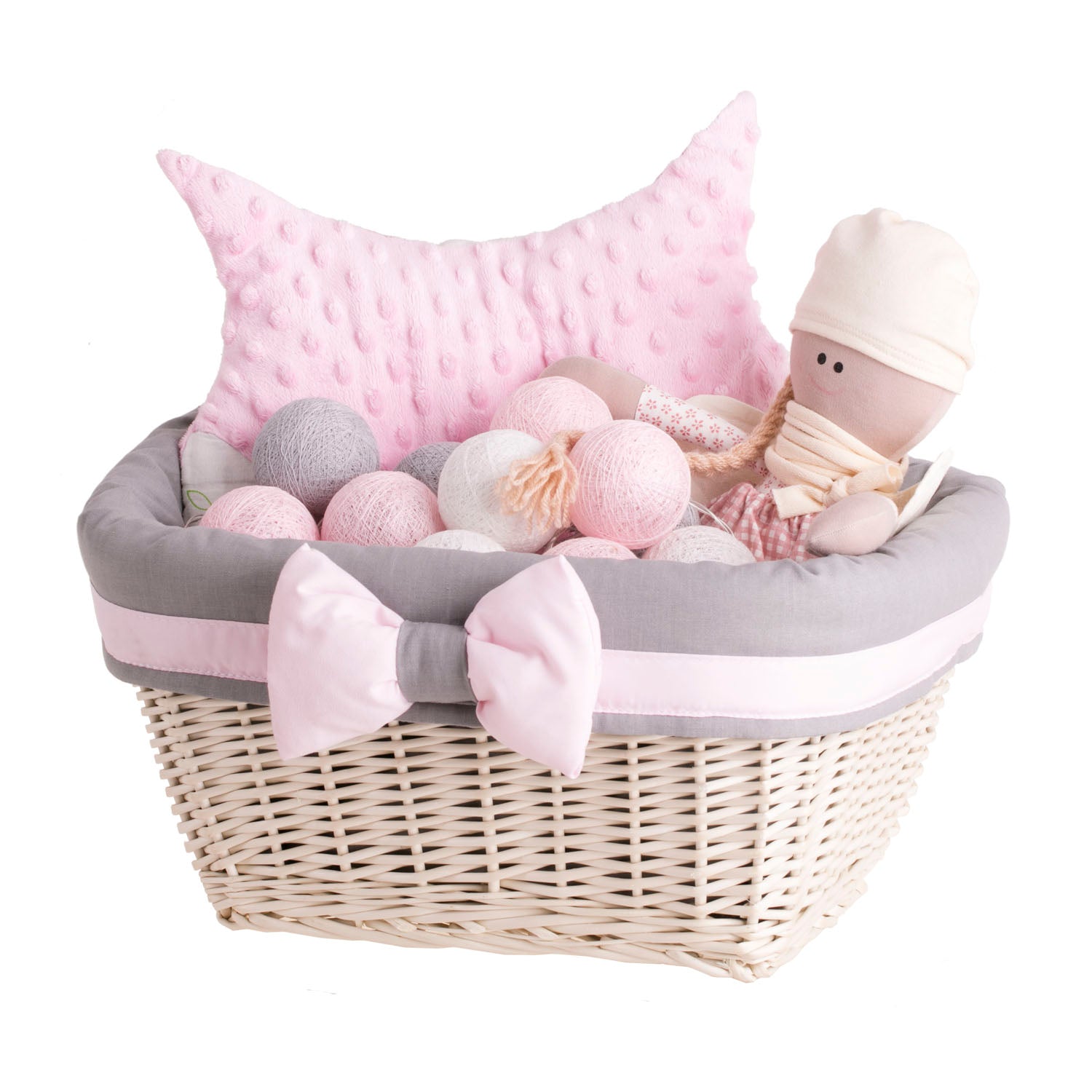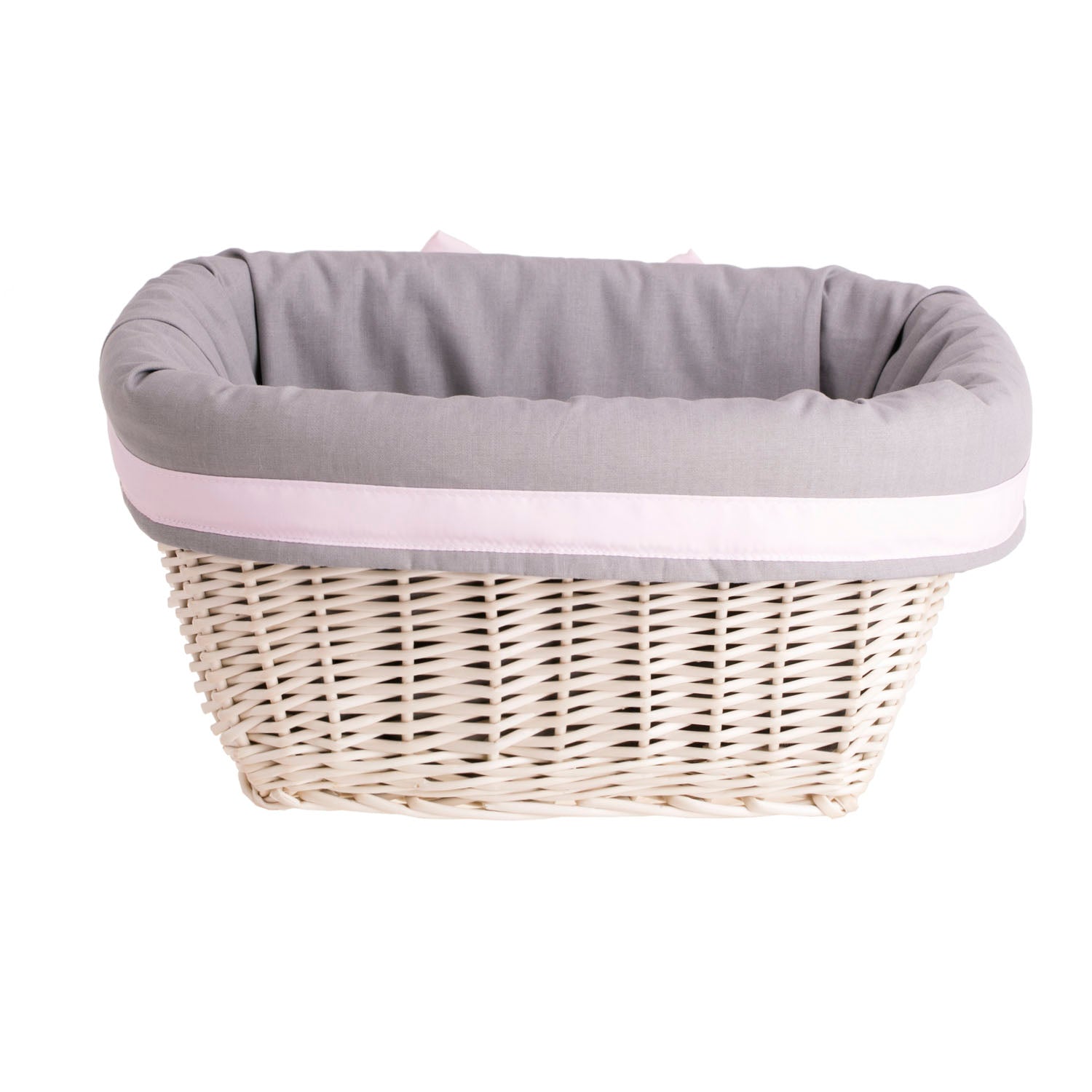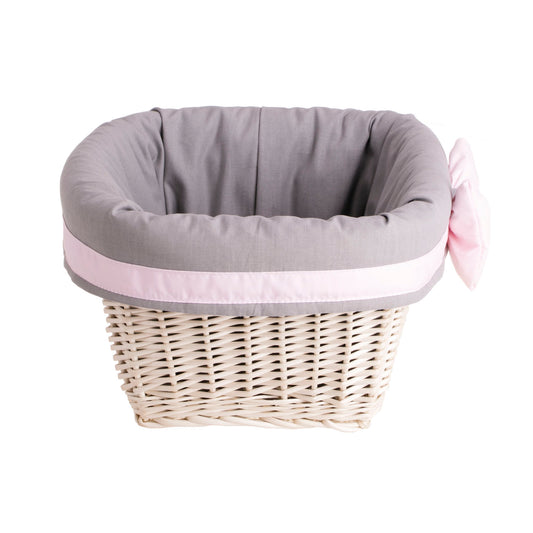 Nestor wiklinowy kosz na regał z szarym obszyciem i kokardą TheWickerStories