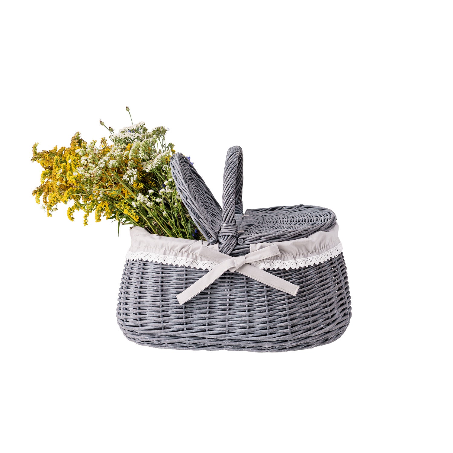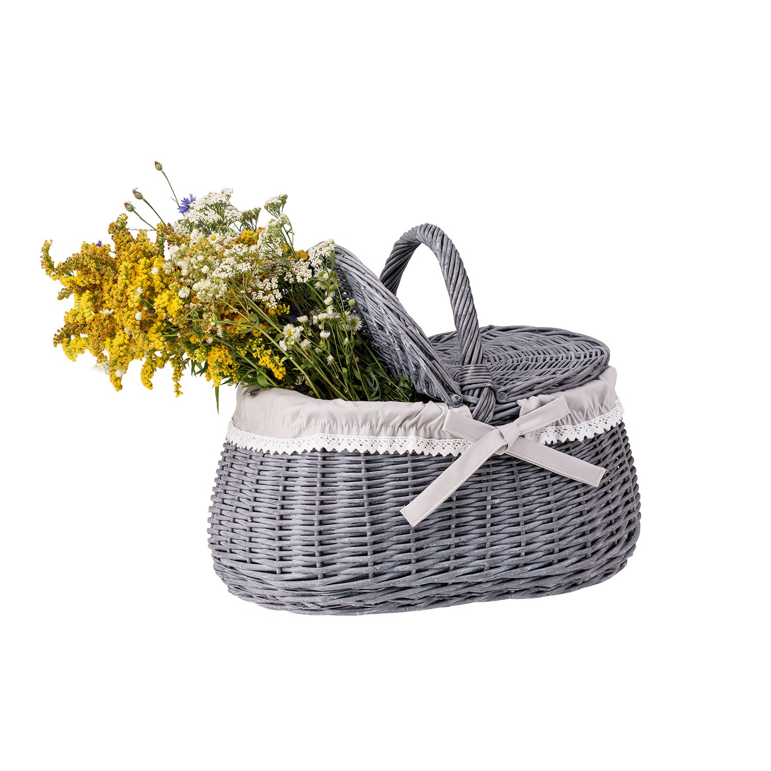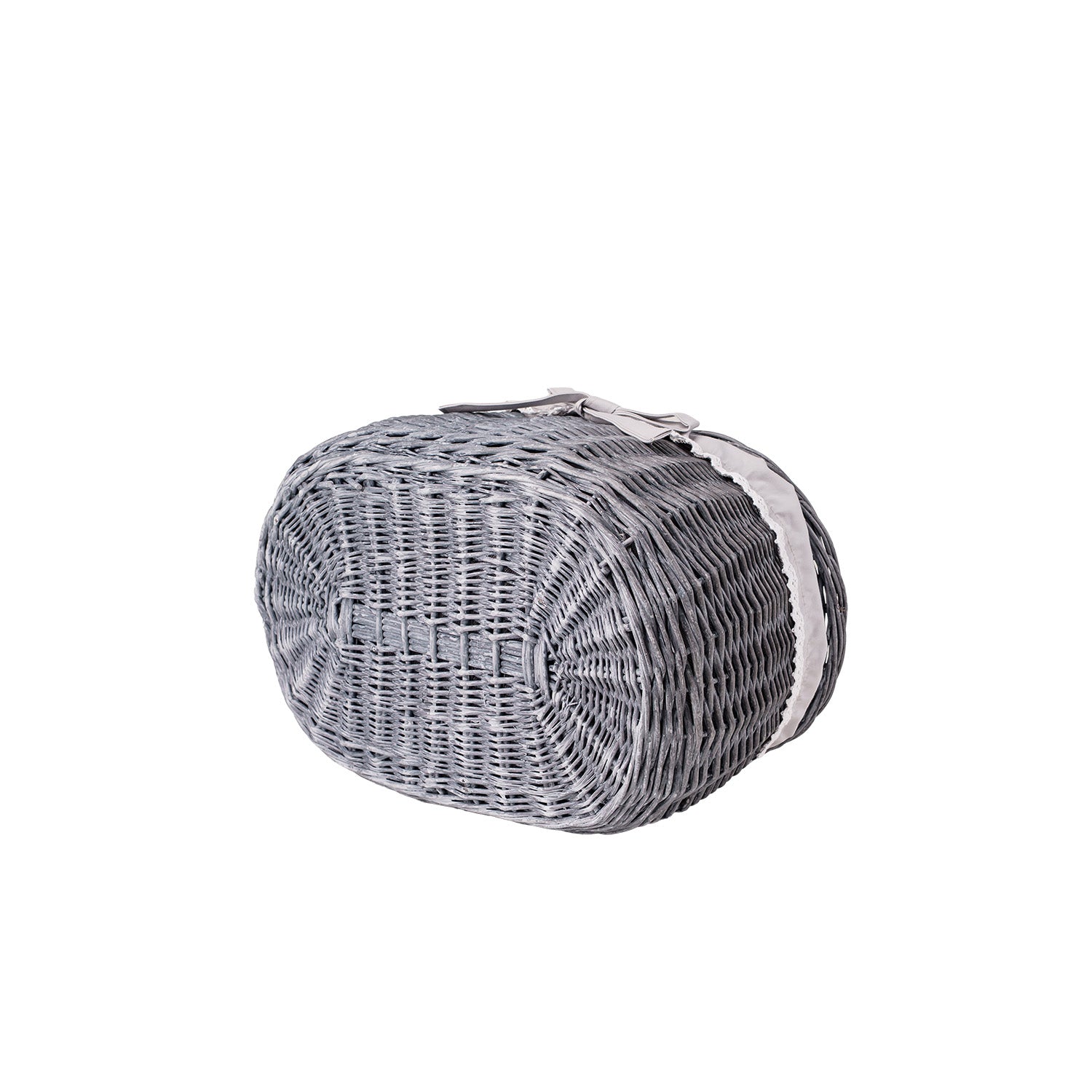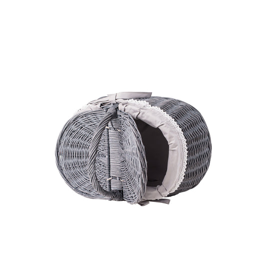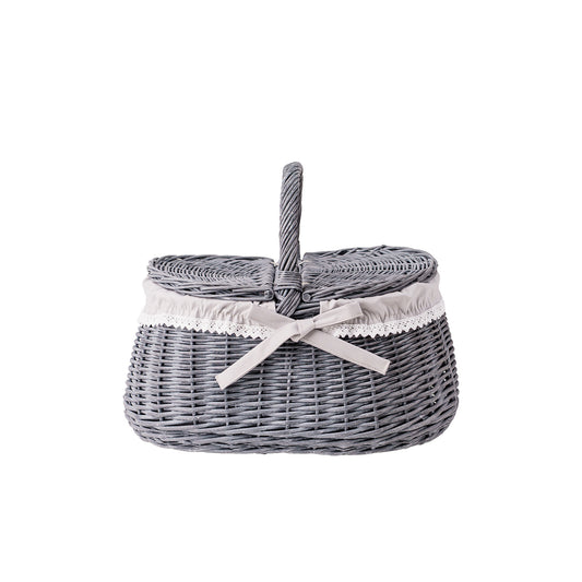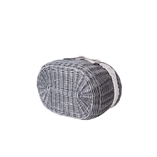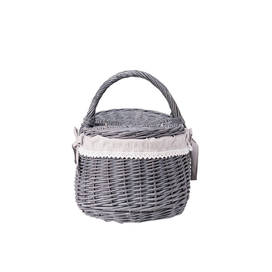 Owalny kosz piknikowy z szarej wikliny ma spokojną, elegancką formę i dopracowane detale. Gęsty splot i równo prowadzone pręty tworzą stabilną konstrukcję, która dobrze trzyma kształt. Wnętrze wykończono beżowym materiałowym obszyciem, estetycznie zawiniętym na brzegu. Na górze znajduje się praktyczna pokrywa oraz wygodna rączka do przenoszenia zapewniająca pewny chwyt. Obszycie jest zdejmowane i nadaje się do prania w pralce w 30°C.