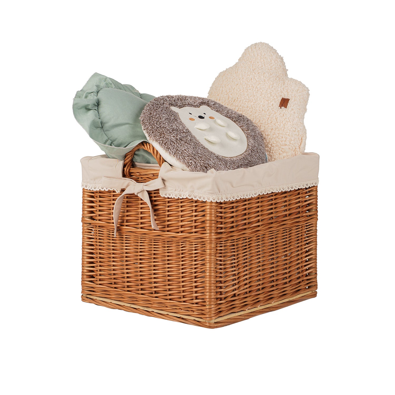 Wnętrze kosza wyłożone jest zdejmowanym obszyciem z miękkiej bawełny w beżowym kolorze, wykończonym koronką i ozdobionym kokardkami. To elegancki detal, który dodaje całości przytulnego charakteru. Bawełniane obszycie można łatwo zdjąć i wyprać w pralce w temperaturze 30 stopni, co ułatwia utrzymanie świeżości i czystości przez długi czas.