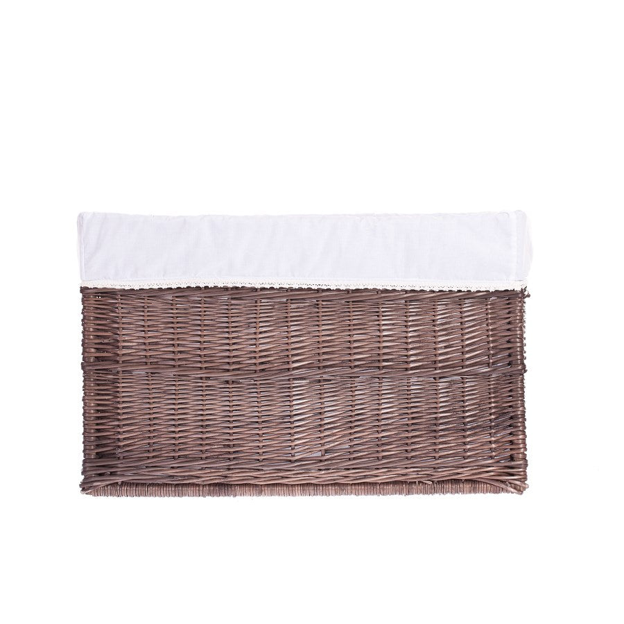 Zestaw trzech koszy do regału z ciemnej wikliny łączy elegancję i funkcjonalność. Każdy kosz ma prostokątną formę, równy, gęsty splot oraz starannie wygładzone ranty dla większego komfortu. Górną krawędź wykańcza białe, wyjmowane obszycie z delikatną koronką. Obszycie jest zdejmowane i nadaje się do prania w pralce w 30°C.