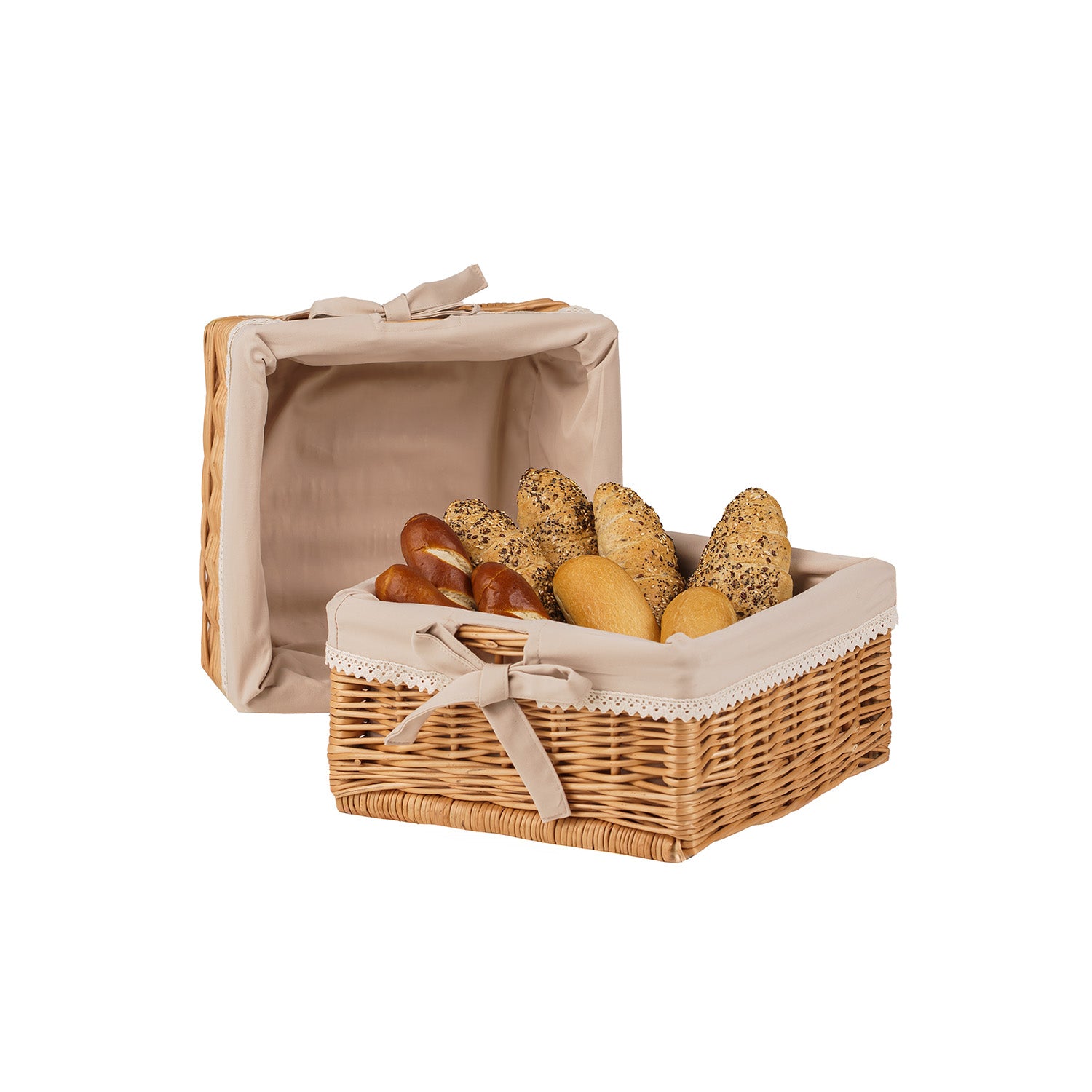 Koszyk został wyłożony zdejmowanym obszyciem z bawełny w beżowym kolorze, które można prać w pralce w 30°C. Dzięki temu zachowuje świeżość i czystość nawet przy intensywnym codziennym użytkowaniu. Z przodu znajduje się dekoracyjna kokardka, która maskuje otwór służący jako praktyczny uchwyt – funkcjonalność i ozdoba w jednym.