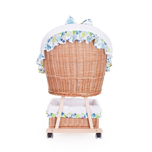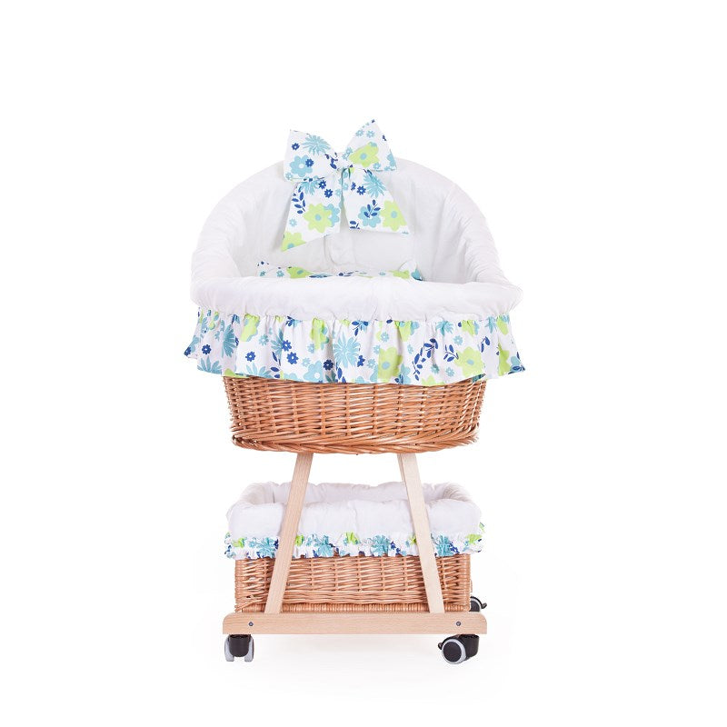 Specyfikacja Twojego Papilio wiklinowy wózek dla niemowląt z białym obszyciem, kołderką i poduszką, na kółkach z dolnym koszem TheWickerStories