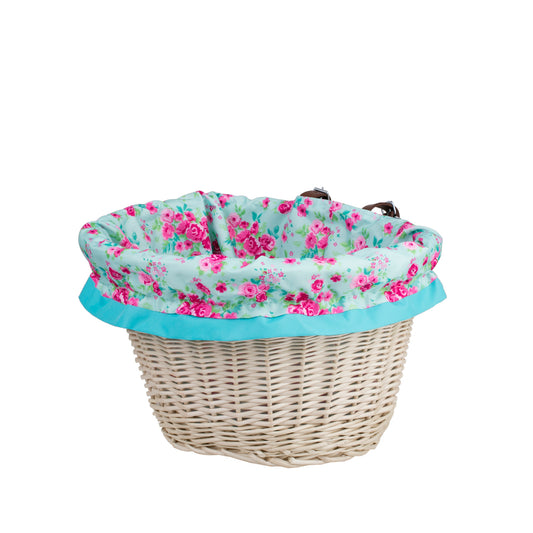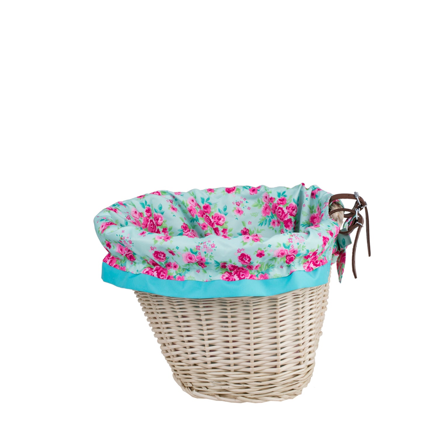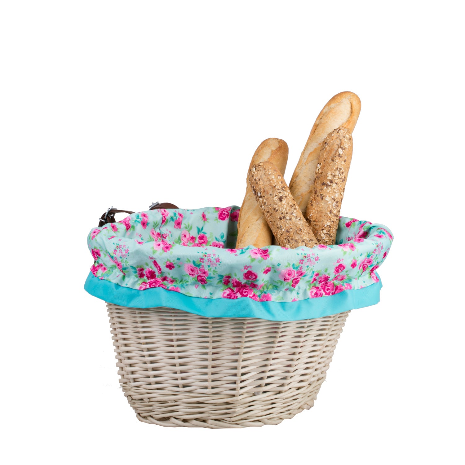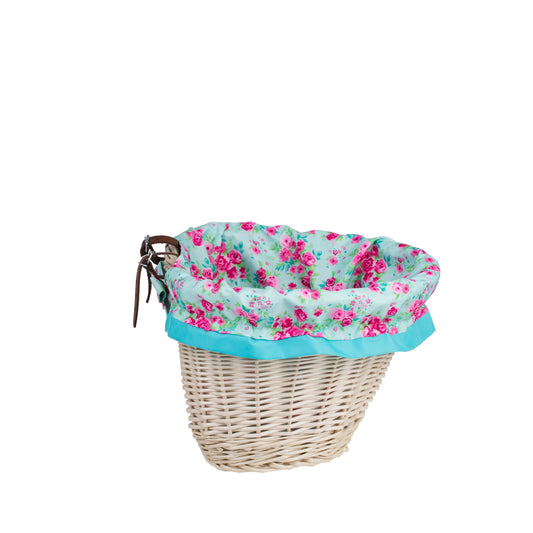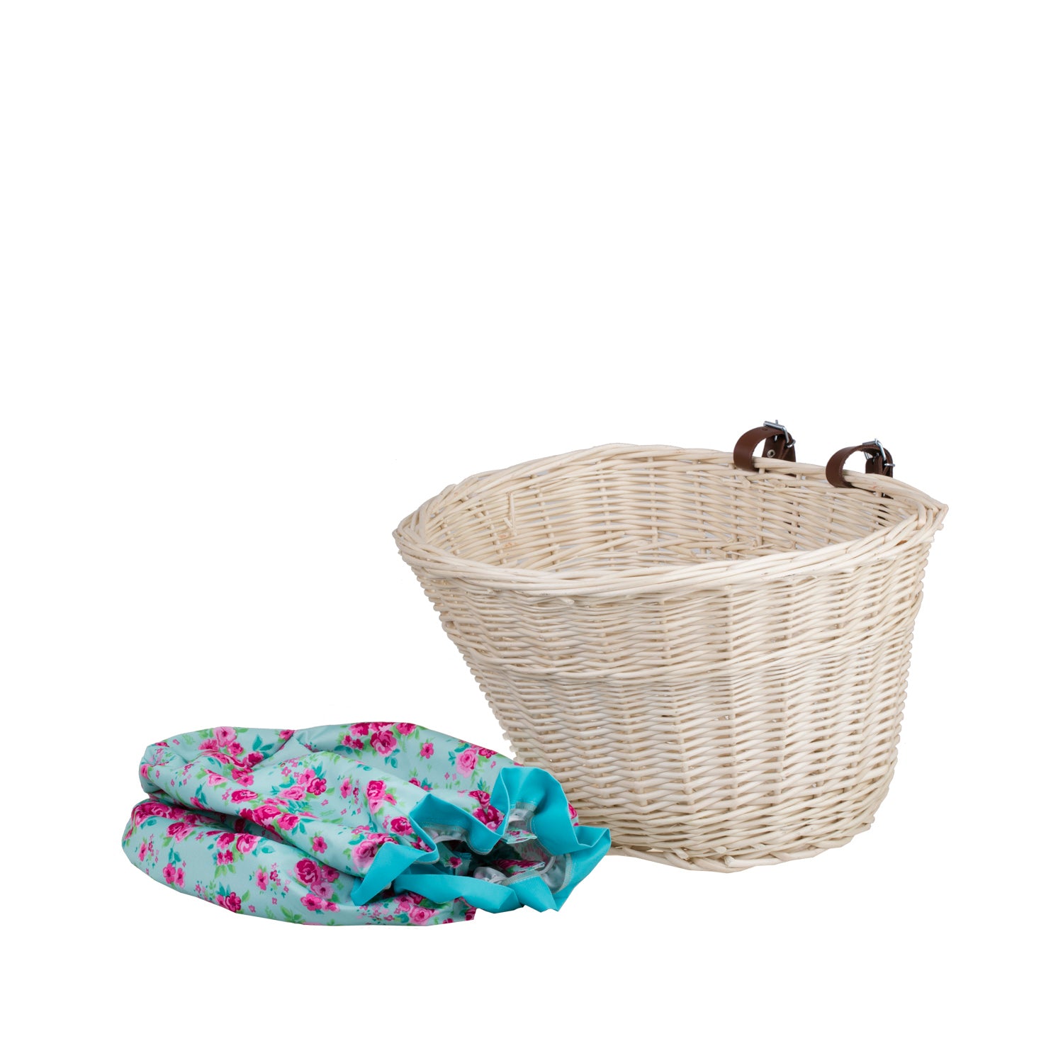Elegancki wiklinowy kosz na rower w kremowym odcieniu zachwyca dopracowanym, gęstym splotem i łagodnie wykończoną krawędzią. Wnętrze zdobi miękkie, turkusowe obszycie z bawełny, które chroni przewożone drobiazgi. Z przodu roweru mocuje się go dwoma skórzanymi paskami z klamrami, co daje styl retro i pewne trzymanie.